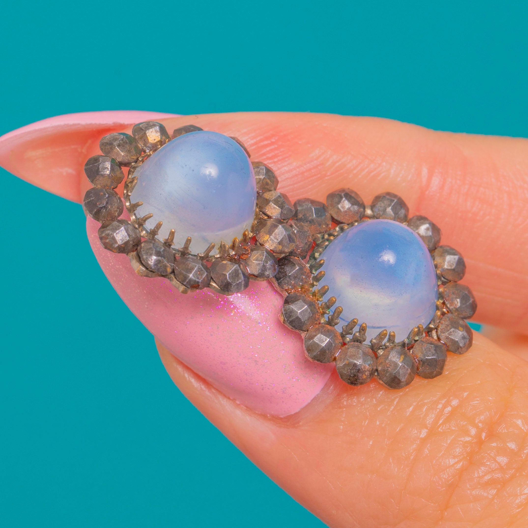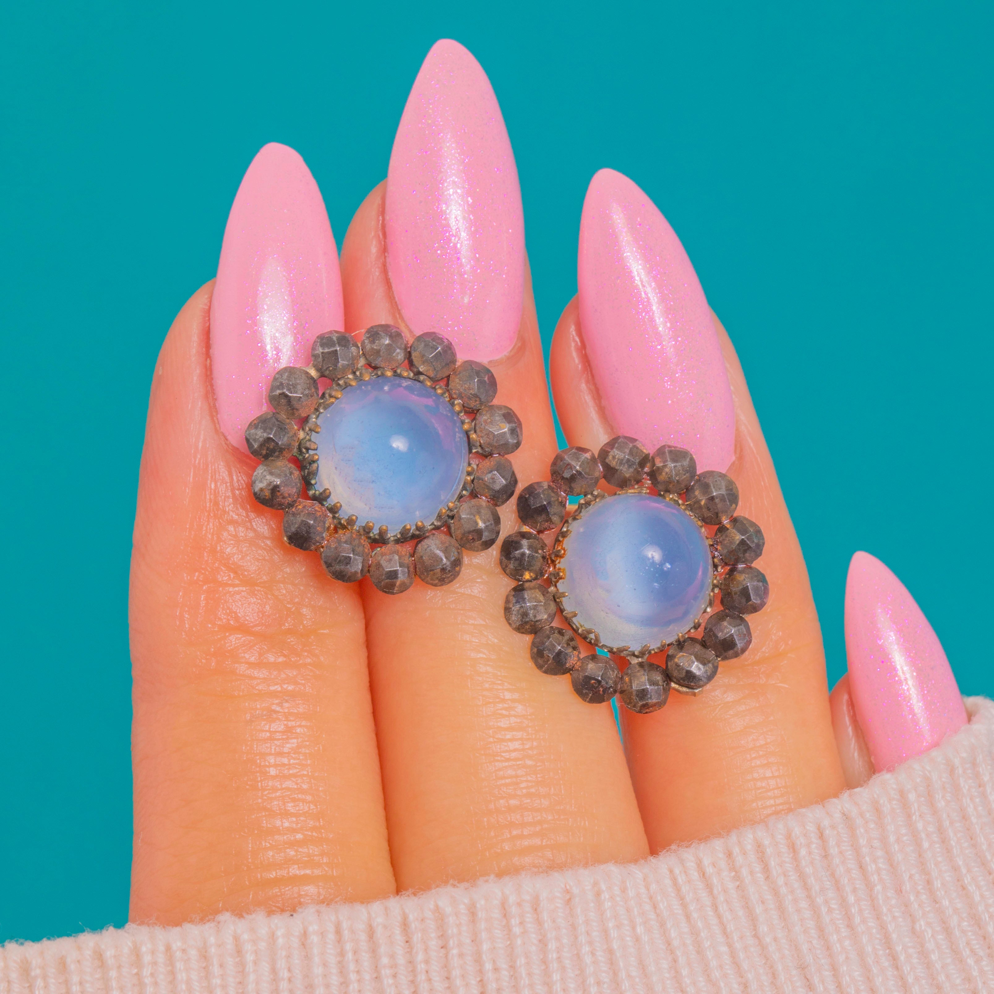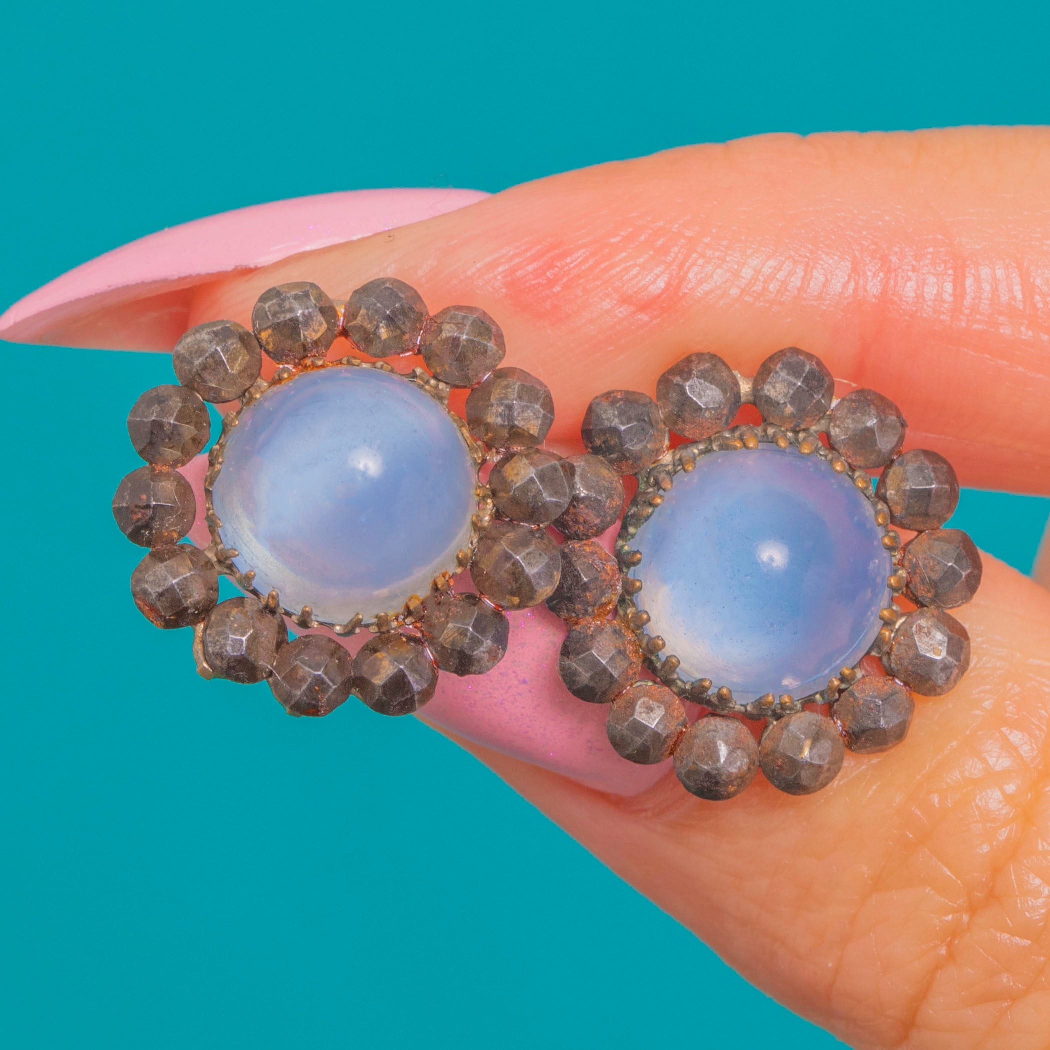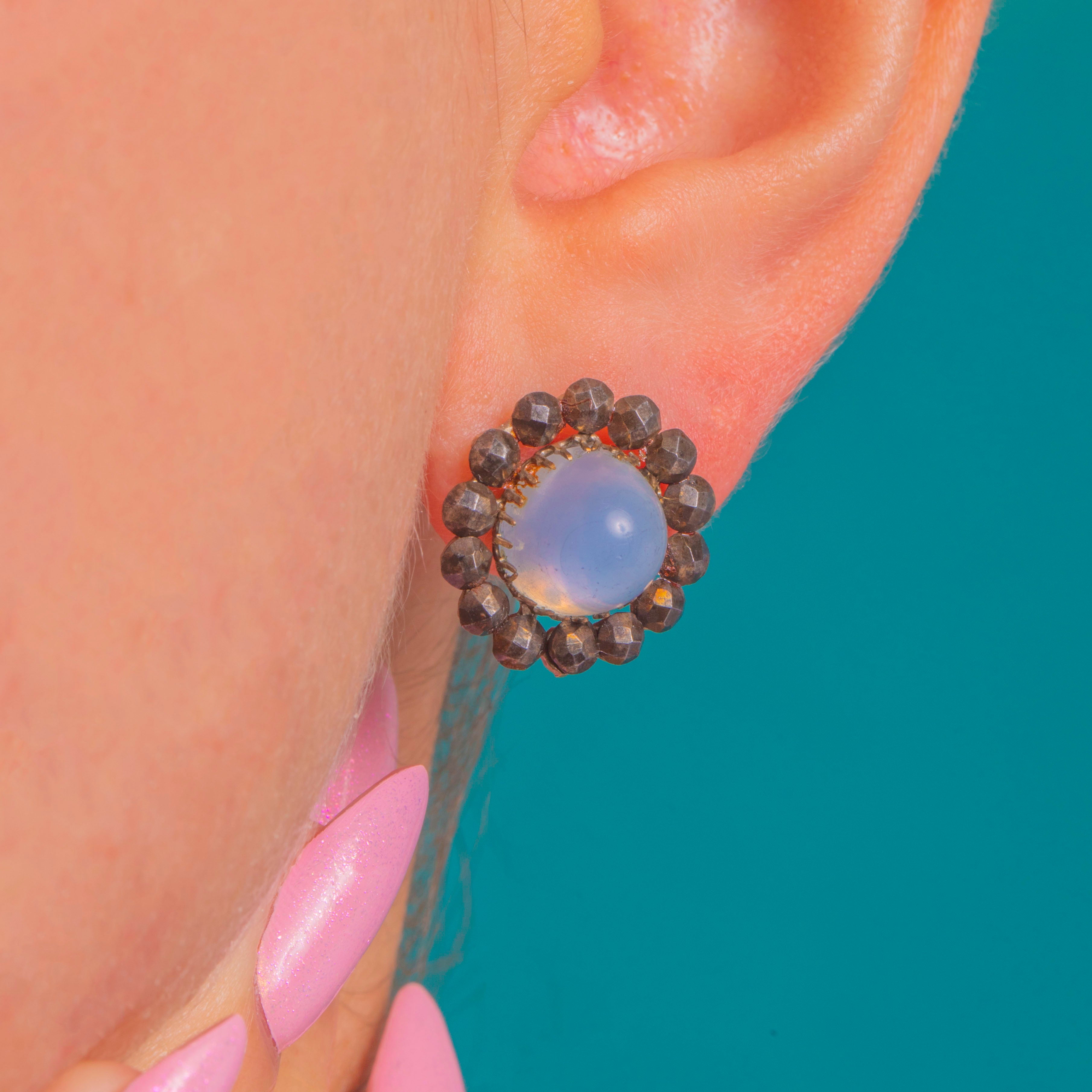 VERY GOOD: The Blue Chalcedony cabochons are smooth and luminous, with a natural inclusion visible in one stone. The Cut Steel halos show light, even facet wear and gentle patina commensurate with age; all settings are secure with no missing elements. Posts and scrolls are in good order.