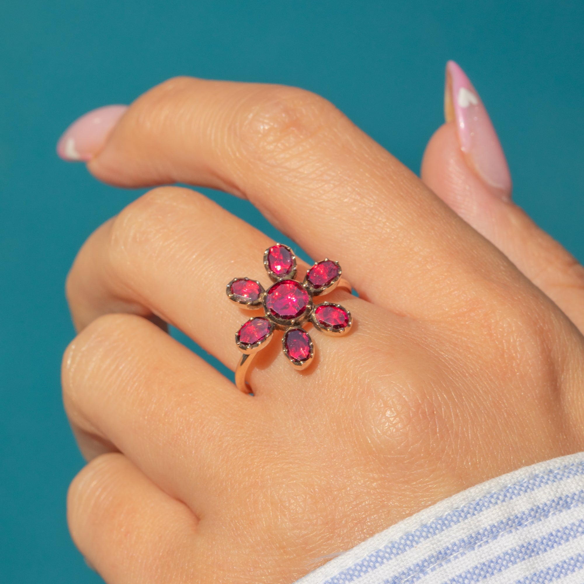 Crafted circa 1800, this beautiful Georgian ring has been formed into a charming flower, set throughout with deep crimson flat-cut Garnets in closed-back foiled settings that radiate fire and light. The central Garnet is surrounded by six petal-shaped stones forming a striking and perfectly balanced floral motif.