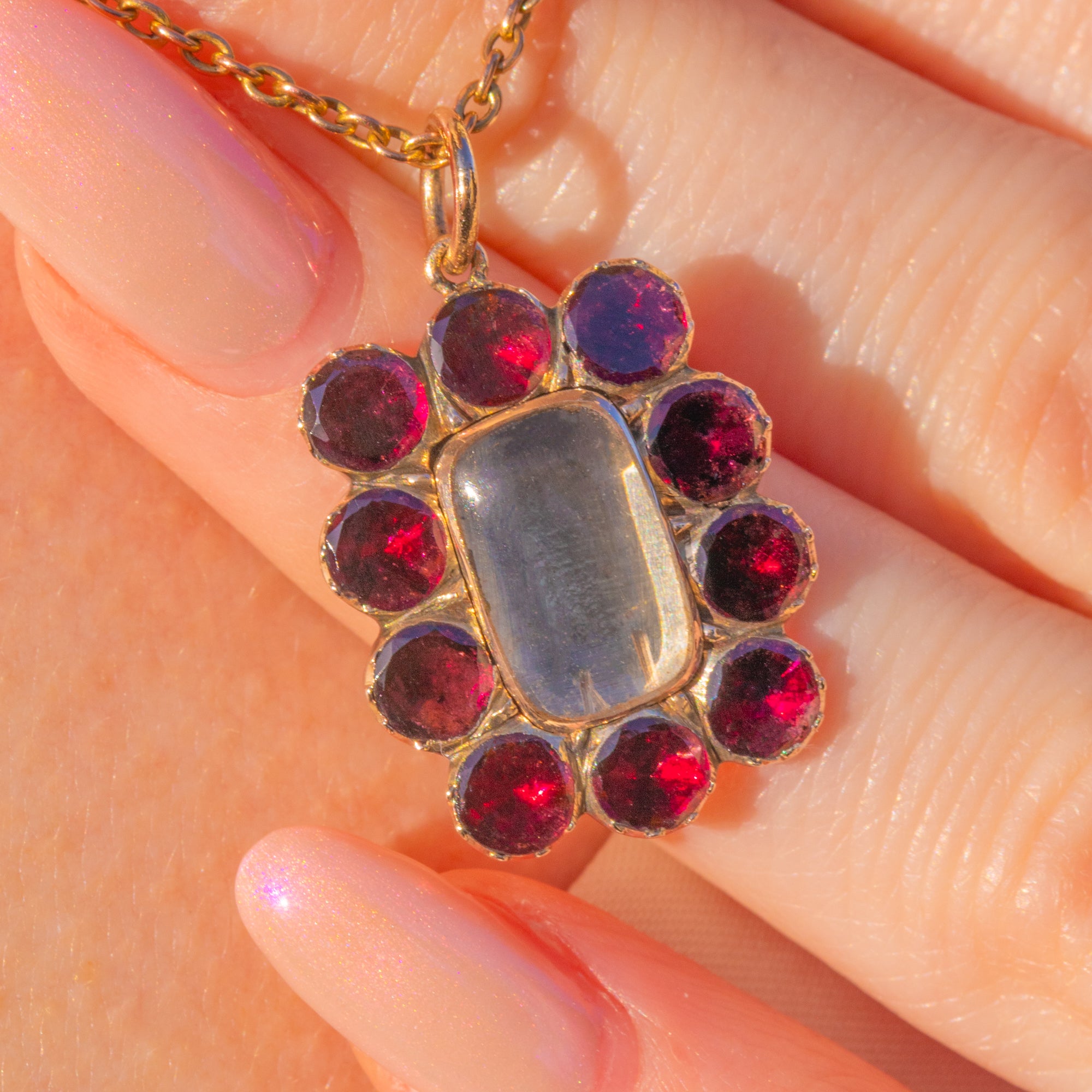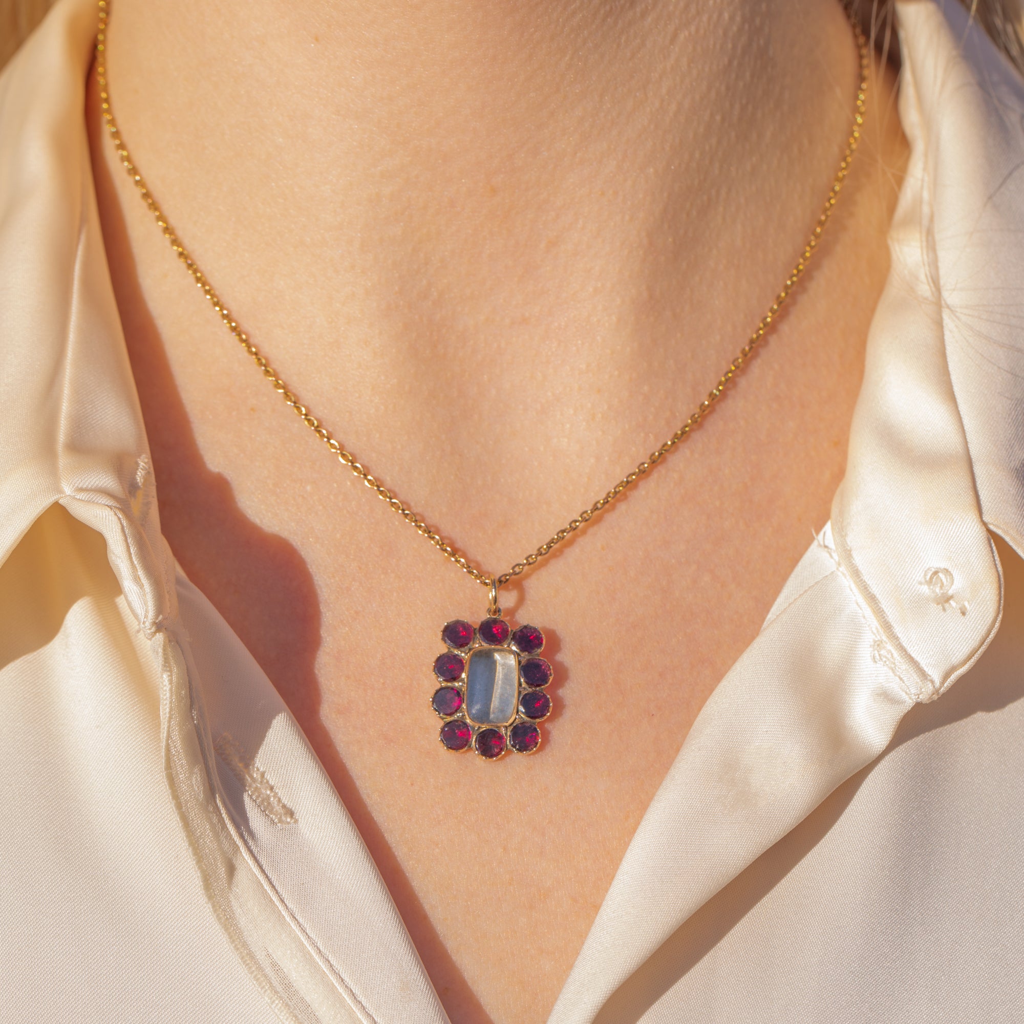This Georgian 9ct Gold flat-cut Garnet pendant is an eye-catching piece! Crafted from solid 9ct Gold, this pendant is shaped into an elegant rectangular design with a central domed glass panel. What a dream!