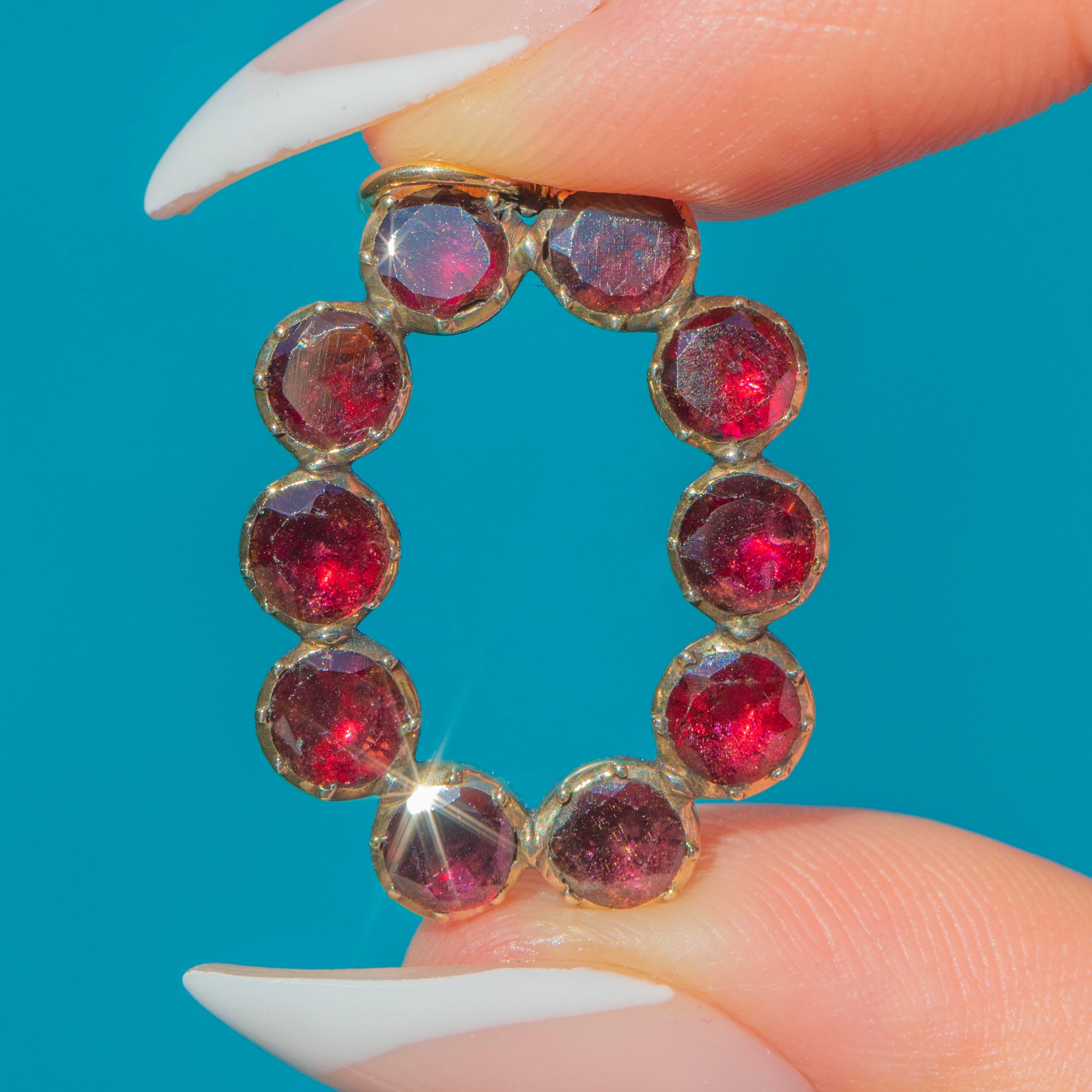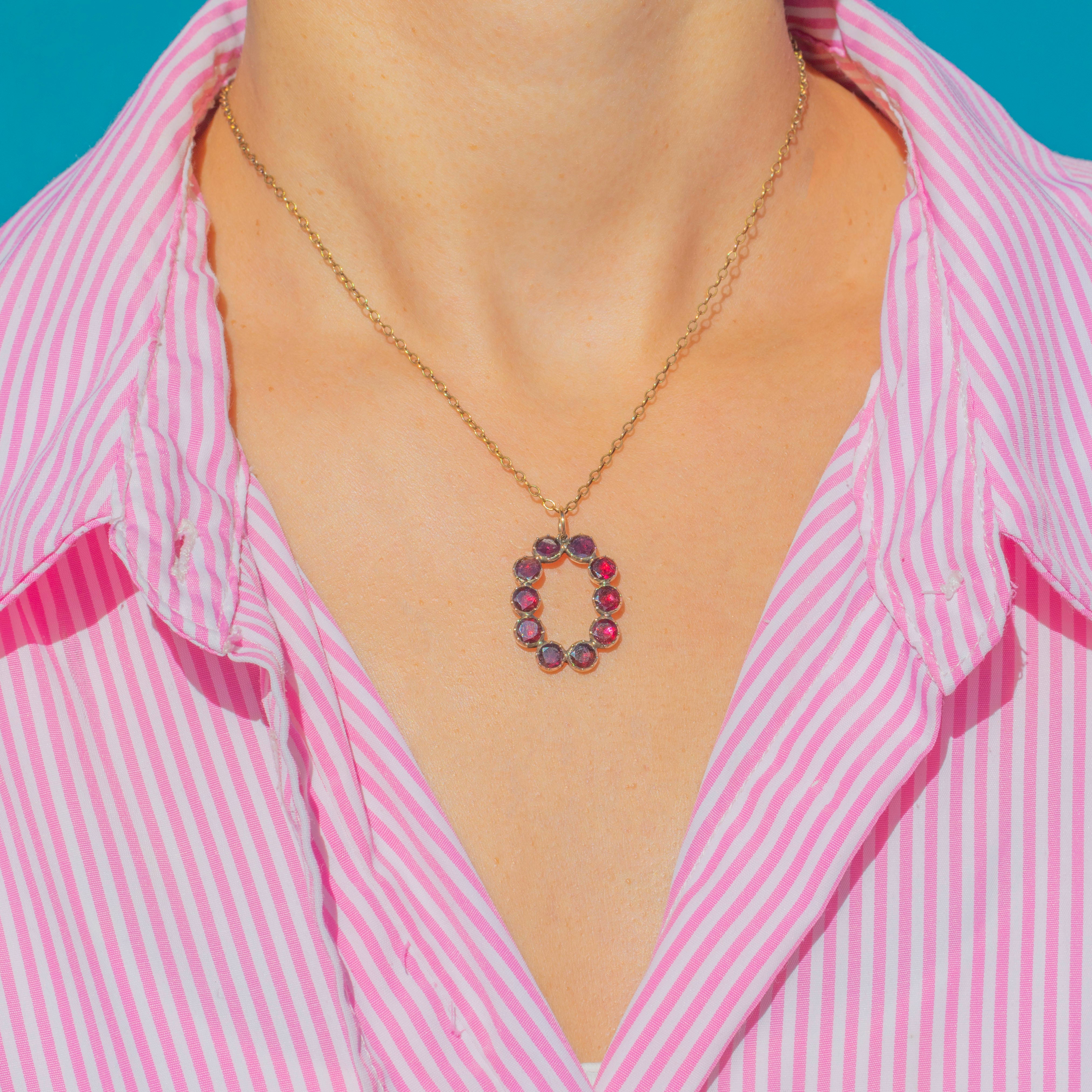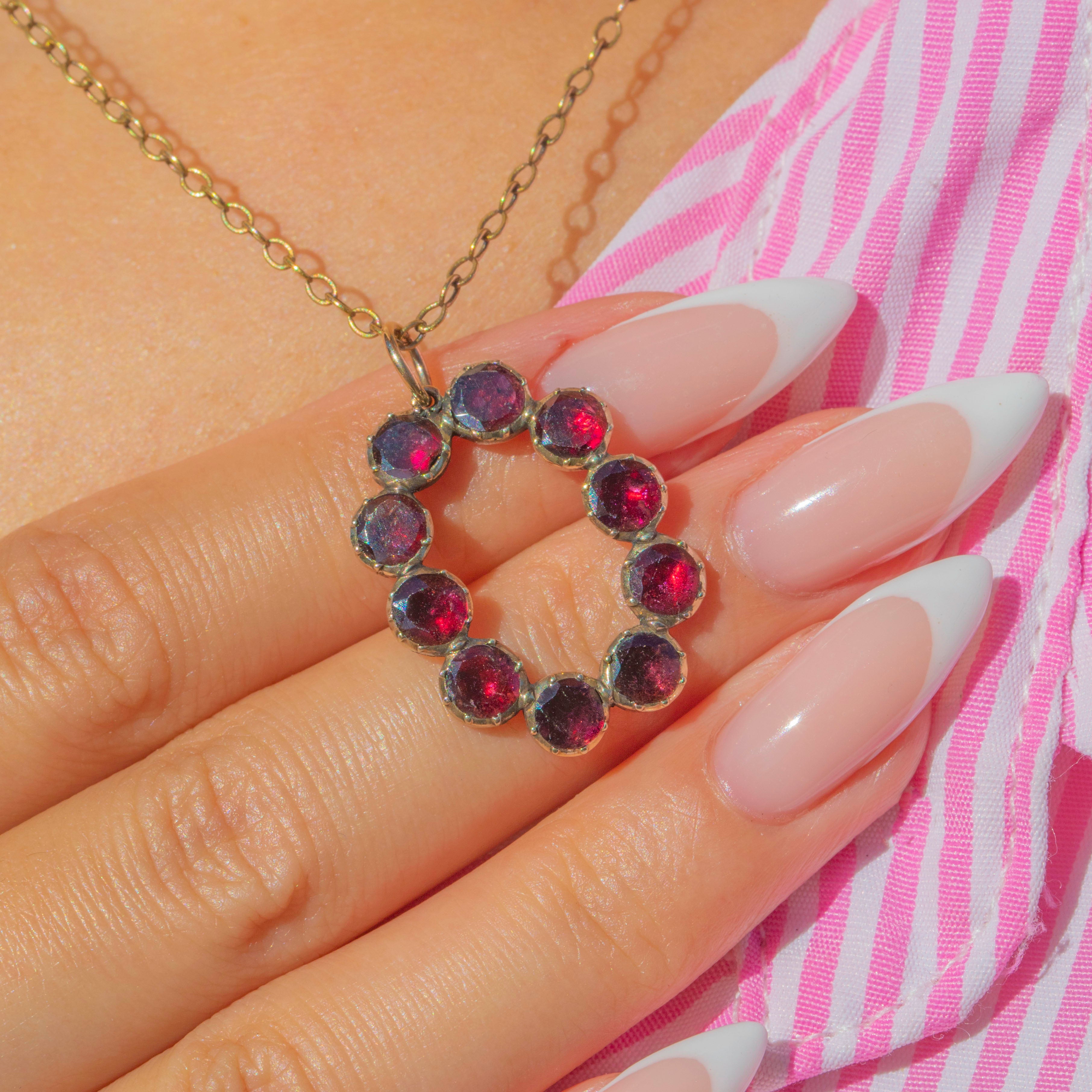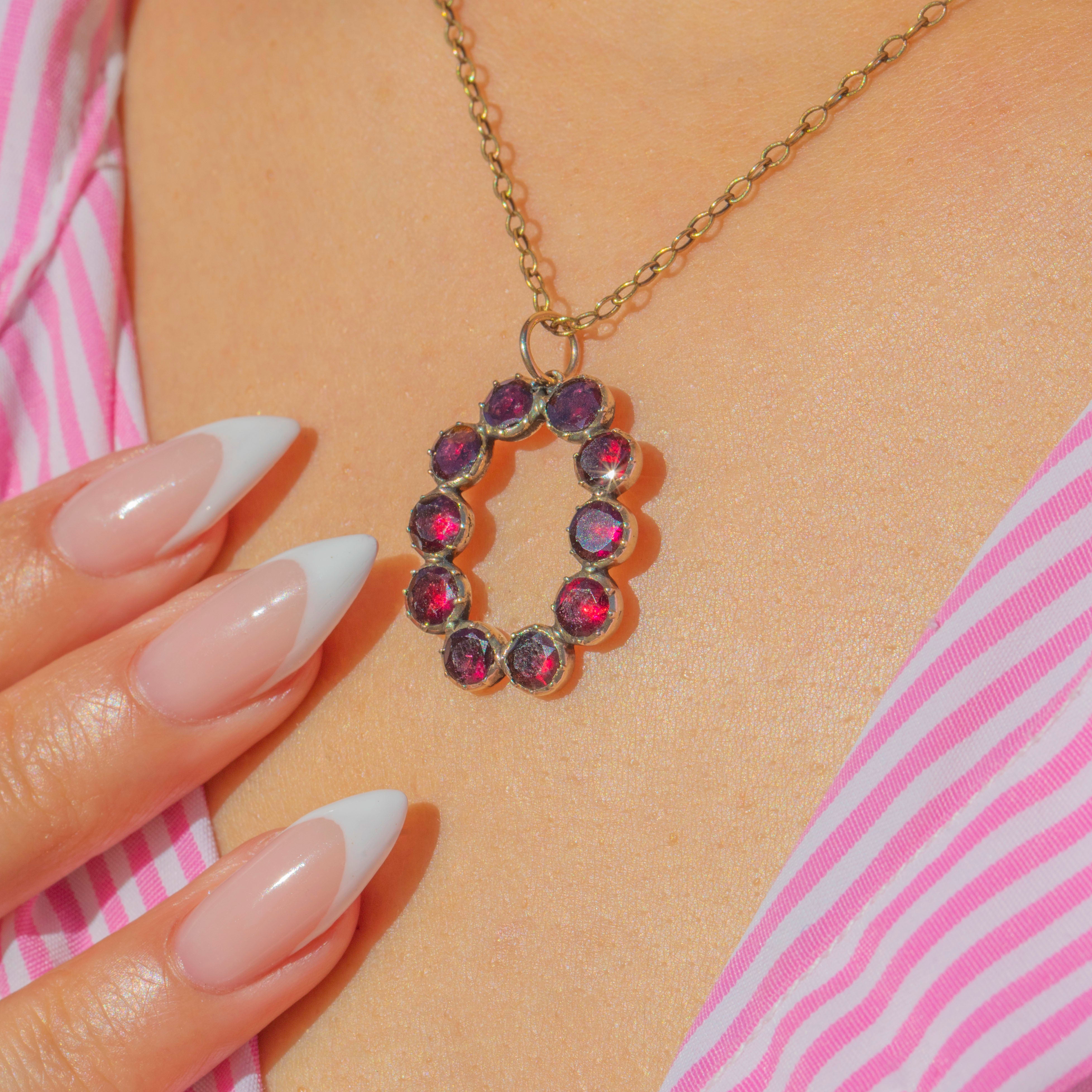 This exquisite Georgian pendant is set with glowing Flat-Cut Garnets, their rich claret tones radiating warmth and elegance. The Garnets are arranged in an open oval design, a light and airy formation that allows each stone to shine in harmony with the next.