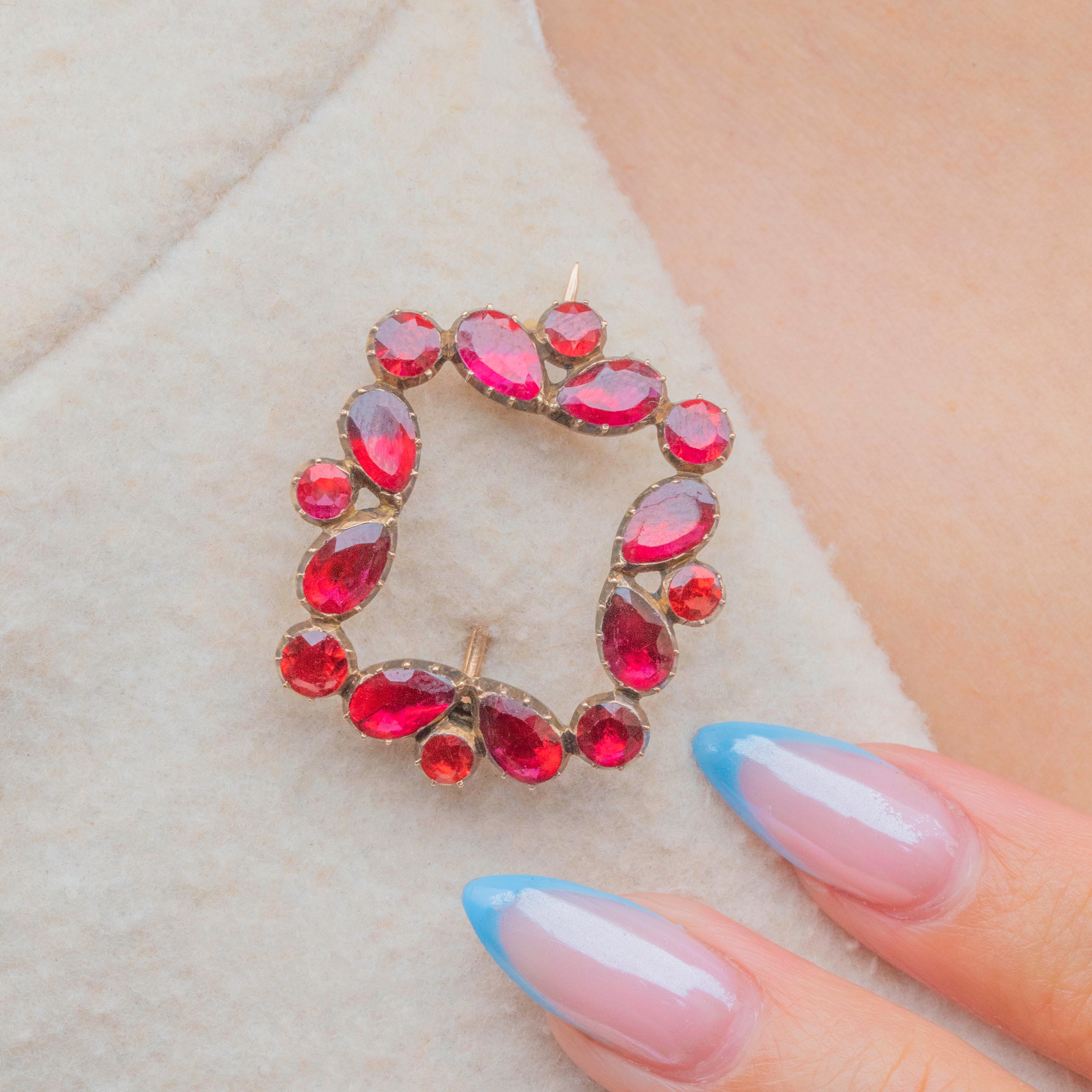 This Georgian Garnet brooch perfectly captures the romantic designs of early 19th-century jewellery! Each delicious flat-cut Garnet is displayed within classically Georgian piecrust settings, crafted from solid 9ct Gold for a luxurious finish.