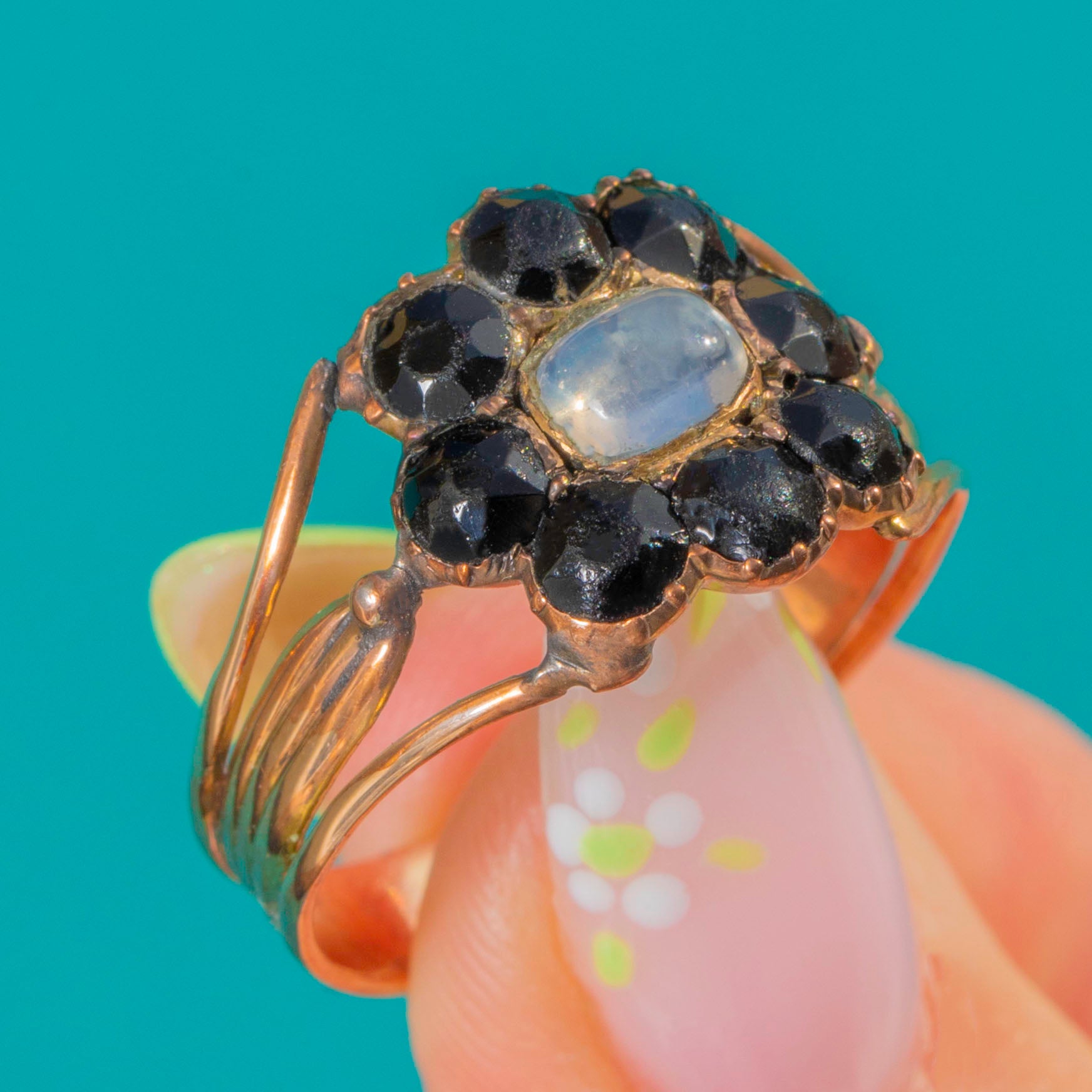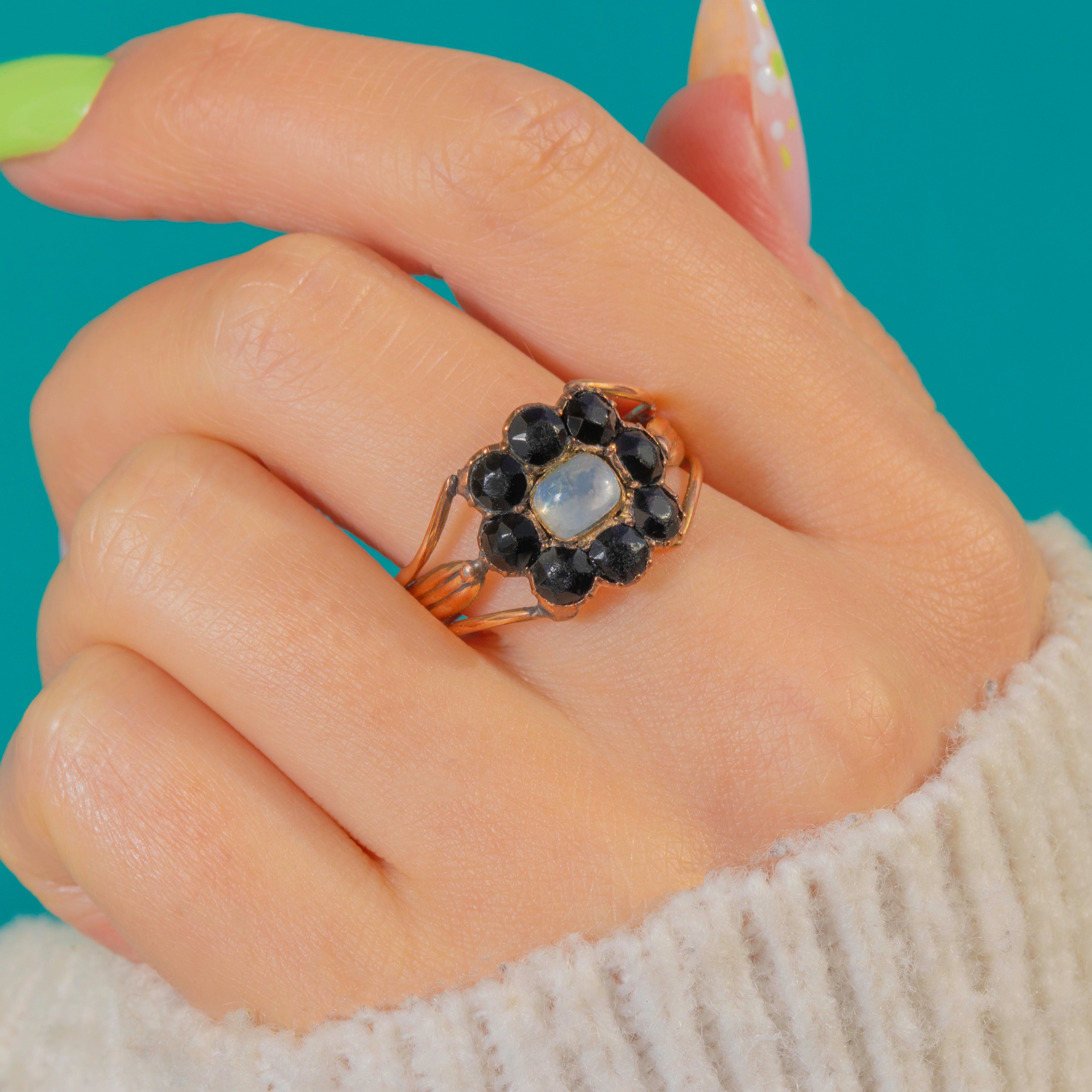 A luminous foiled Moonstone glows at the heart of this Georgian cluster ring, its ethereal sheen framed by a halo of inky French Jet. Crafted in warm 9ct Gold, the daisy-like rosette silhouette is both delicate and striking, offering that magical light-and-dark contrast so beloved of early 19th-century jewels.