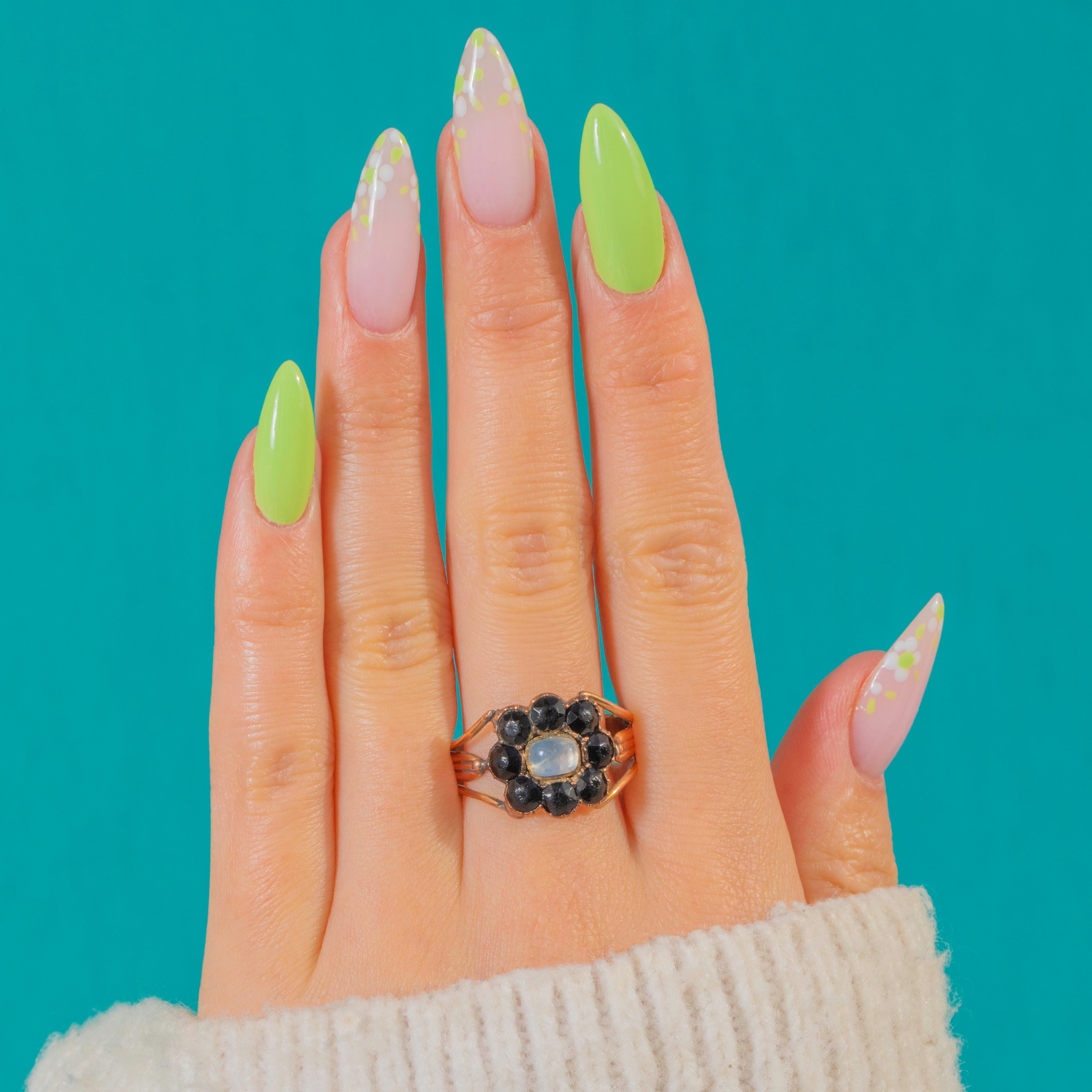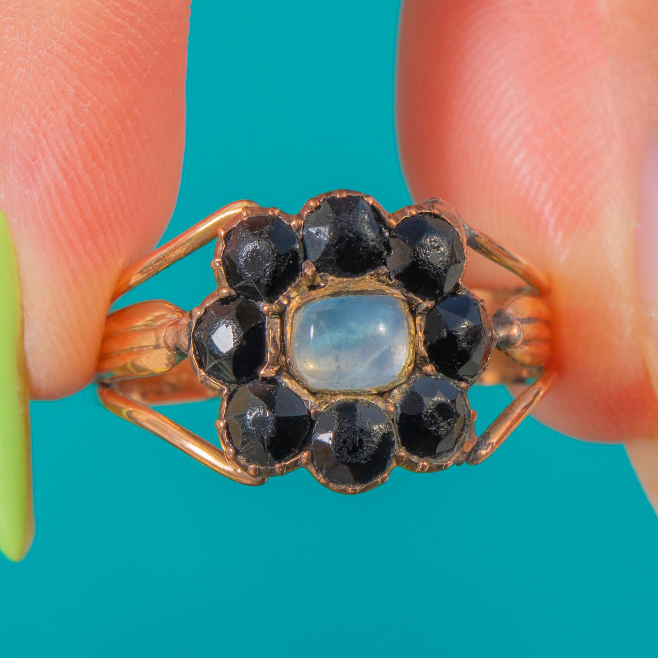 Georgian 9ct Gold Foiled Moonstone French Jet Cluster Ring c.1820