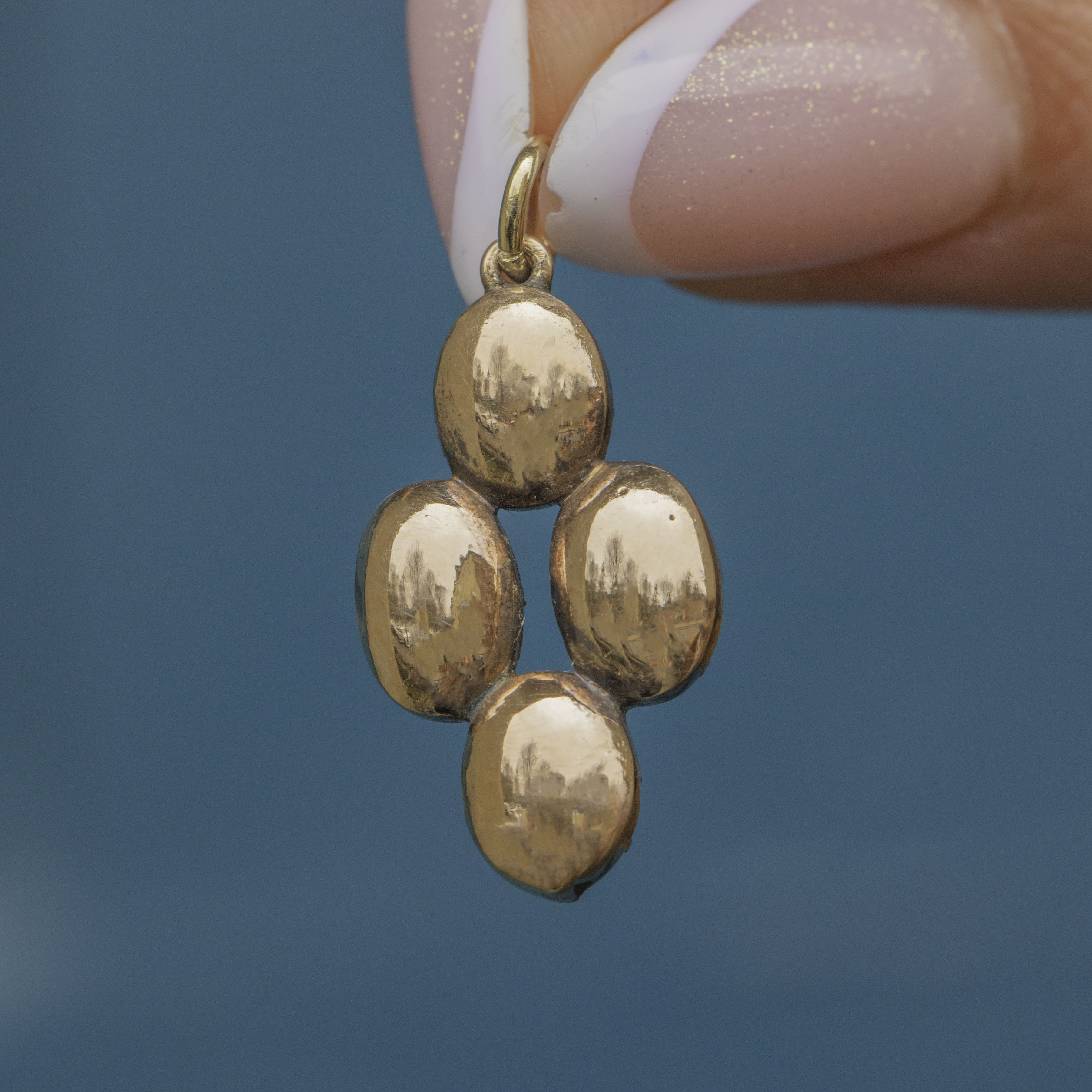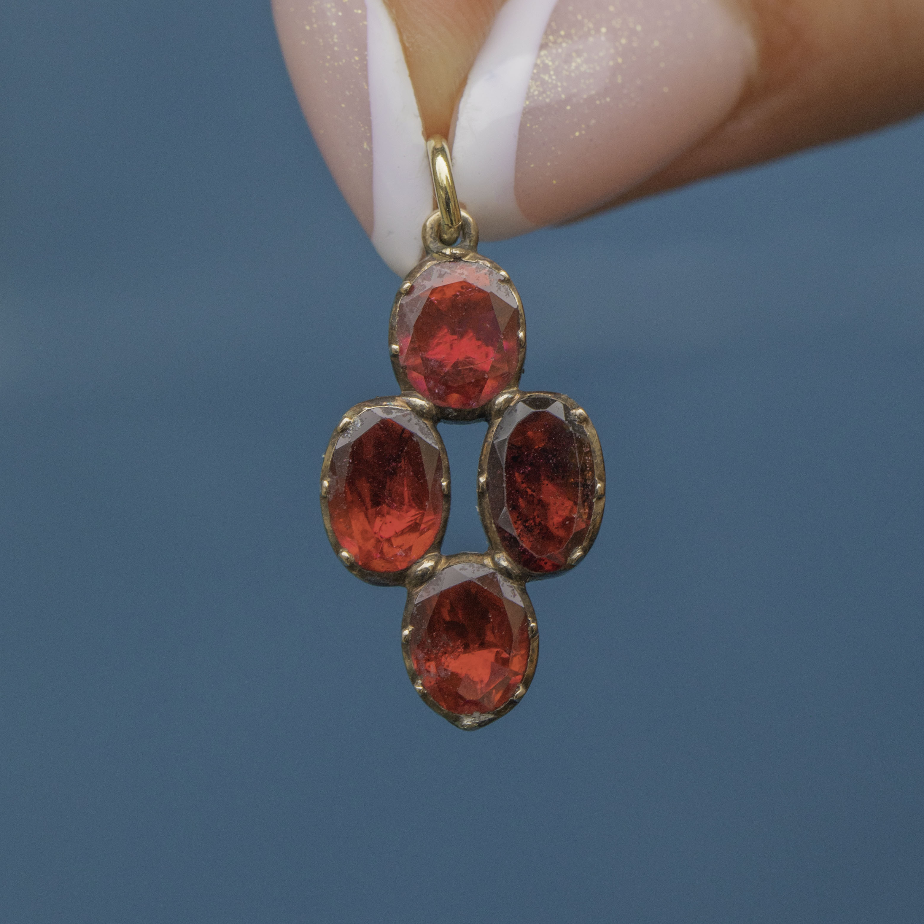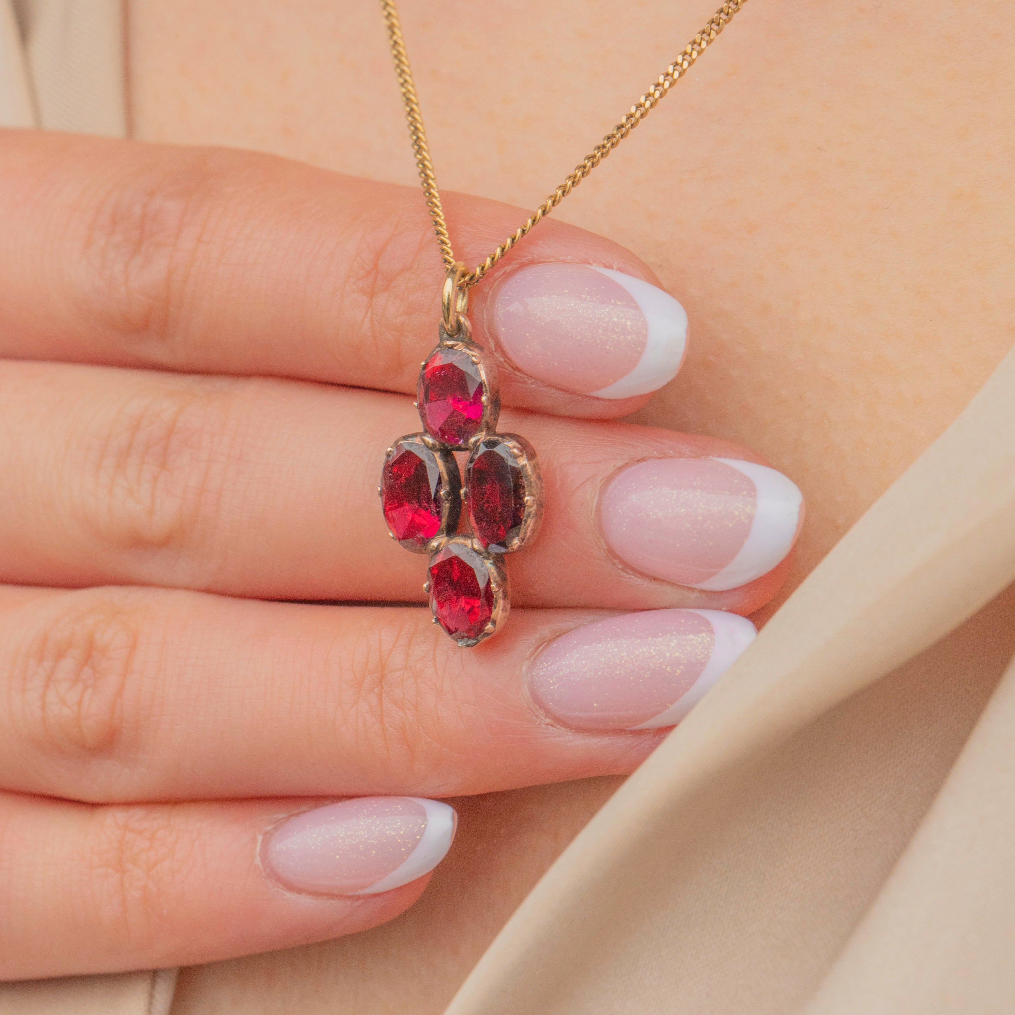 This exquisite Georgian 9ct Gold Garnet charm is a true delight! Showcasing four beautifully flat-cut Garnets arranged in a quartet formation, she shimmers with deep, crimson hues—reminiscent of a cluster of ripe, irresistible berries.