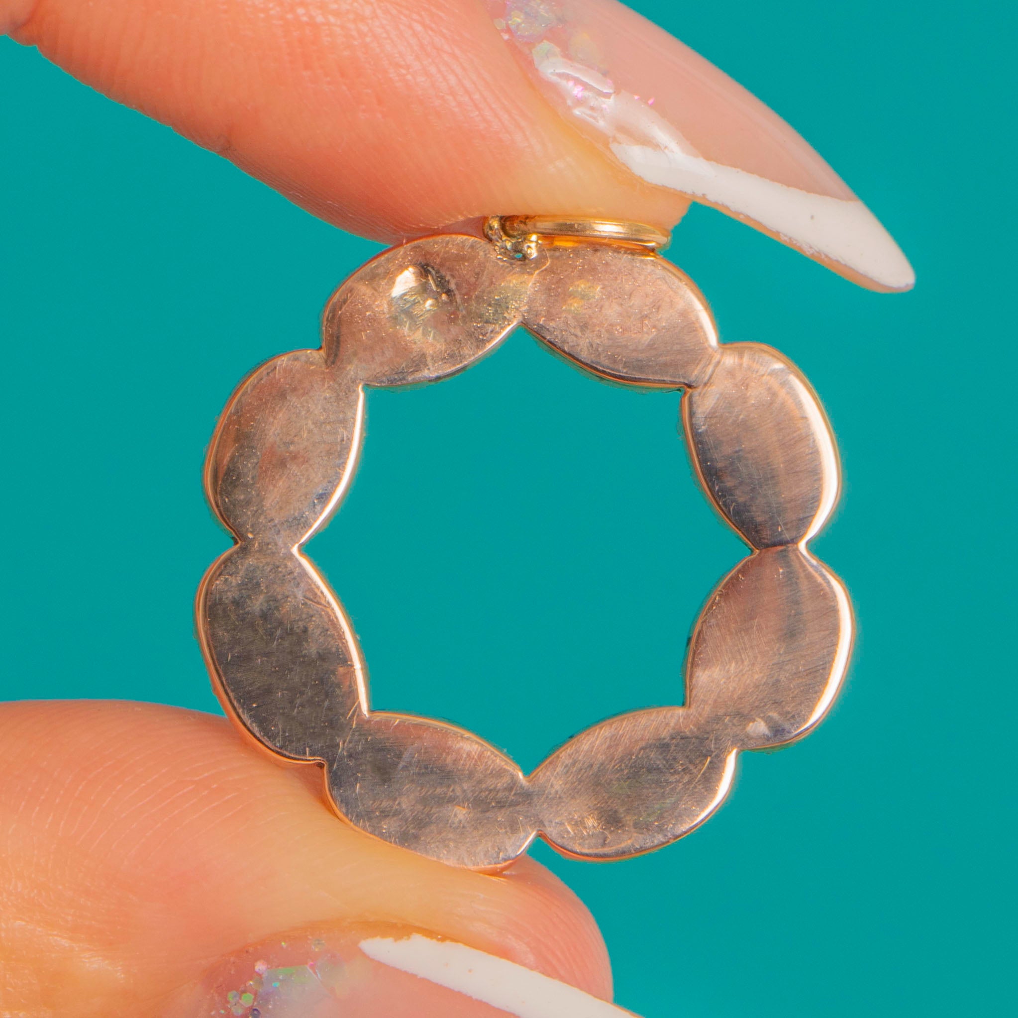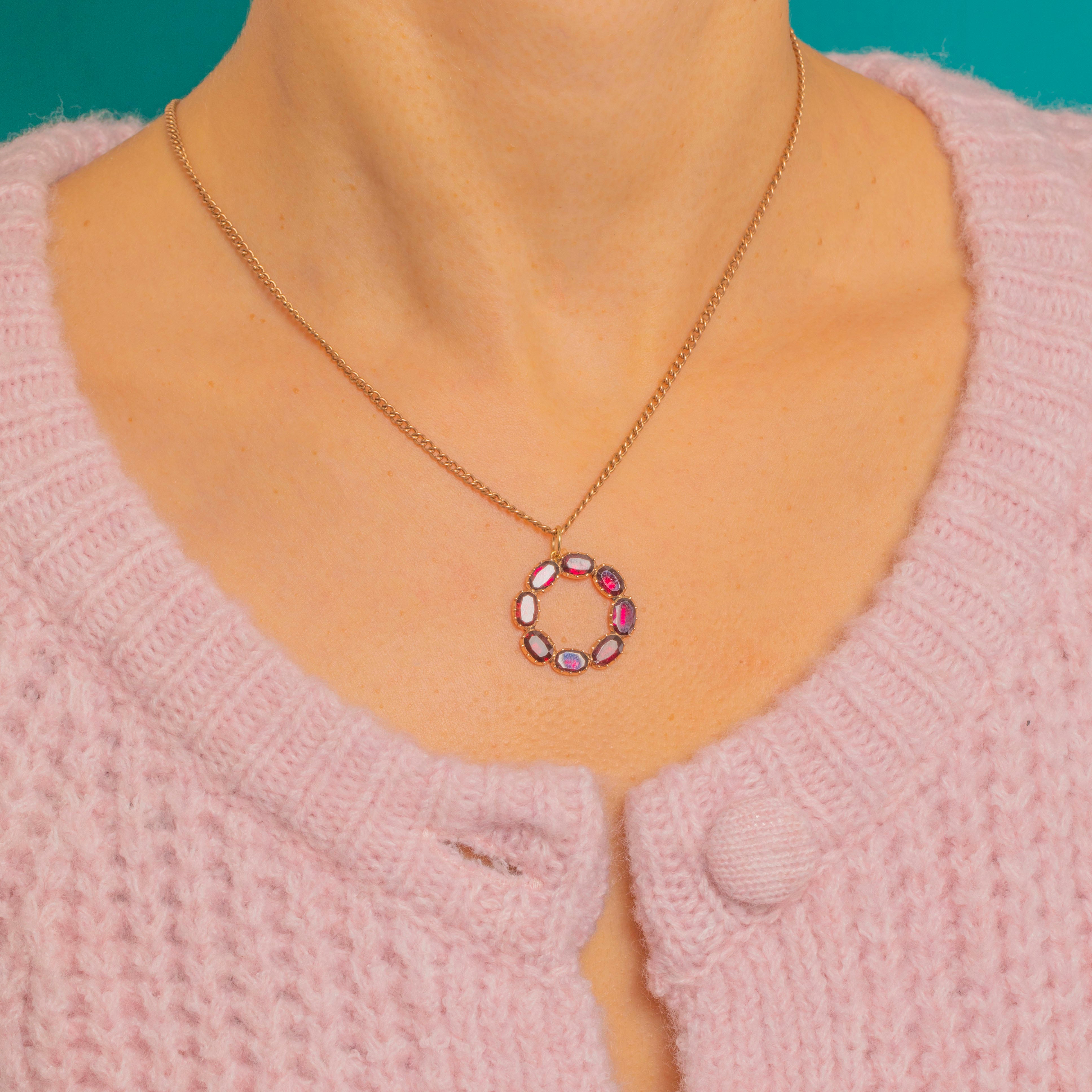 A gorgeous Georgian Garnet pendant dating to c.1820, designed as a perfect circle of glowing flat-cut Garnets, each beautifully foiled to enhance their rich, pinkish-red hue. The gemstones shimmer with that classic Georgian radiance, displayed in warm 9ct Gold with charming early-19th-century closed back piecrust settings.