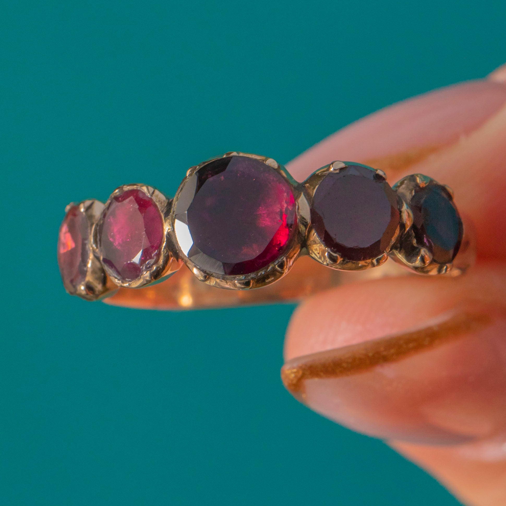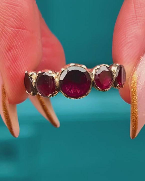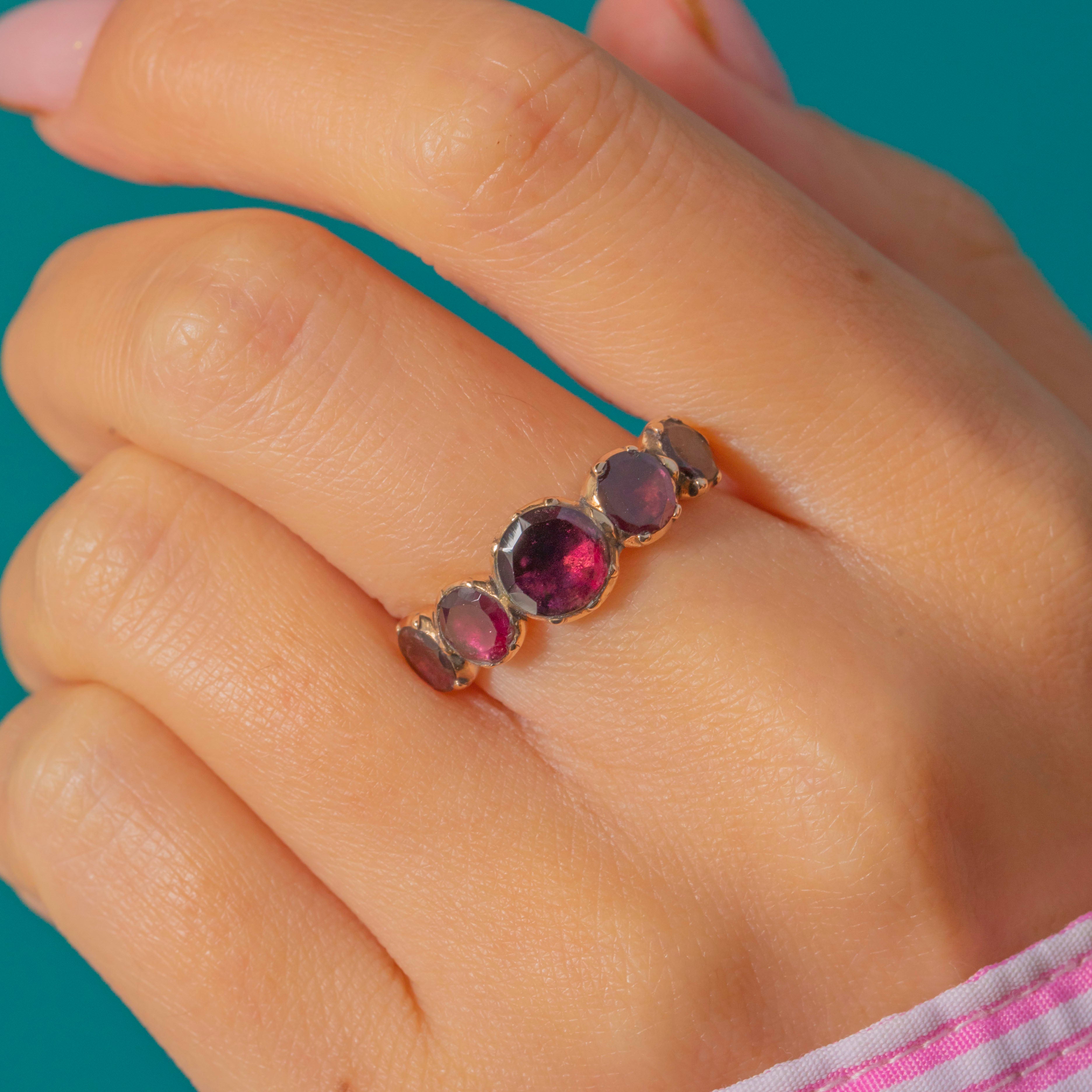 Deep wine-red Garnets glow across this elegant Georgian five-stone half hoop. Graduating gently to the centre, each Garnet is framed in decorative crimped collet settings, the backs closed in classic early 19th-century style. The warm 9ct Gold band and gallery add a soft antique radiance that makes this ring so wearable and beautifully romantic.