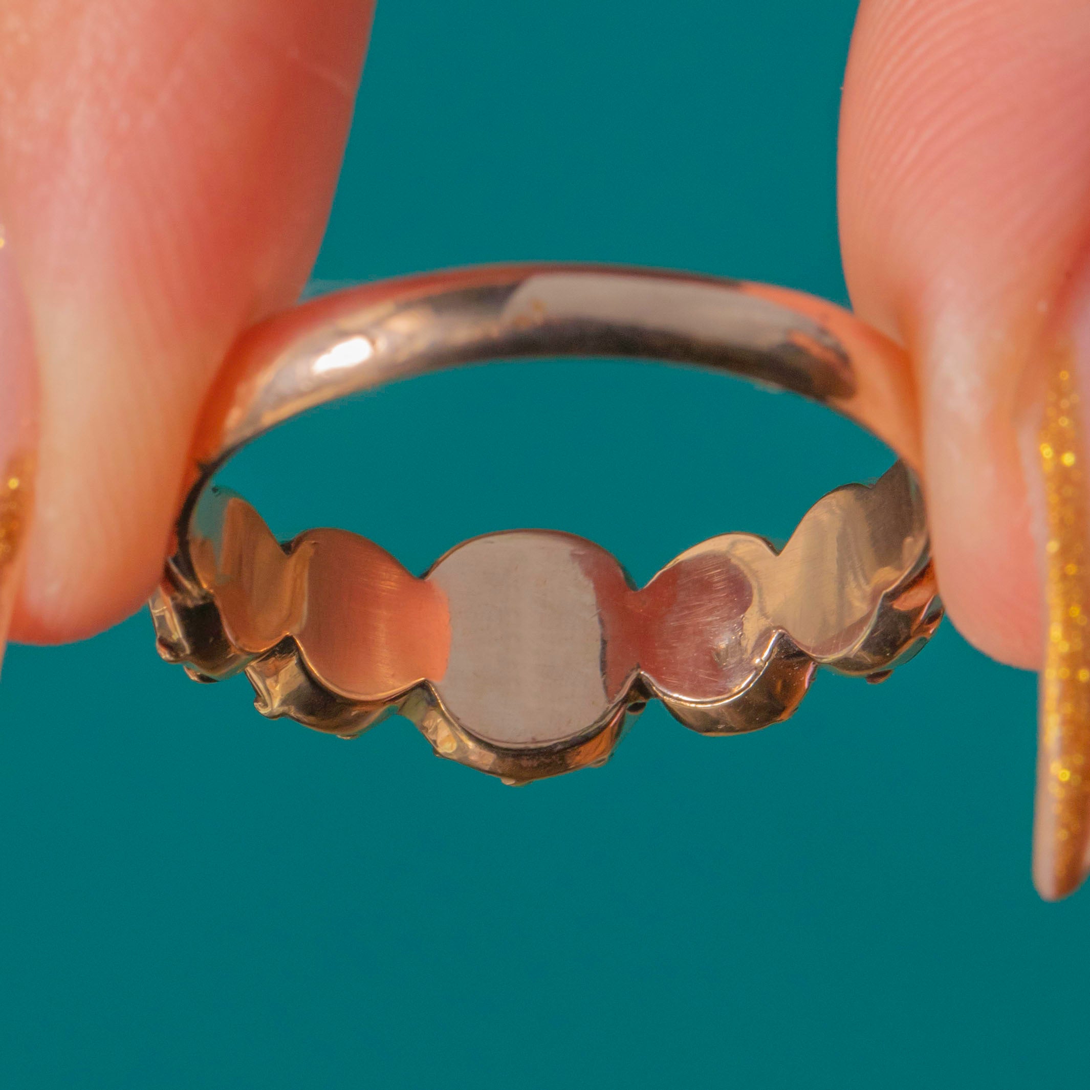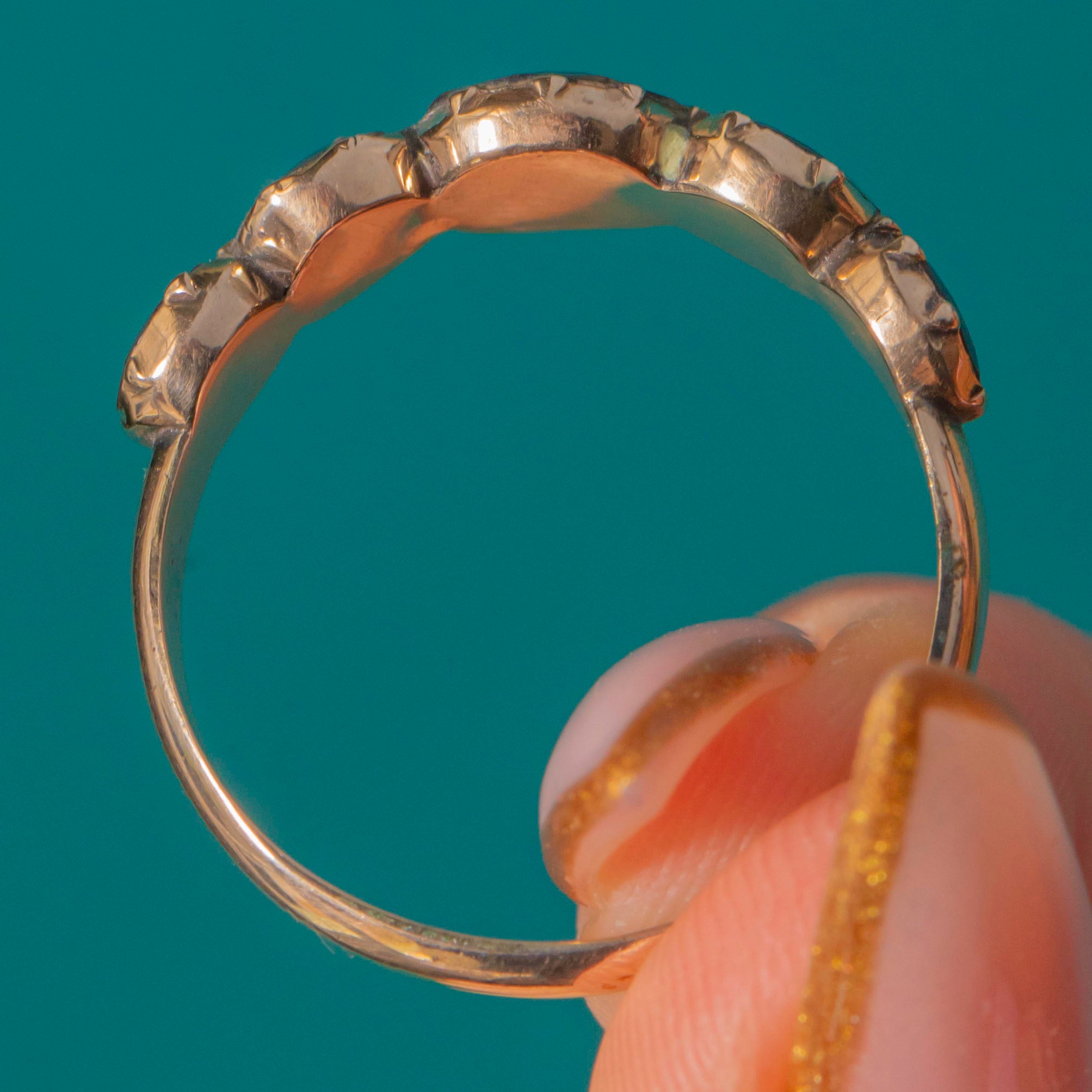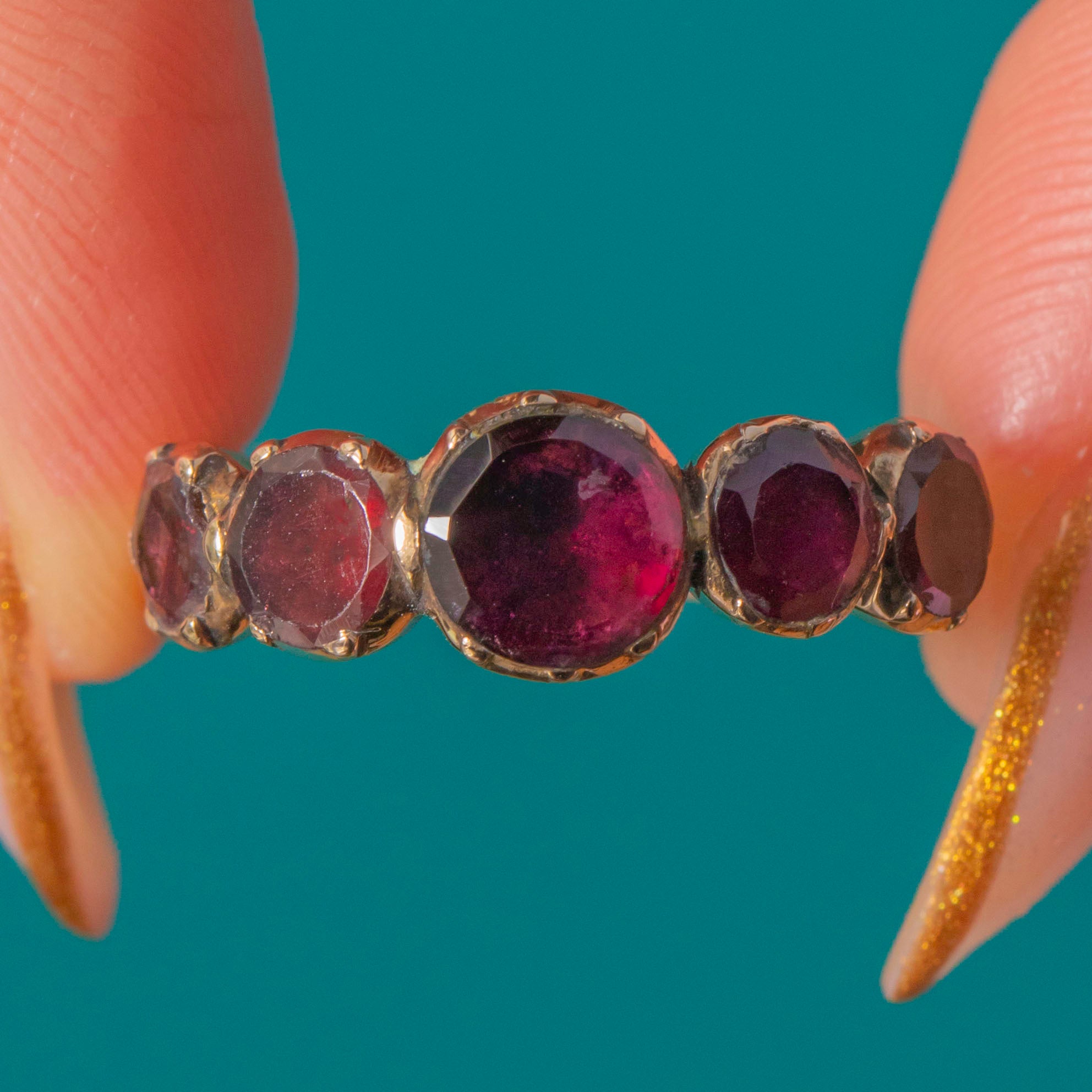 Deep wine-red Garnets glow across this elegant Georgian five-stone half hoop. Graduating gently to the centre, each Garnet is framed in decorative crimped collet settings, the backs closed in classic early 19th-century style. The warm 9ct Gold band and gallery add a soft antique radiance that makes this ring so wearable and beautifully romantic.