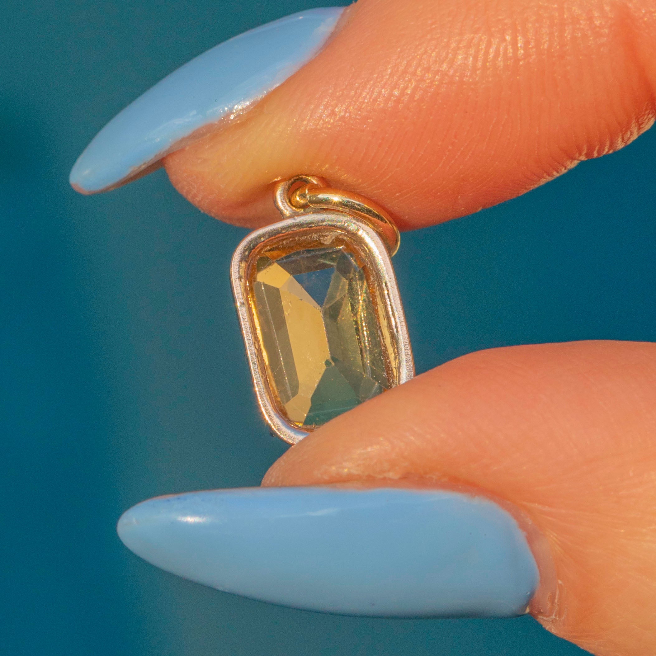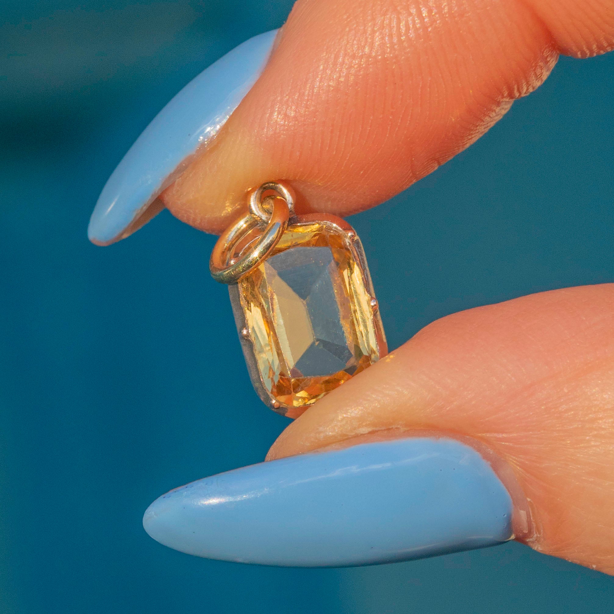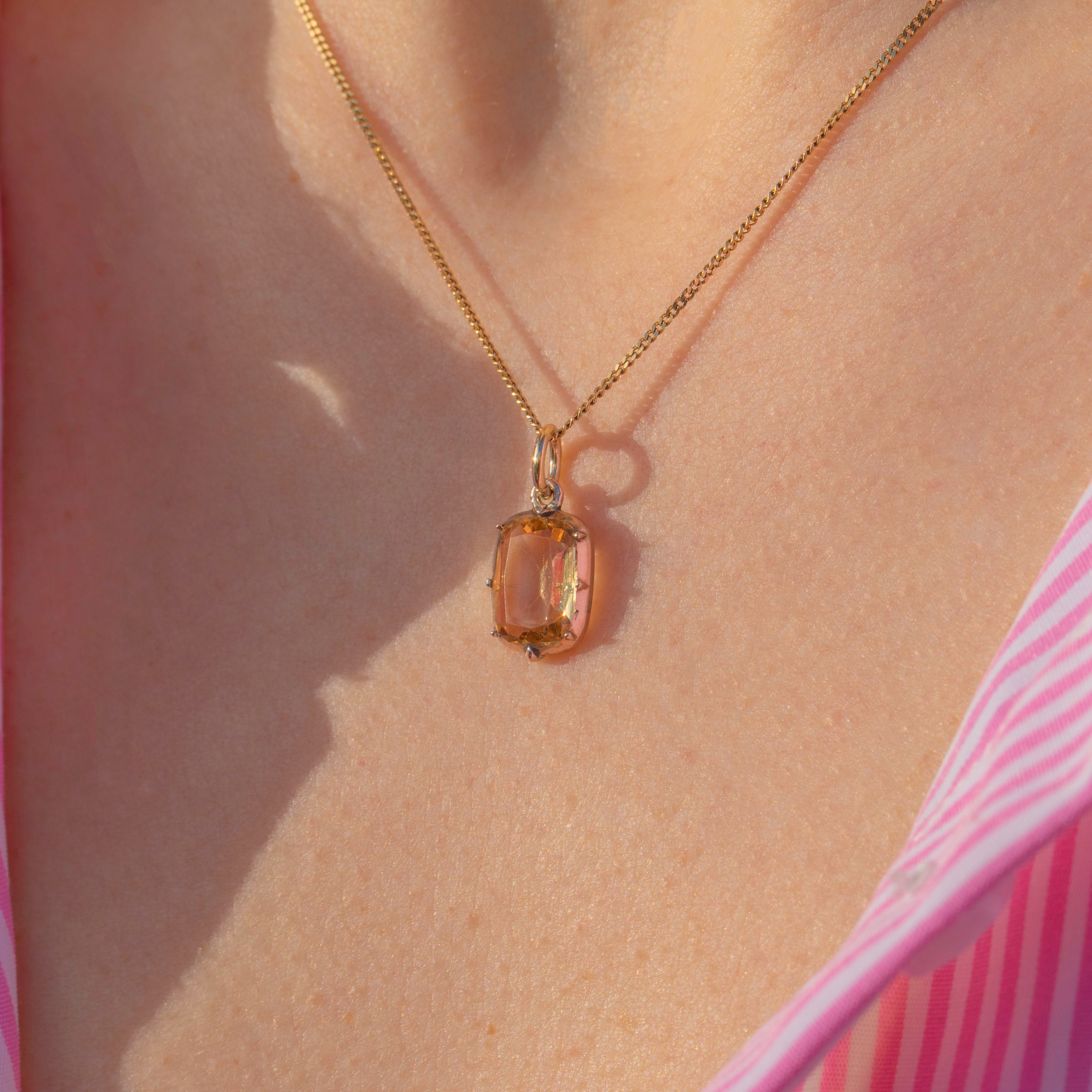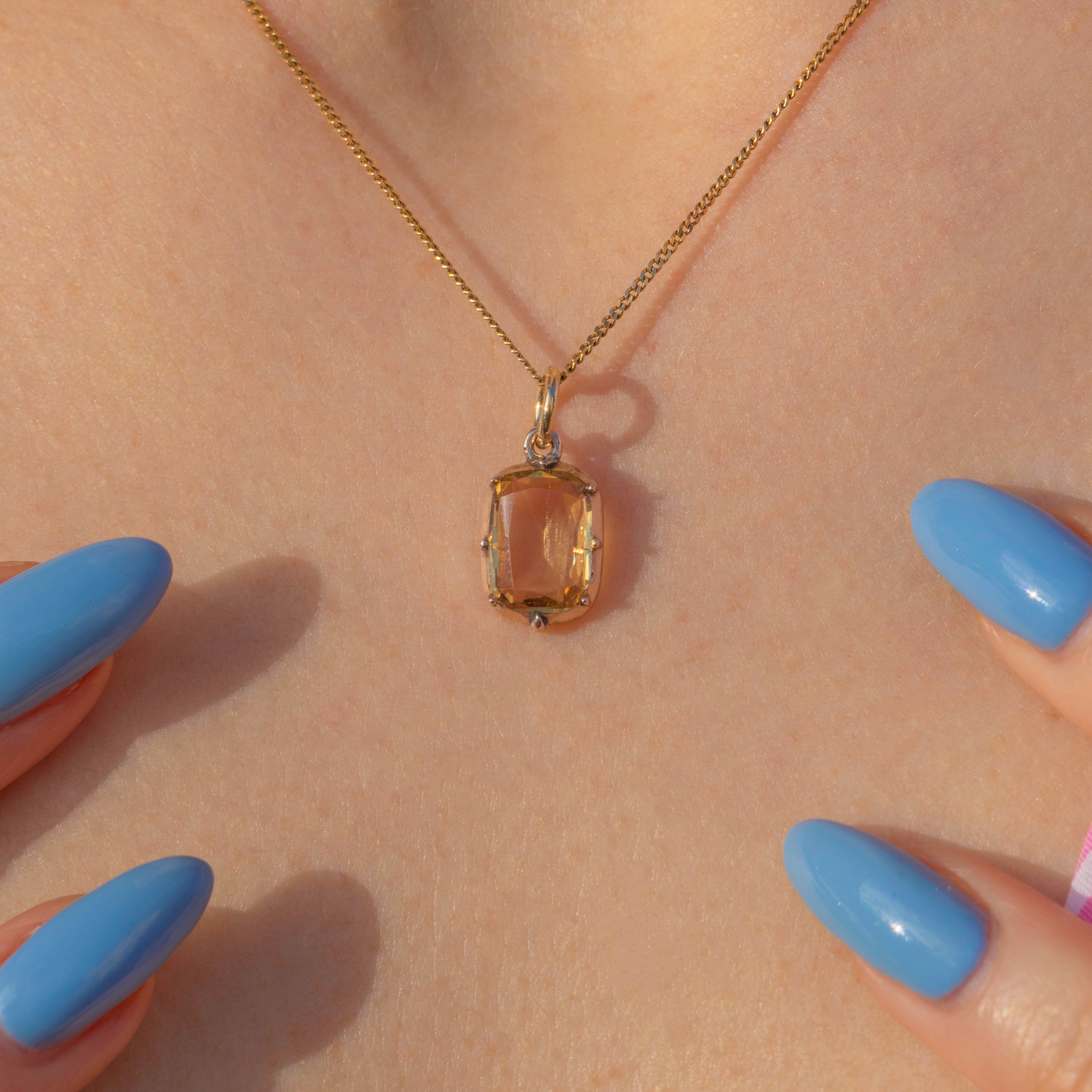 VERY GOOD. This Georgian 9ct gold topaz charm is in very good condition, with only minimal signs of wear that are typical for a piece of this age. The Topaz remains vibrant and securely set, and the gold retains its beautiful hue. There are light surface marks, which do not affect the charm's overall appeal or integrity. The Gold is brightly saturated and the generously sized jump ring will allow you to suspend this treasure from a skinny Gold chain with ease!