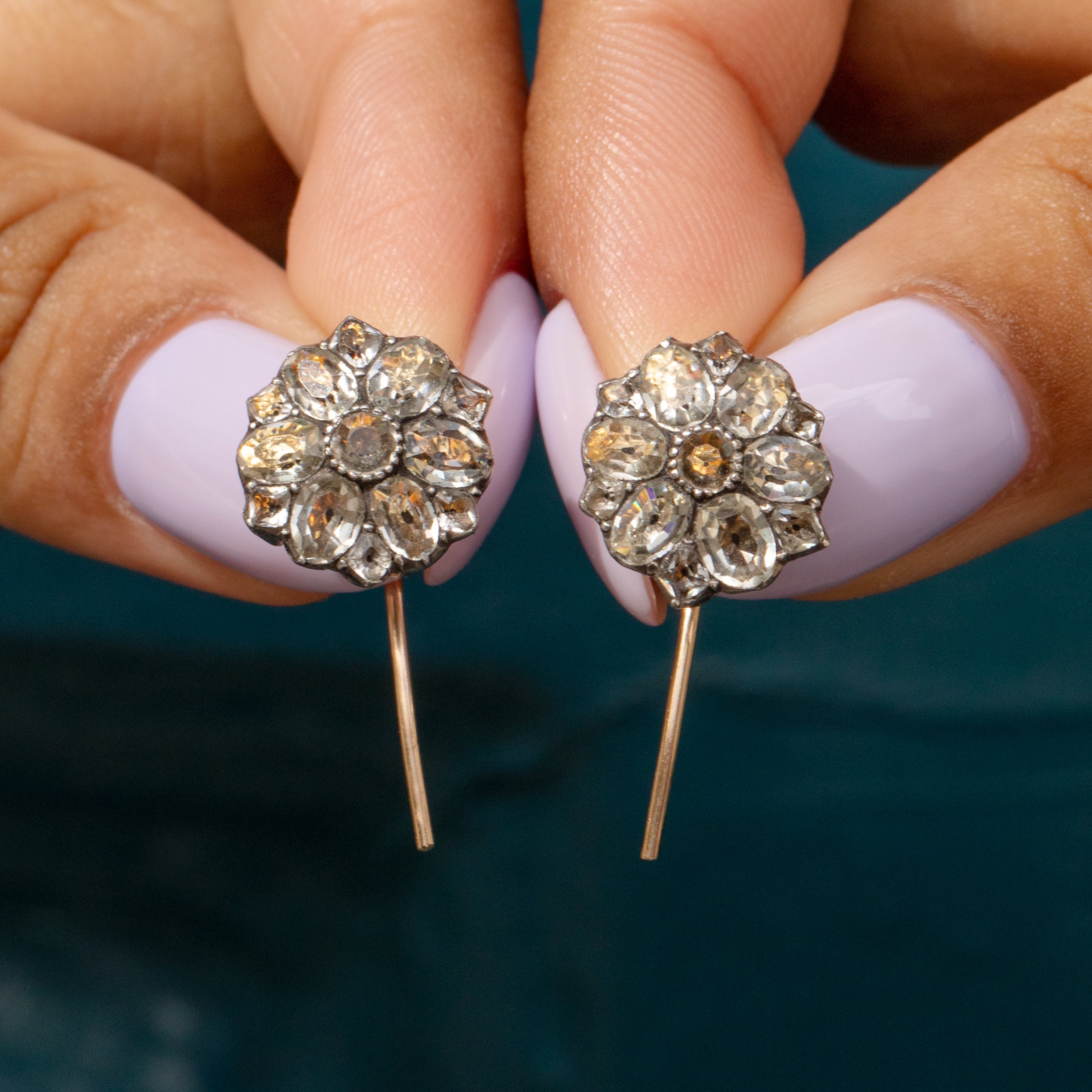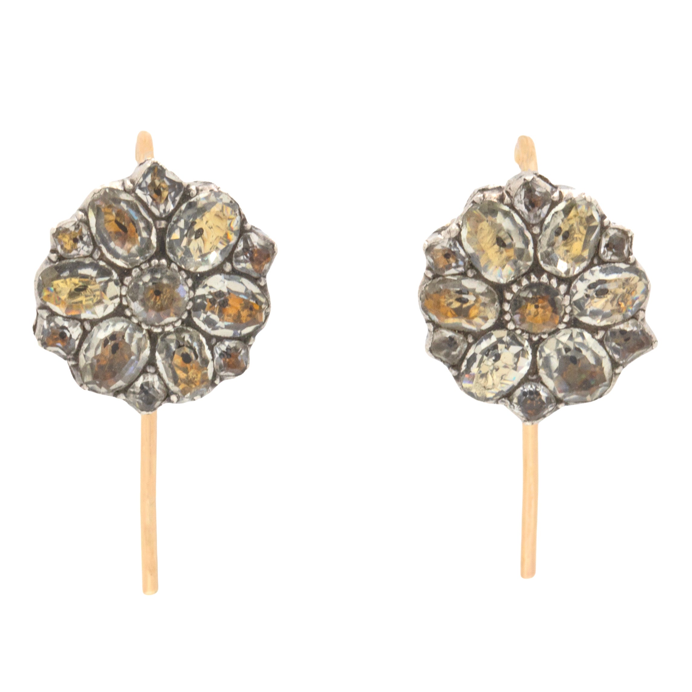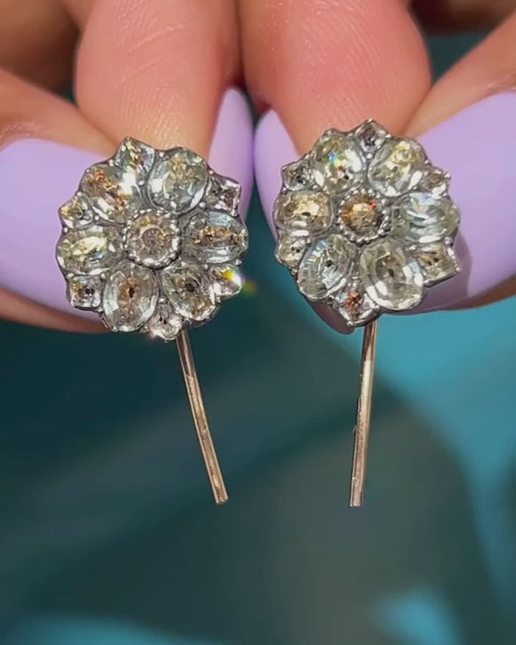 VERY GOOD TO EXCELLENT. These Georgian Black Dot Paste flower cluster earrings are in very good condition. The fronts are gorgeous and the crisp Paste clusters catch the eye. It is likely the hooks of the earrings have been upgraded through time, they are over 200 years old after all, but this can't be seen when they're worn in the ear and ensures the utmost confidence when you wear them. The Paste gems are all secure in their settings and the sturdy Gold hooks ensure secure and comfortable wear!