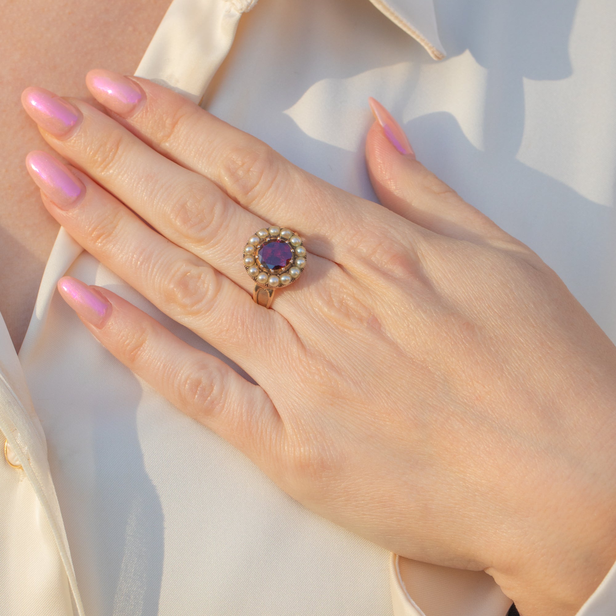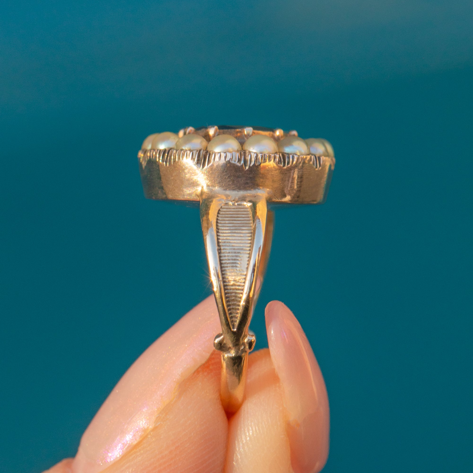 Boasting a fabulous merlot-hued 0.60ct flat-cut Garnet haloed by bright and luminous Pearls displayed in 9ct Gold with a rosy 15ct Gold band, this Georgian ring is an undeniably chic and feminine piece.