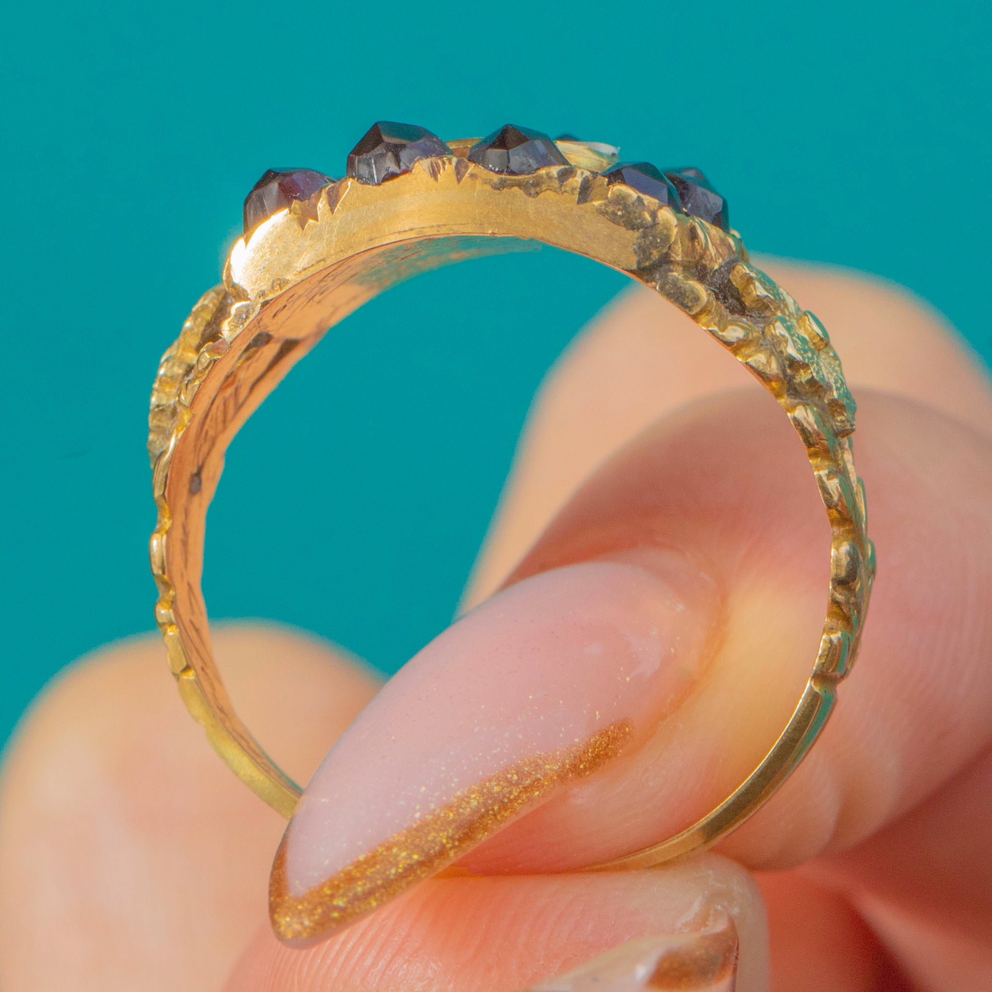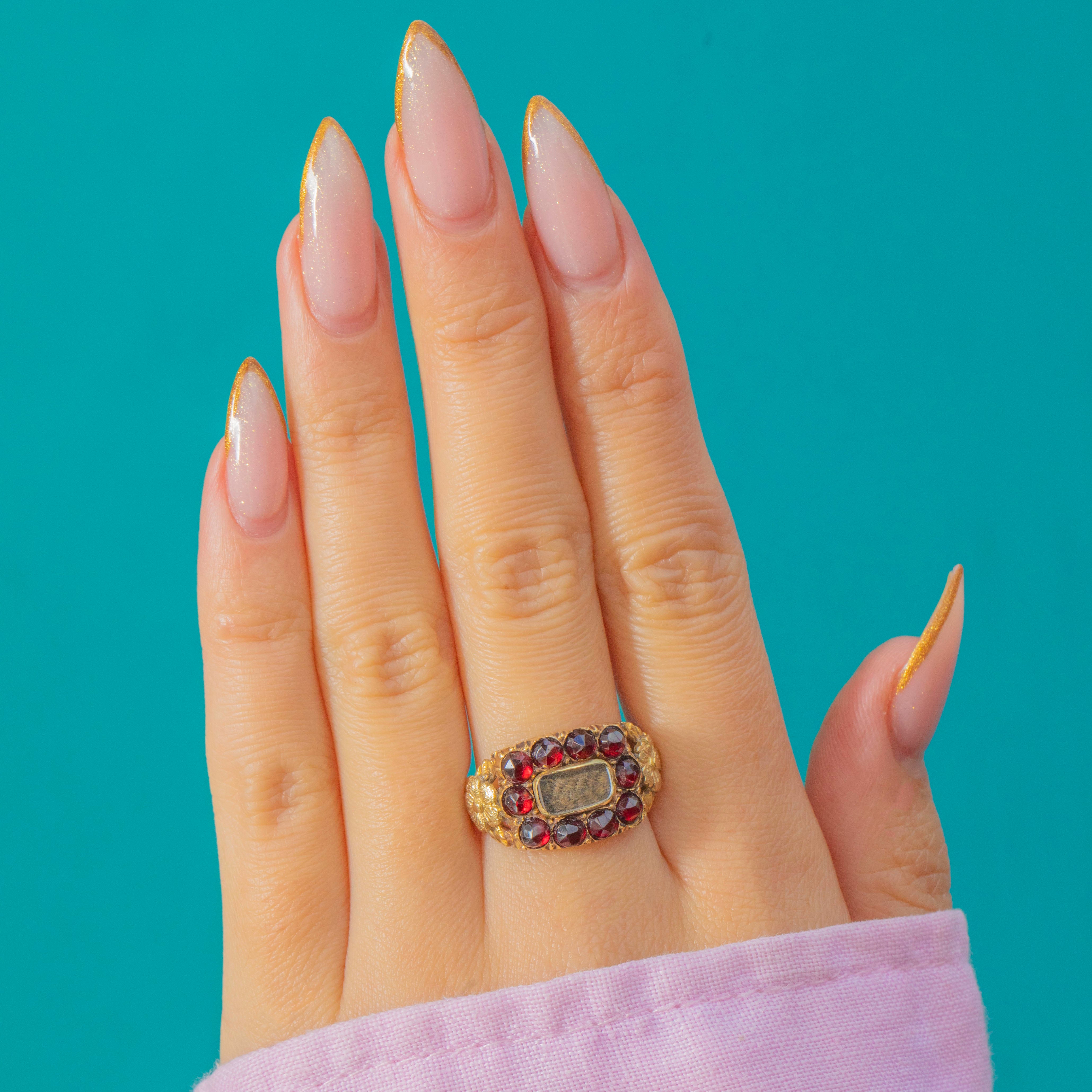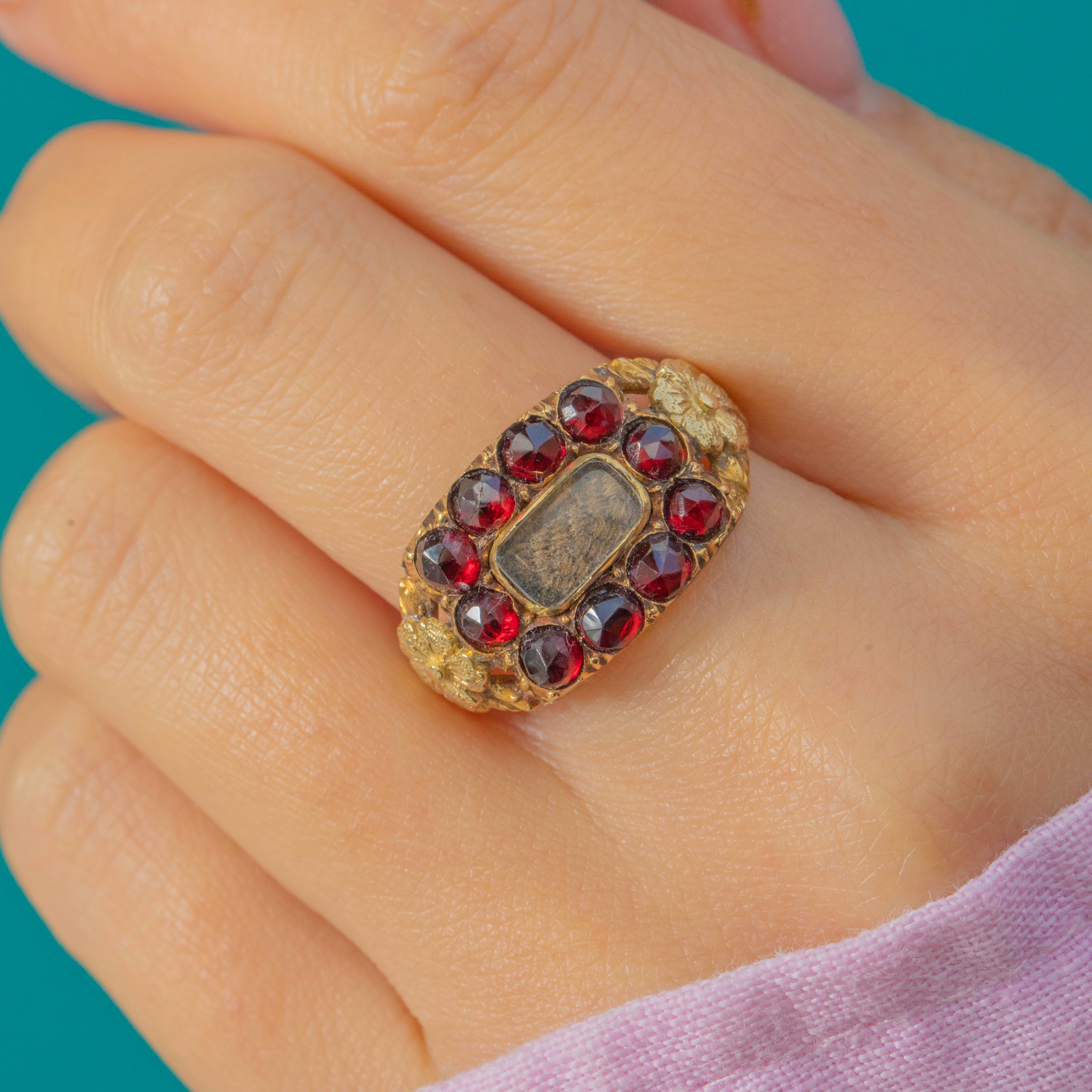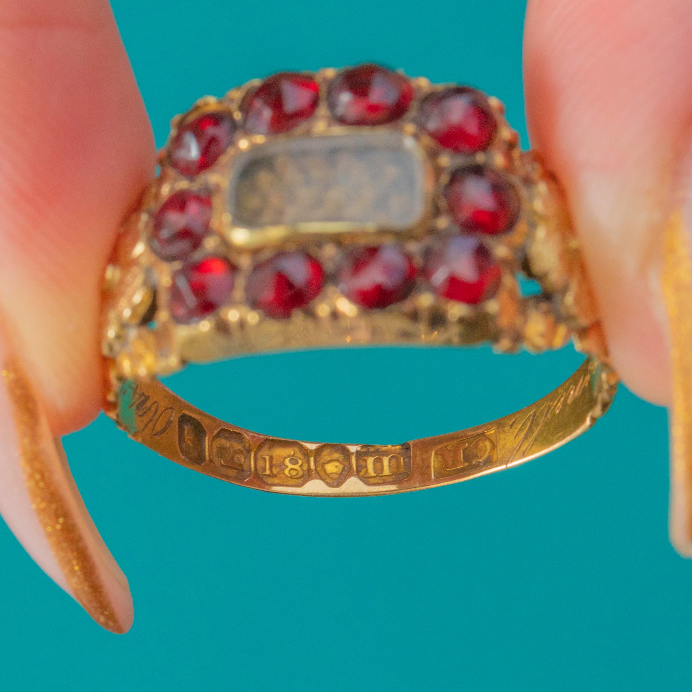 This remarkable Georgian mourning ring commemorates a married couple, Mrs Susannah Gosnell and Mr Sam Gosnell, who passed away just ten days apart in July 1827. Crafted in rich 18ct Gold, the ring is set with deep red Garnets surrounding a neat section of woven hair beneath a protective layer of Glass – a classic construction for high-status mourning jewellery of the period.