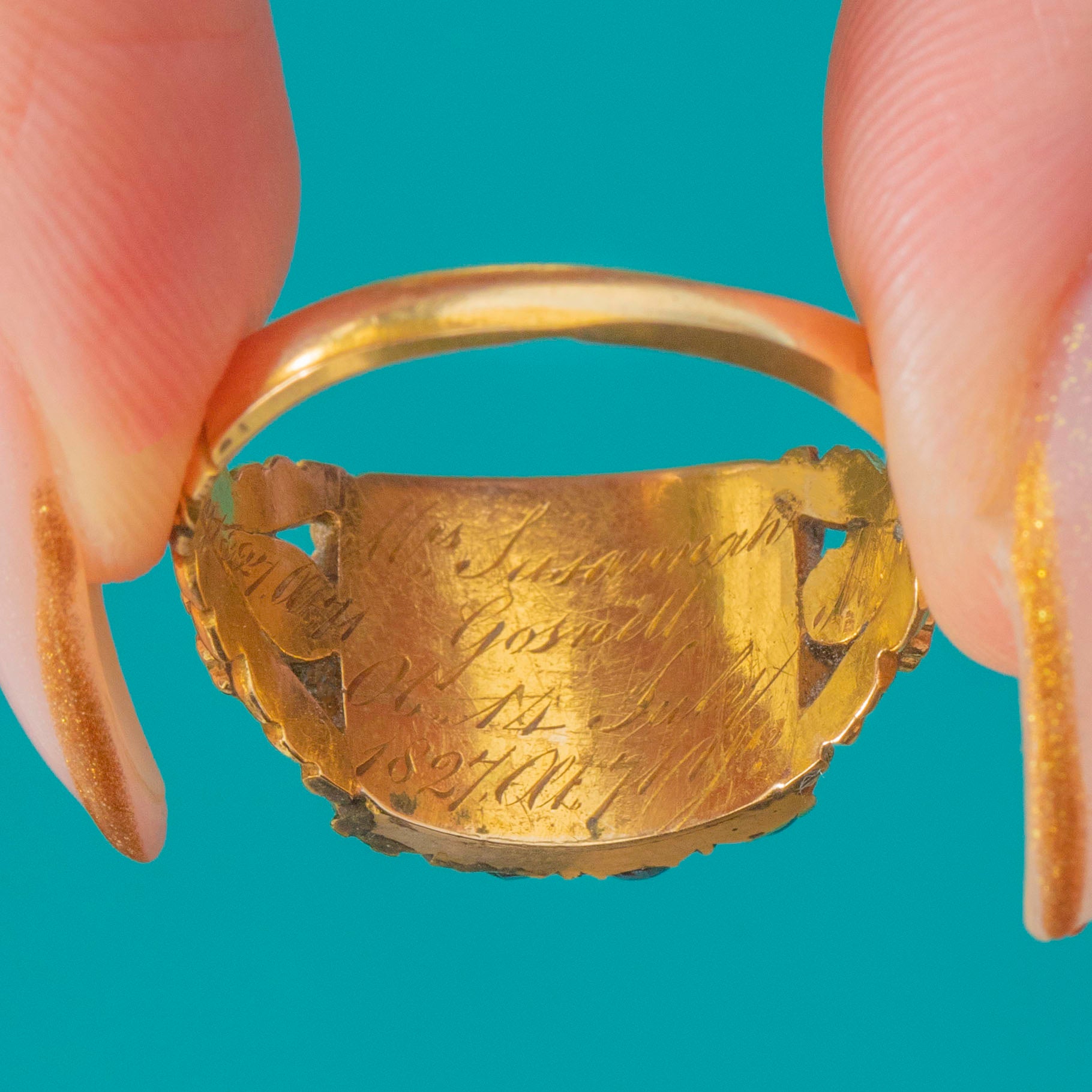 The inscription “OB 24th July 1827 at 71 Mrs Susannah Gosnell” and “OB 14th July 1827 Mr Sam Gosnell” is beautifully preserved, offering a poignant glimpse into 19th-century family history. An exceptional example of double-obituary mourning jewellery, rarely found in such crisp and original condition.