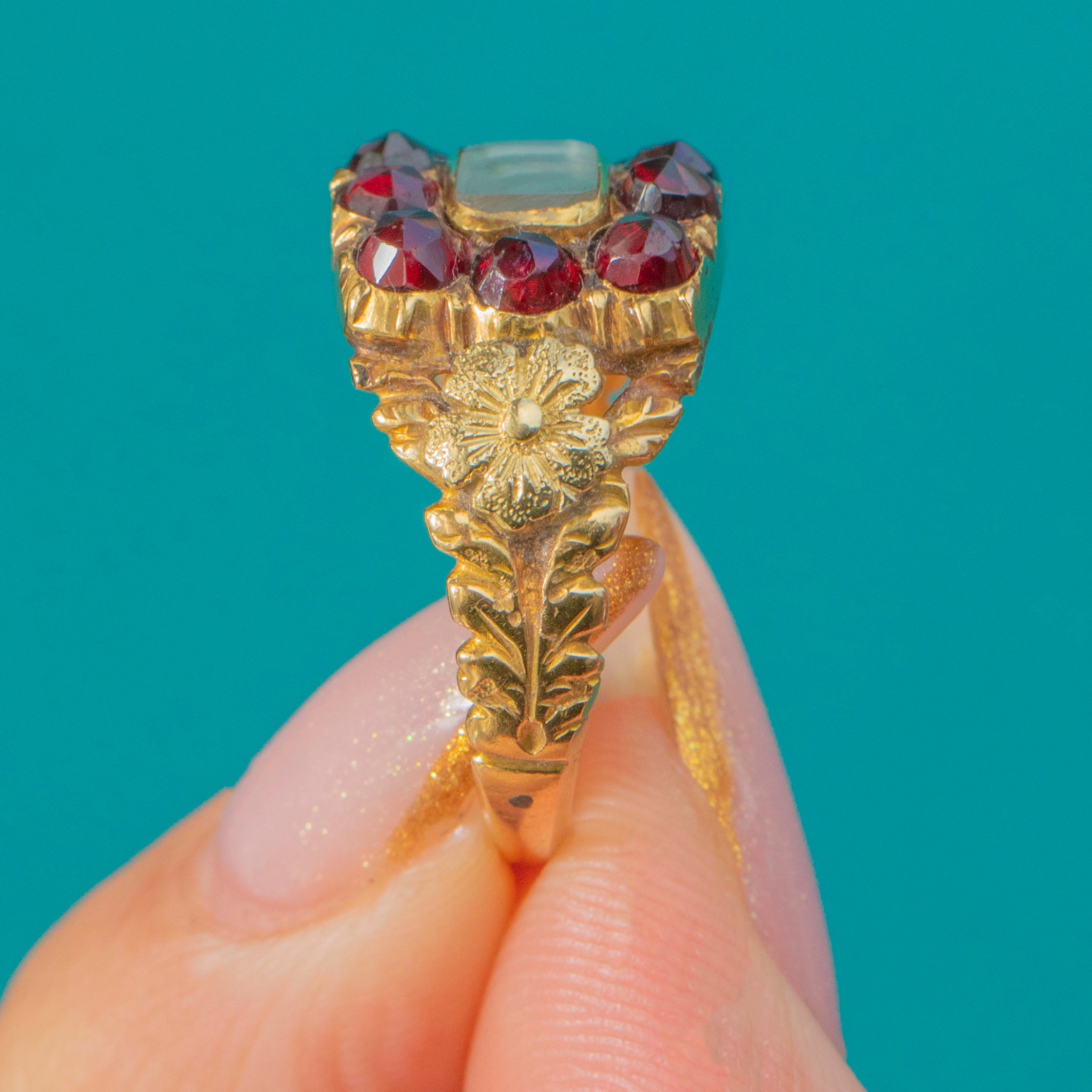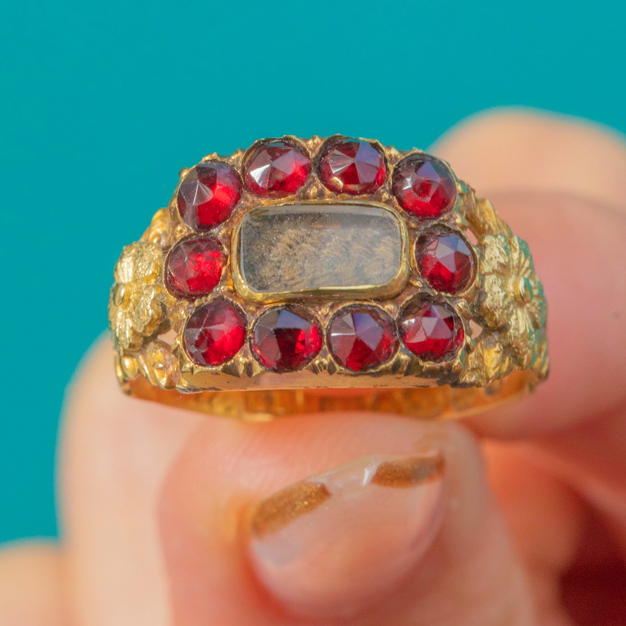 MATERIALS: Tests as 18ct Gold, Garnet, Glass, Woven Hair.