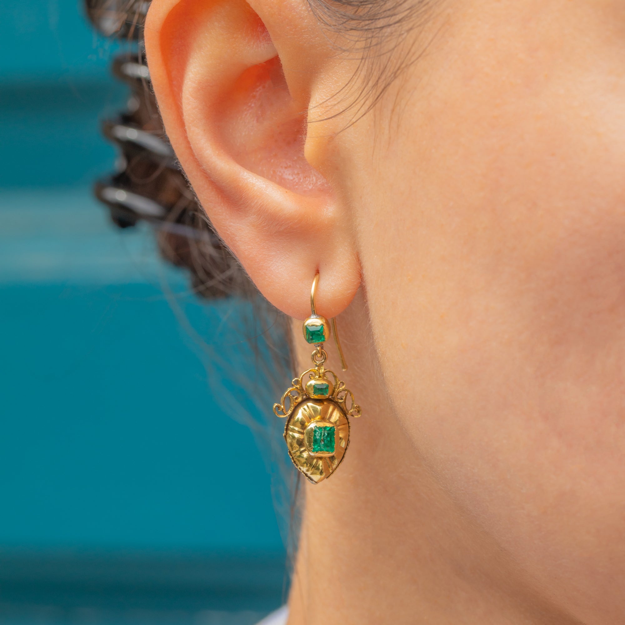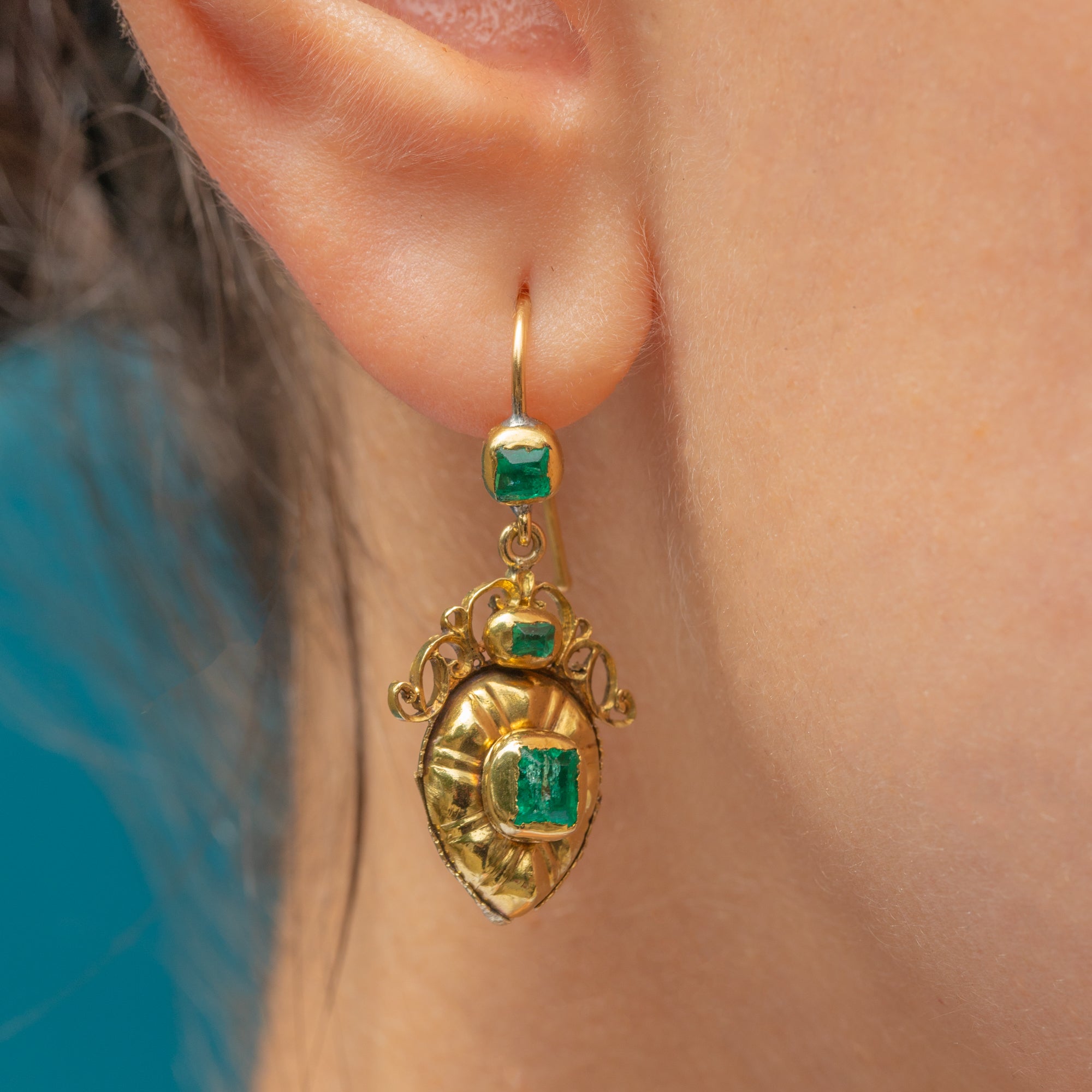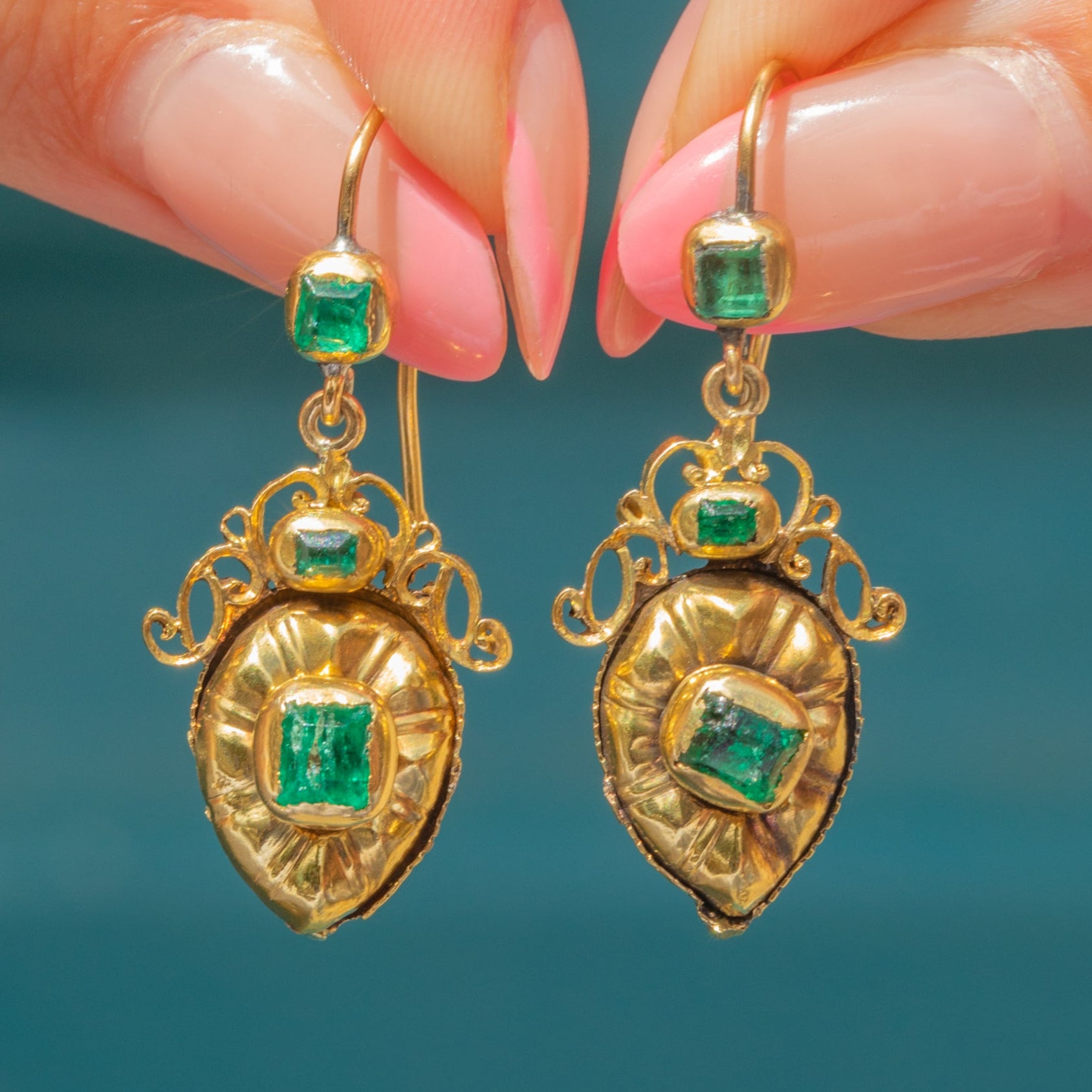VERY GOOD: These Georgian Iberian 18ct Gold Emerald drop earrings are in very good condition. The pair have lasted incredibly well, especially when considering how old they are! The Emeralds are securely set and have maintained a bright green hue. While there are some fleabites to the surface of the Emeralds, she is still a decadent and desirable piece! The back of the earrings shows some signs of wear and discolouration - pretty understandable considering they are nearly over 250 years old! Each component is securely affixed and the long, slender hooks provide comfortable and confident wear!