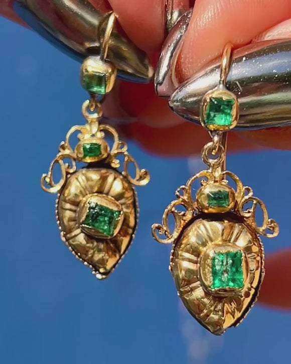 Here we have a magnificent pair of Georgian Iberian 18ct Gold Emerald drop earrings! An exquisite example of late 18th-century craftsmanship, these Georgian earrings represent the unmatched beauty of the past.