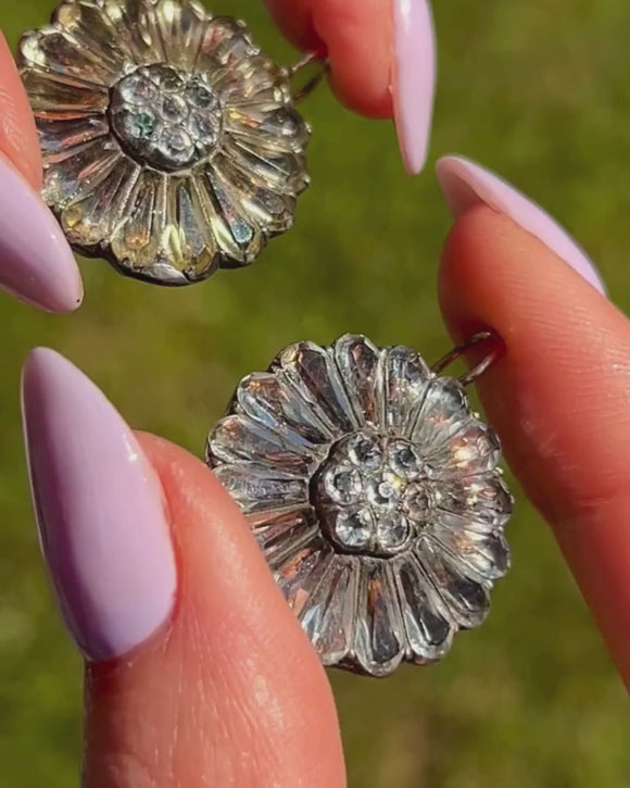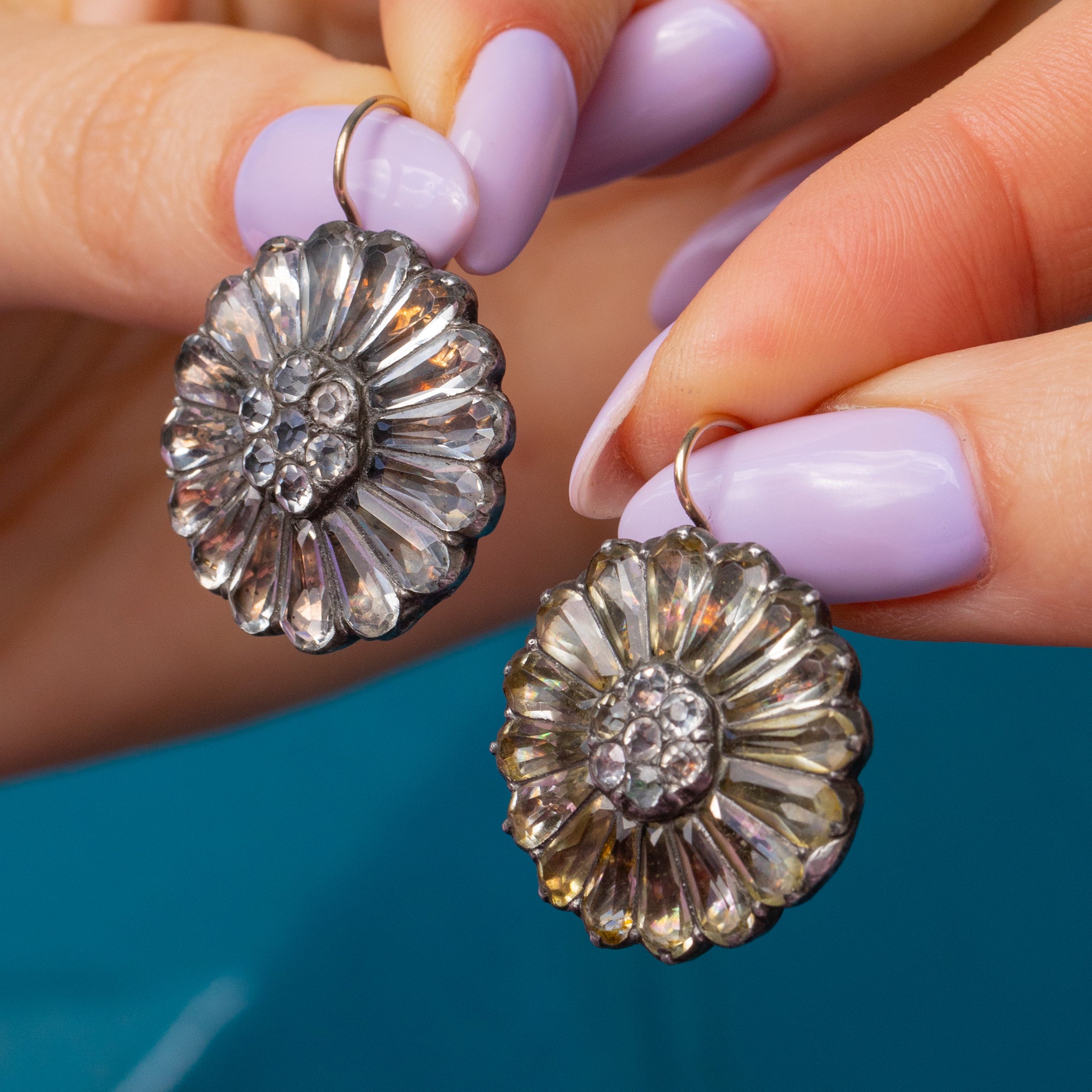 Once these Georgian Paste flower earrings are in your possession you will become the belle of the ball! Their sunflower forms are inlaid with perfectly cut Paste gems creating a disco ball display of sparkle, perfect for accompanying any evening attire.