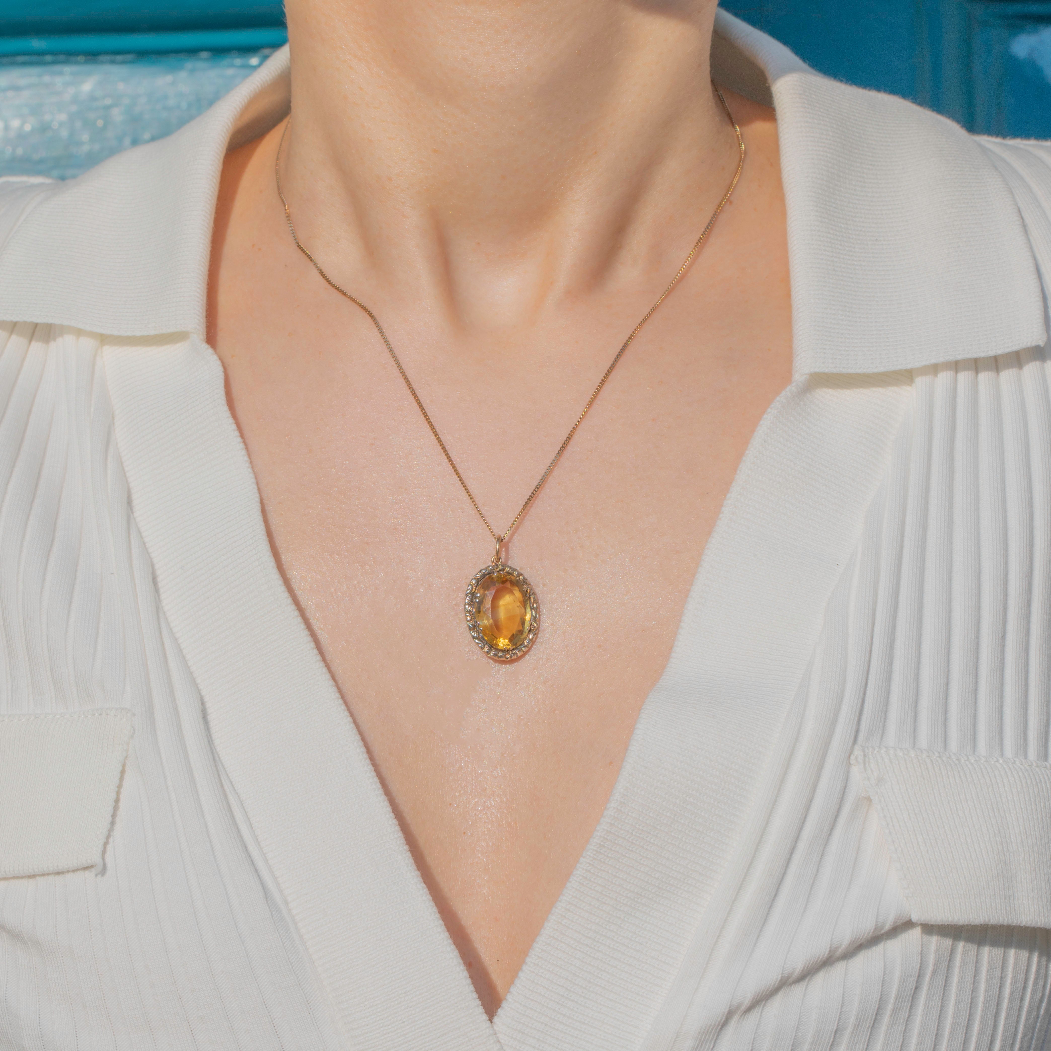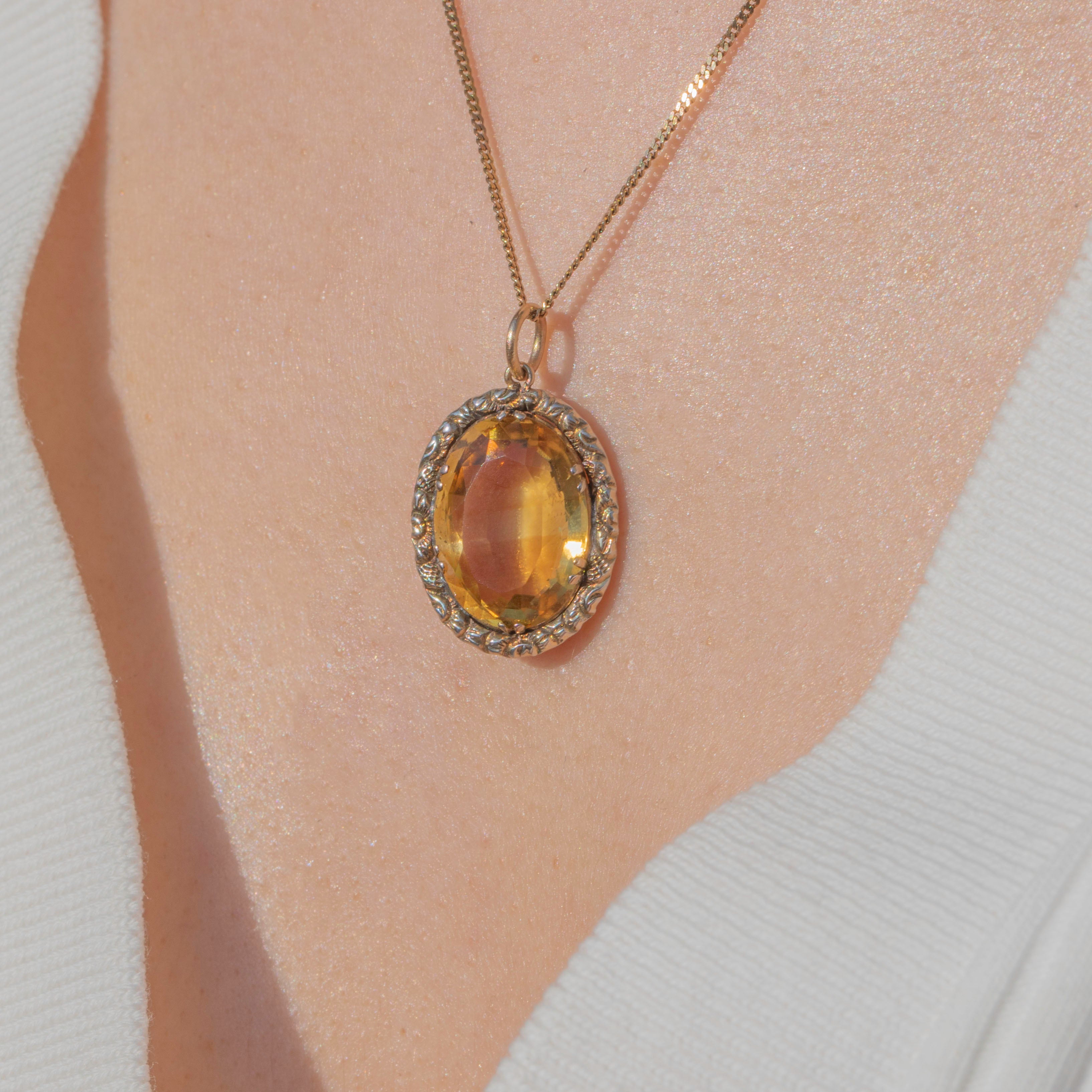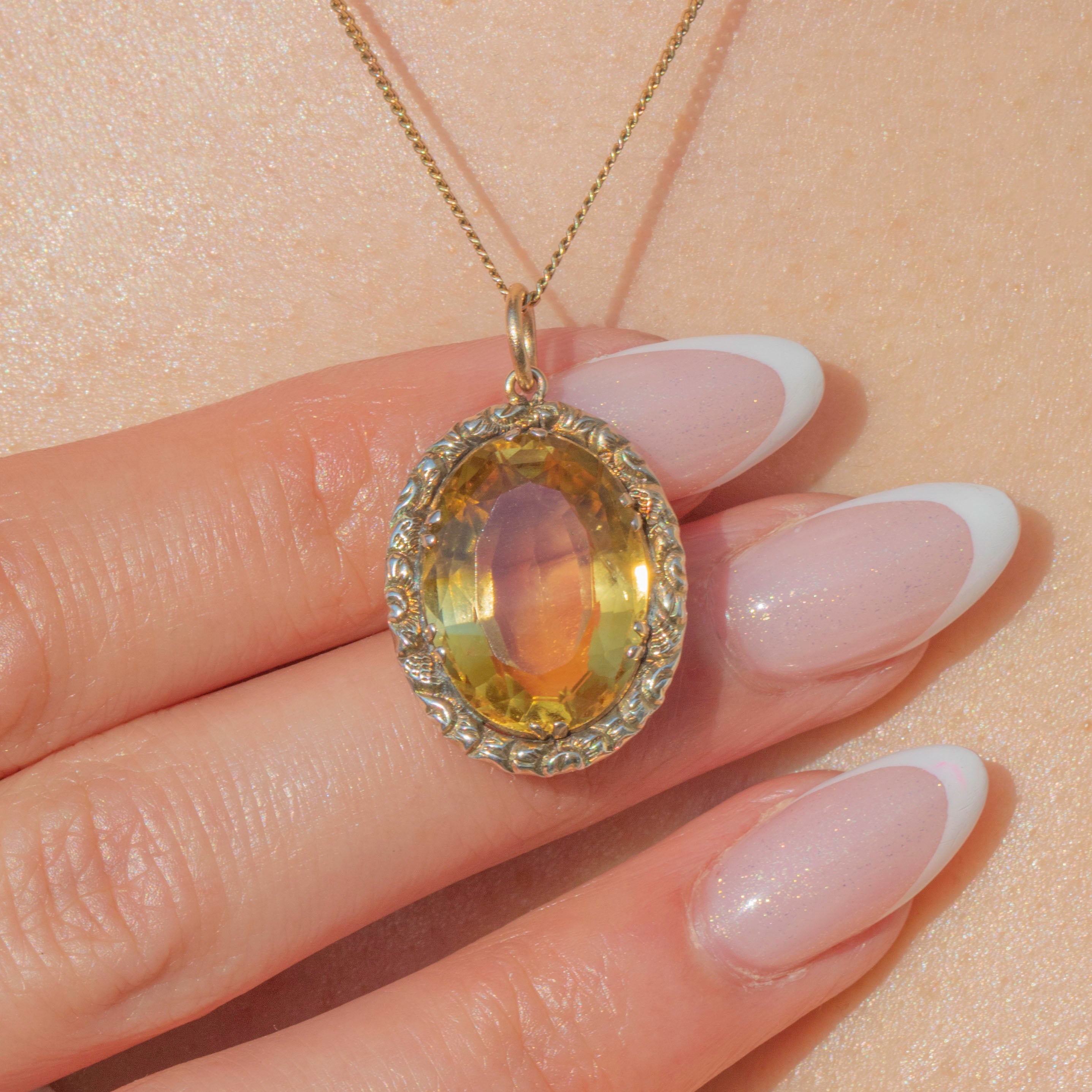 Exuding splendour from her every curve, this exquisite Georgian repoussé Citrine oval pendant will bring bundles of charm to your antique jewellery collection! Displaying a spectacular 7.20ct Citrine at the centre with a fabulously faceted form, this antique pendant creates a spectacular display as she catches the light.
