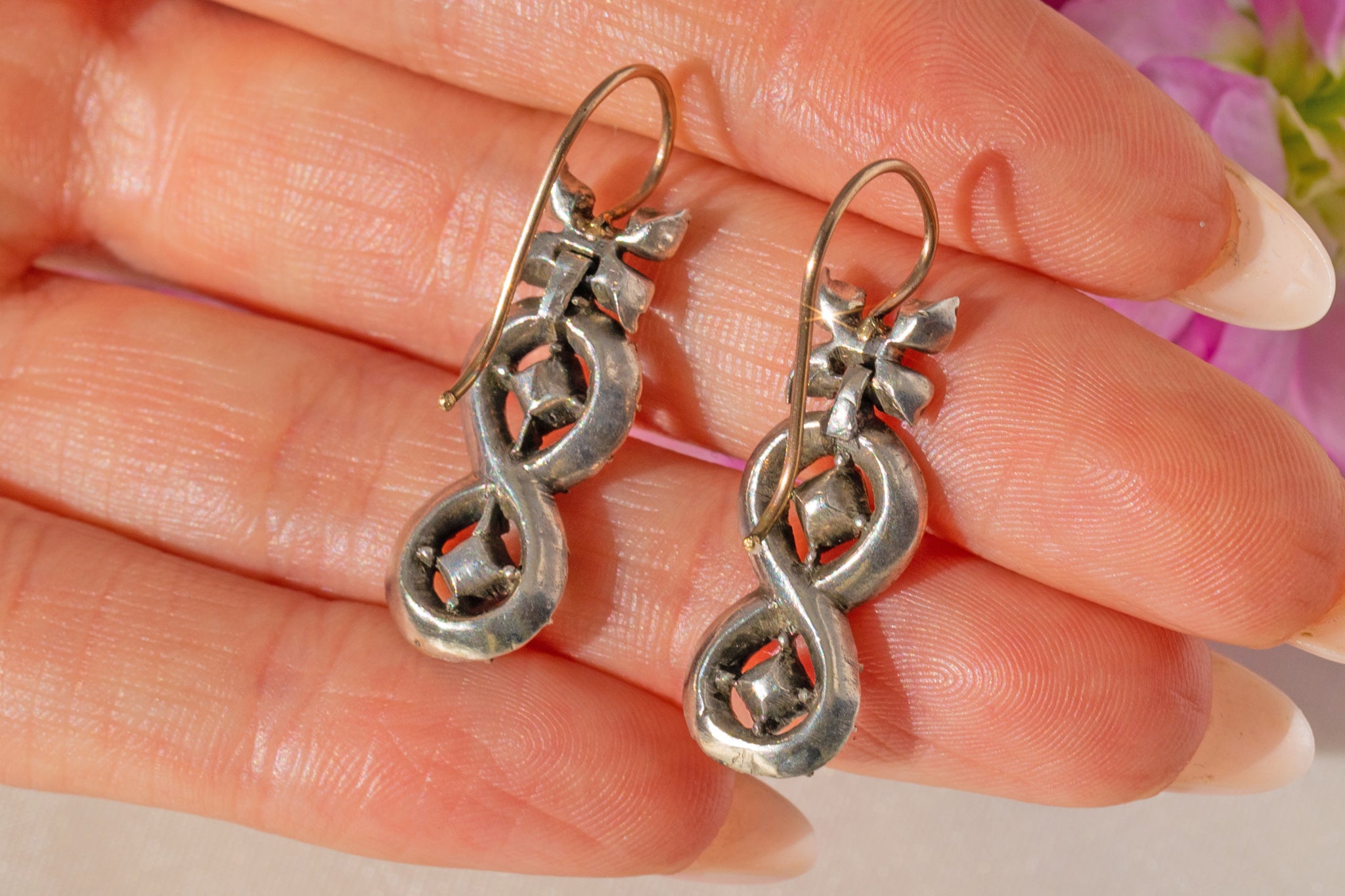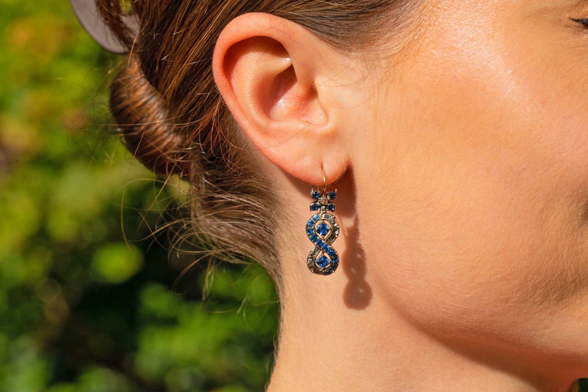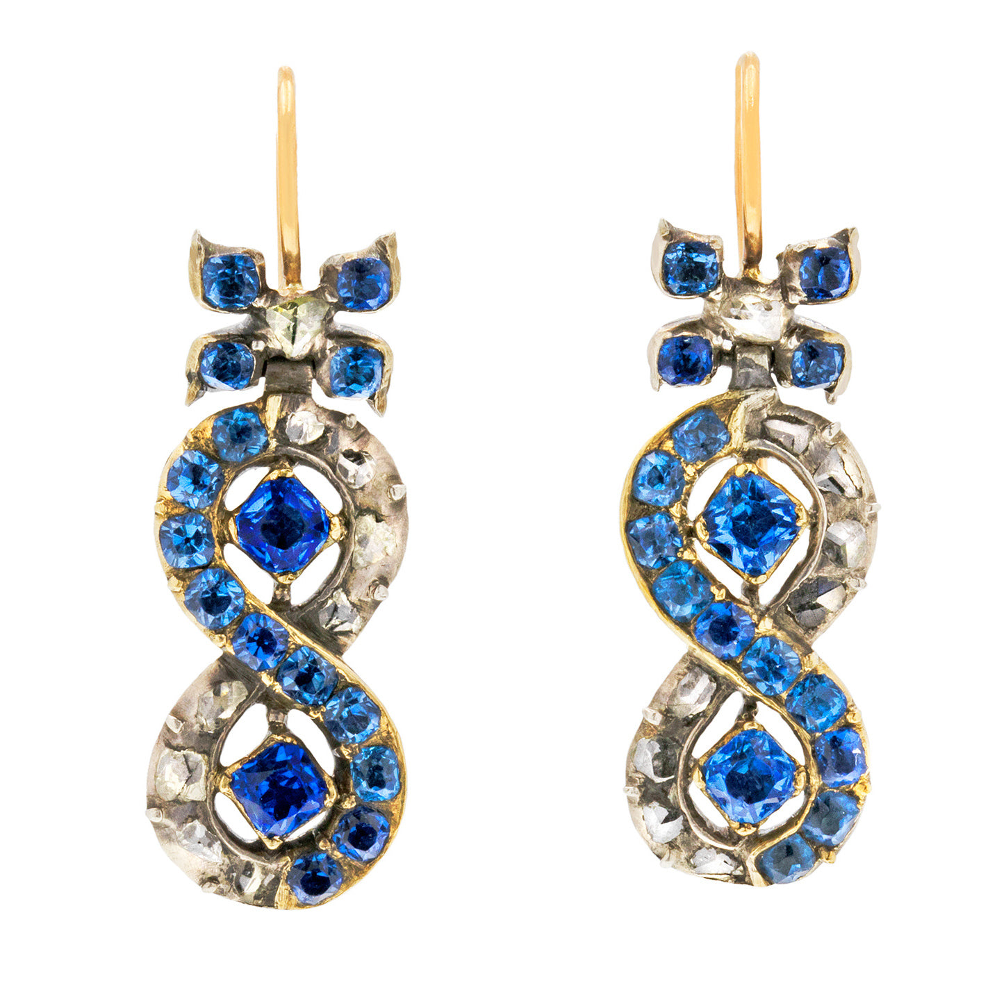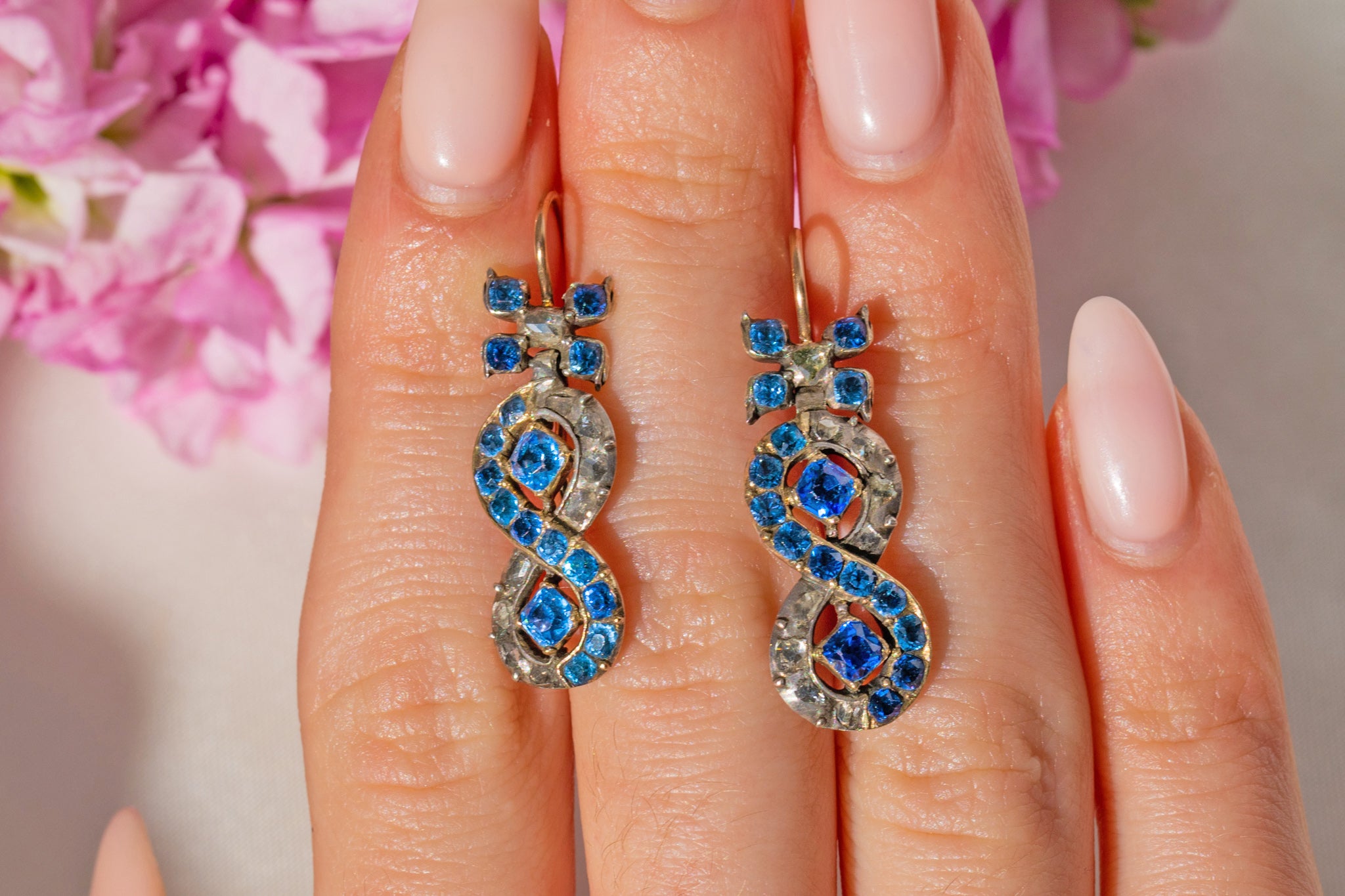 Feast your eyes on this pair of Georgian rose-cut Diamond & blue Paste infinity drop earrings! Steeped in symbolism, this impressive pair of Georgian earrings prove that age is just a number, made circa 1800 and still looking just as good today as when they were first created.