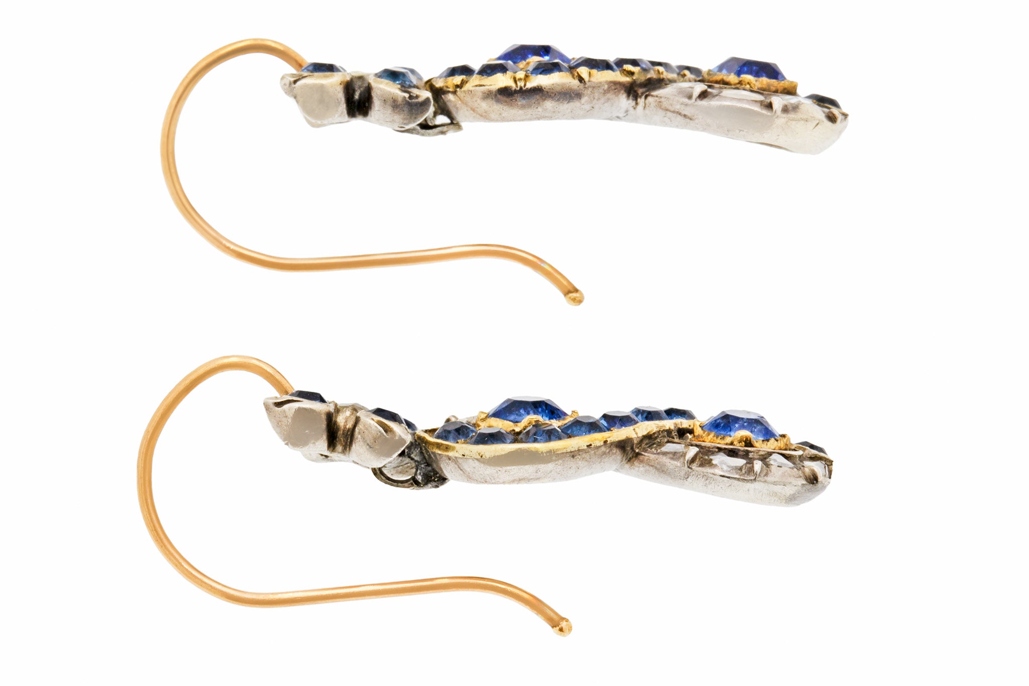 MATERIALS: Tests as 9ct Gold hooks, Sterling Silver settings, Rose-cut Diamonds (natural), Blue Sapphire Paste.