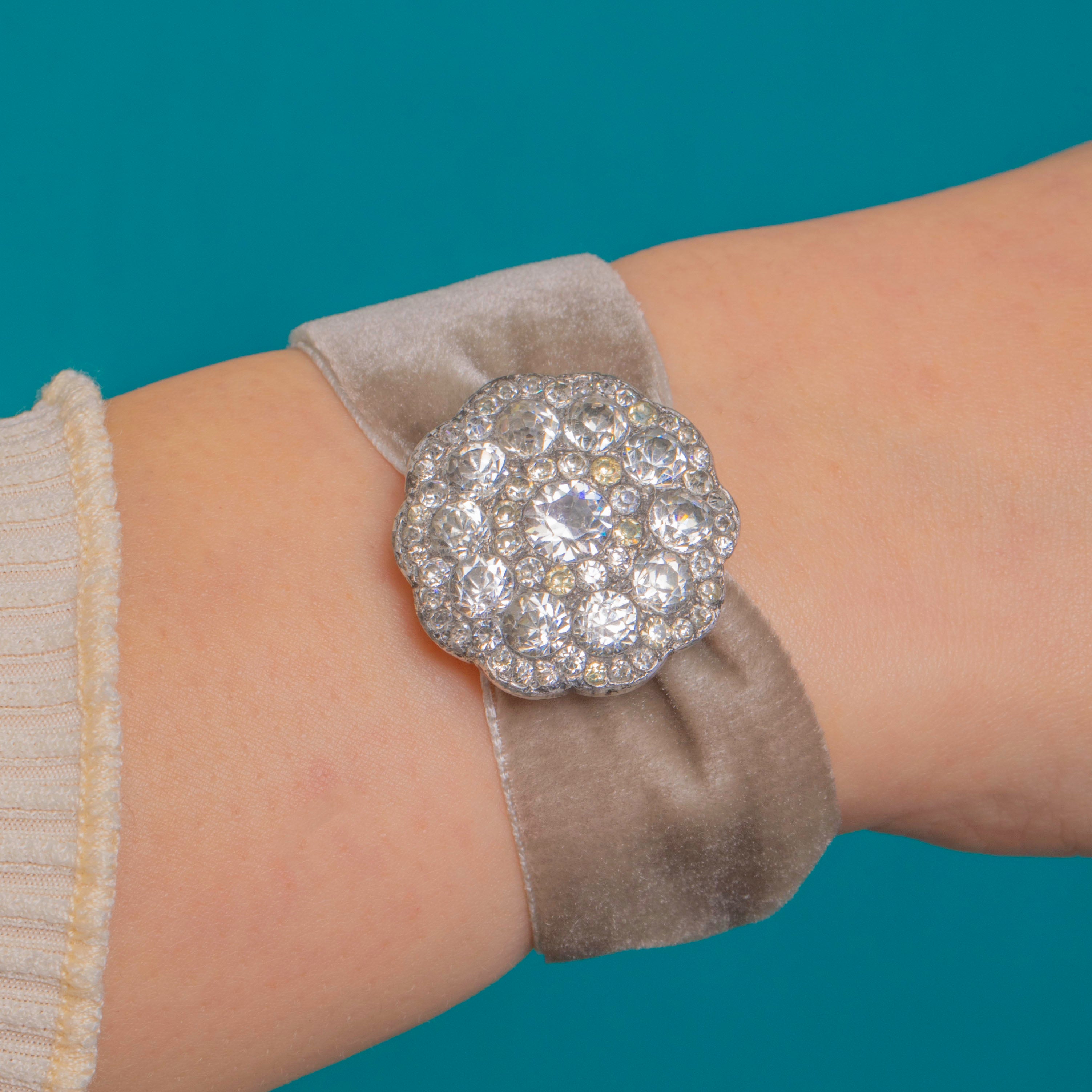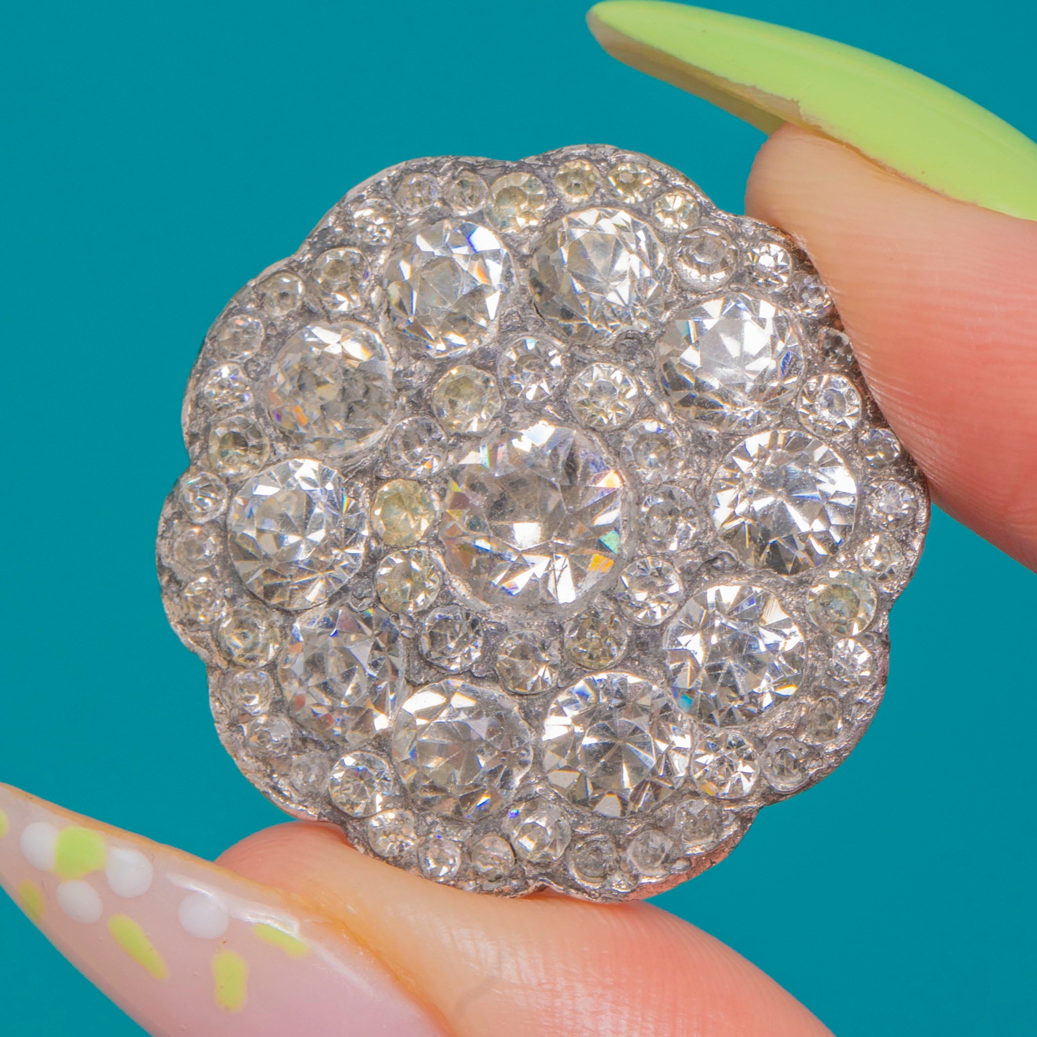 The circular floral design feels both balanced and striking, with the graduated stones forming a radiant focal point. Pieces such as this were often worn threaded onto ribbons, allowing the jewel to glide gracefully along the neckline and catch the light with every movement.