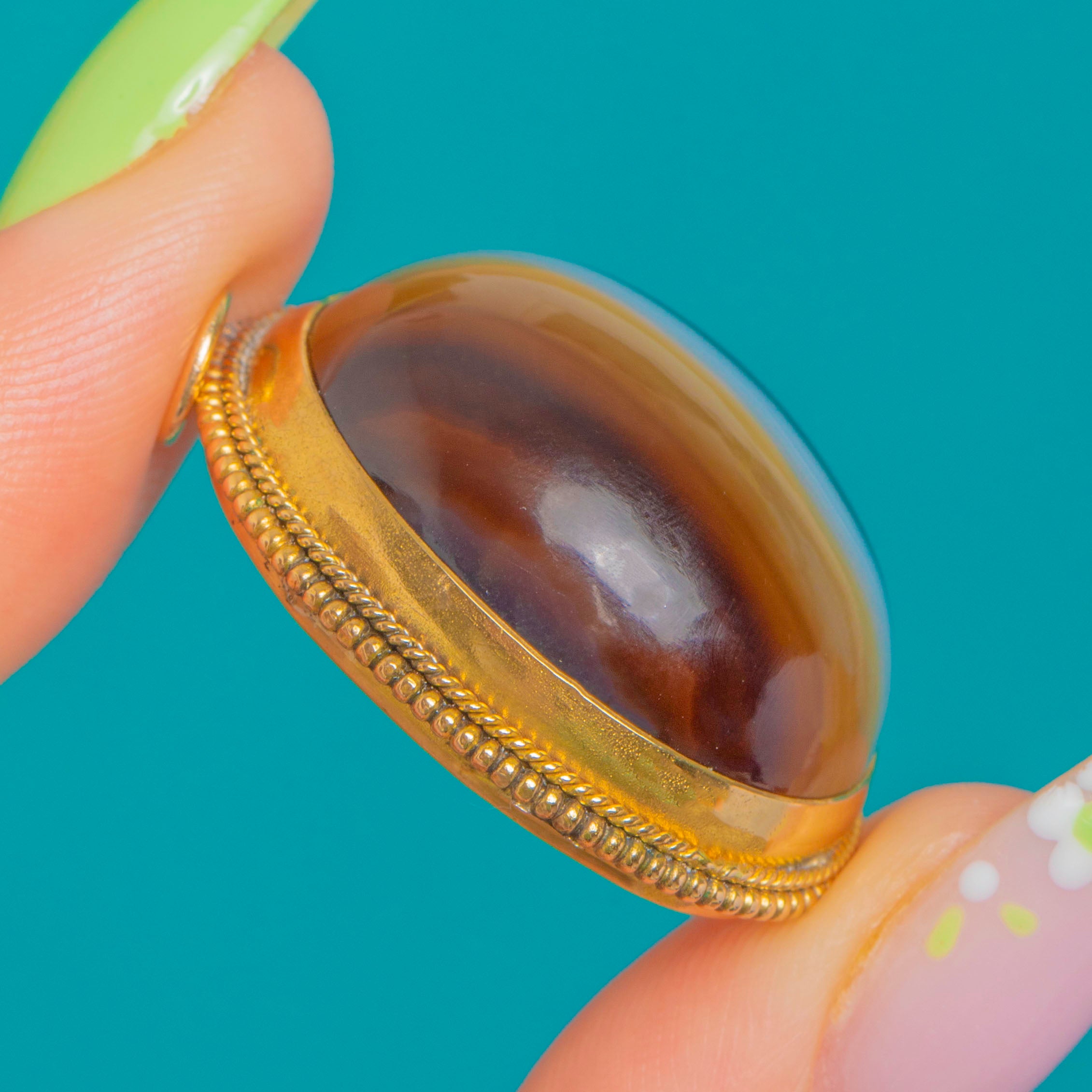 Glowing ribbons of chocolate, caramel and cream sweep across this luscious Banded Agate cabochon, its high dome polished to a sleek sheen. The stone sits in a smooth closed-back bezel and is framed by a refined twisted-rope border, a timeless Victorian flourish rendered in Gold-gilded Silver.