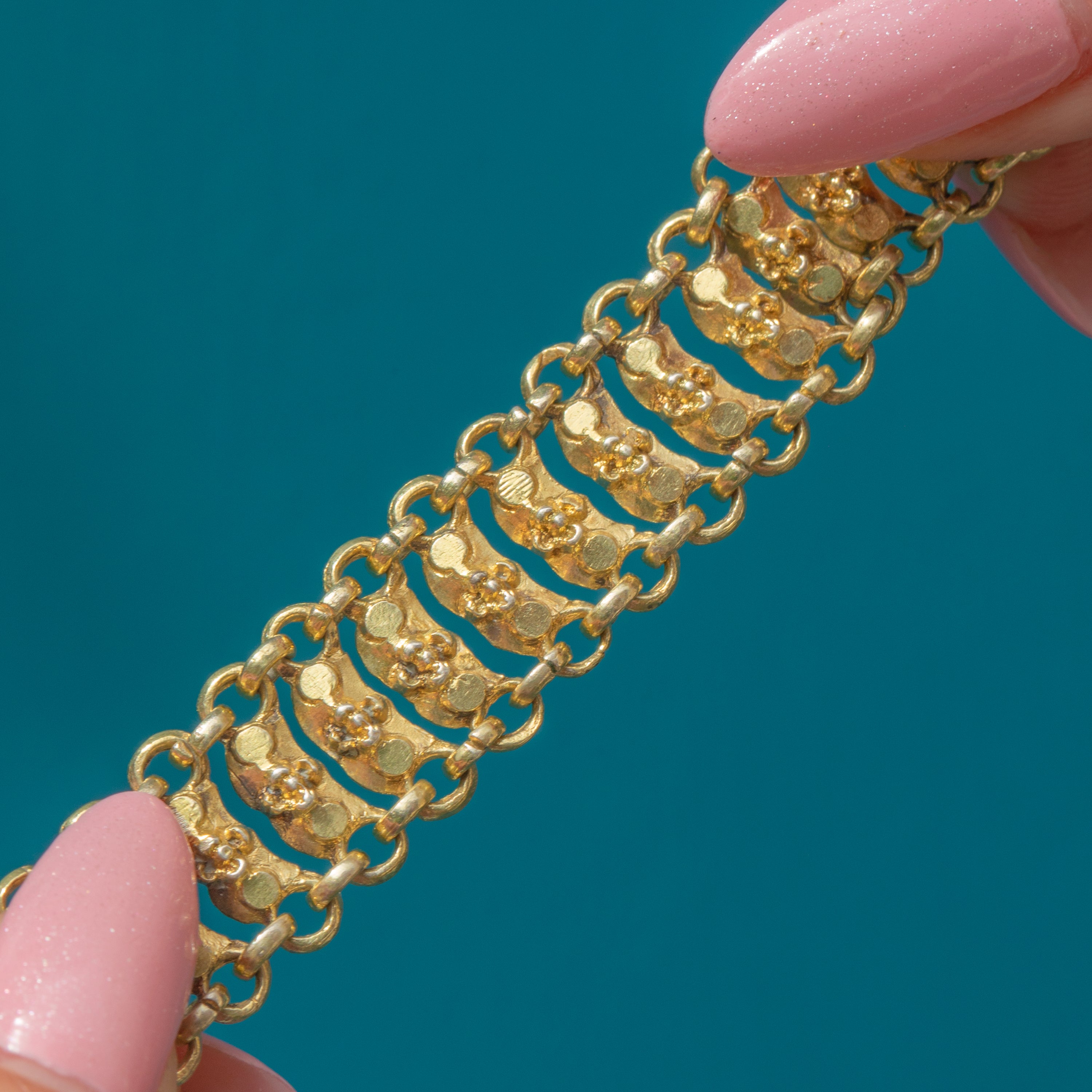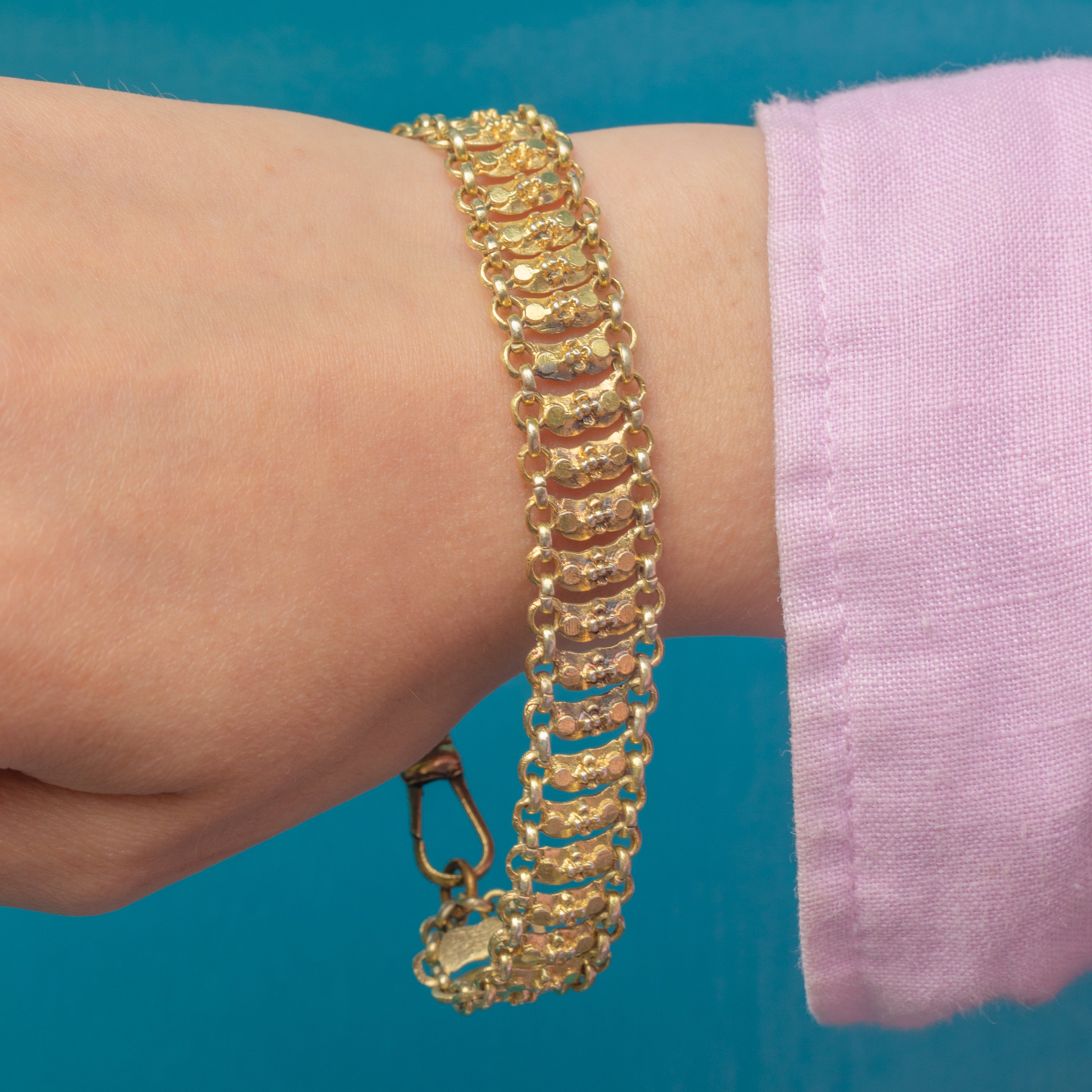 GOOD. This Gold toned floral bracelet is in very good condition! The bracelet has a lovely even texture, with only some minor discolouration in one portion of the bracelet - but the design of the bracelet is forgiving so it's not super visible. The dog-clip works beautifully, and you can wear the piece confidently.