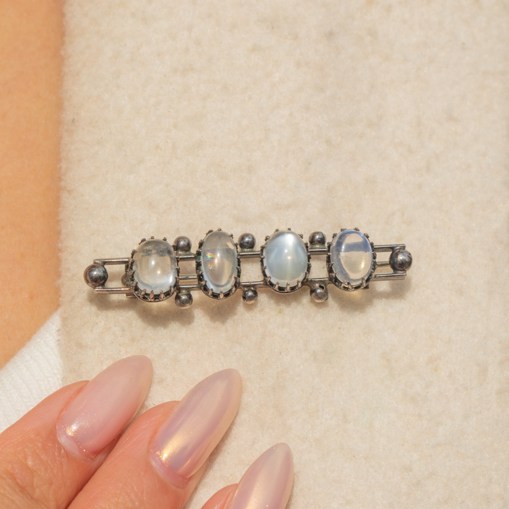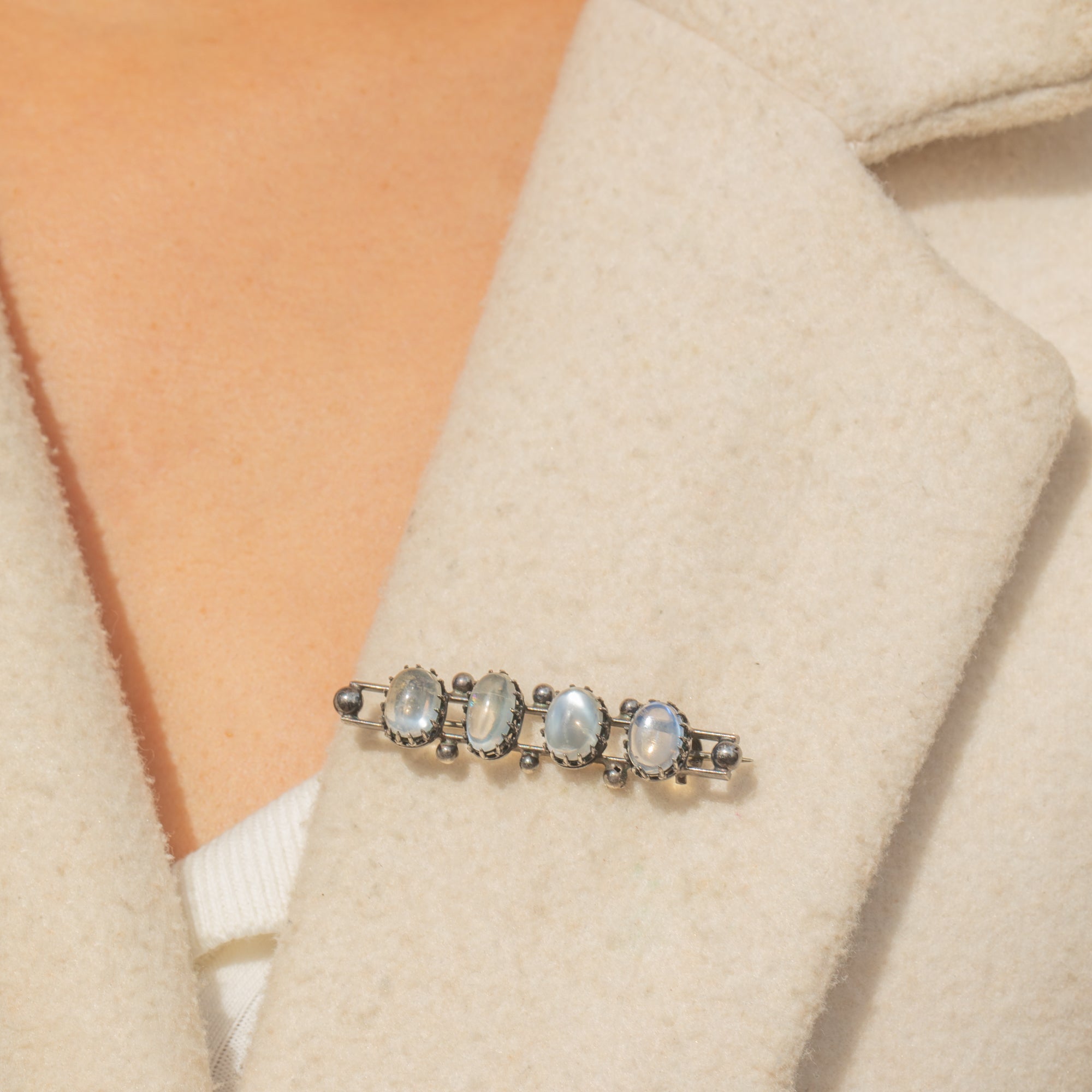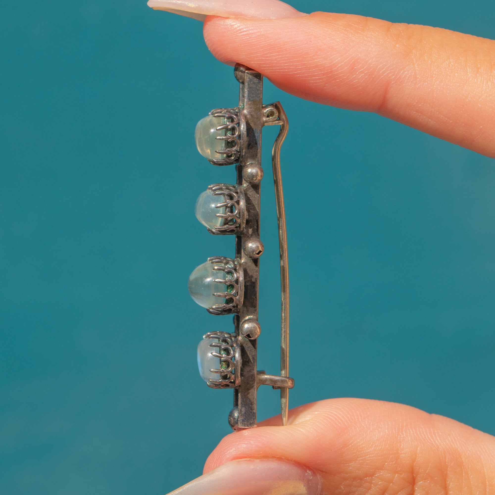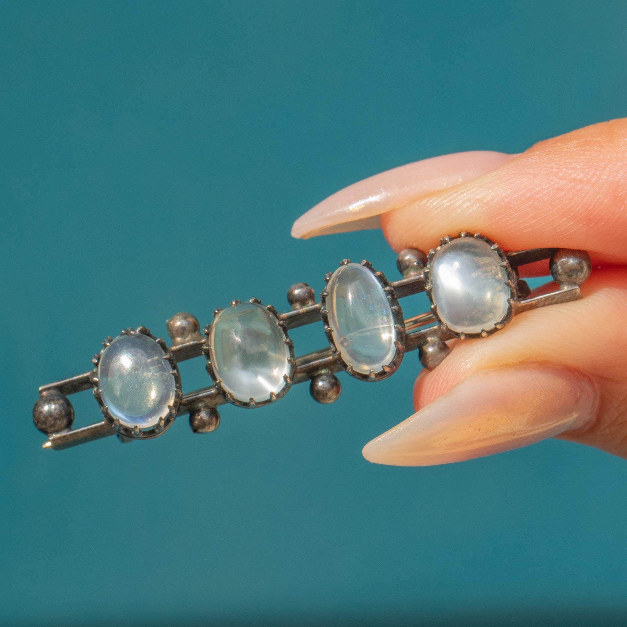 This Antique Victorian bar brooch is set with four luminous Ceylon Moonstones, each with its own unique shape and ethereal glow. Graduating in size, the cabochons are mounted in striking crown-like claw settings that lend the piece a distinct Gothic Revival look. The Silver has developed a dark patina over time, beautifully contrasting the Moonstones’ silvery-blue adularescence.