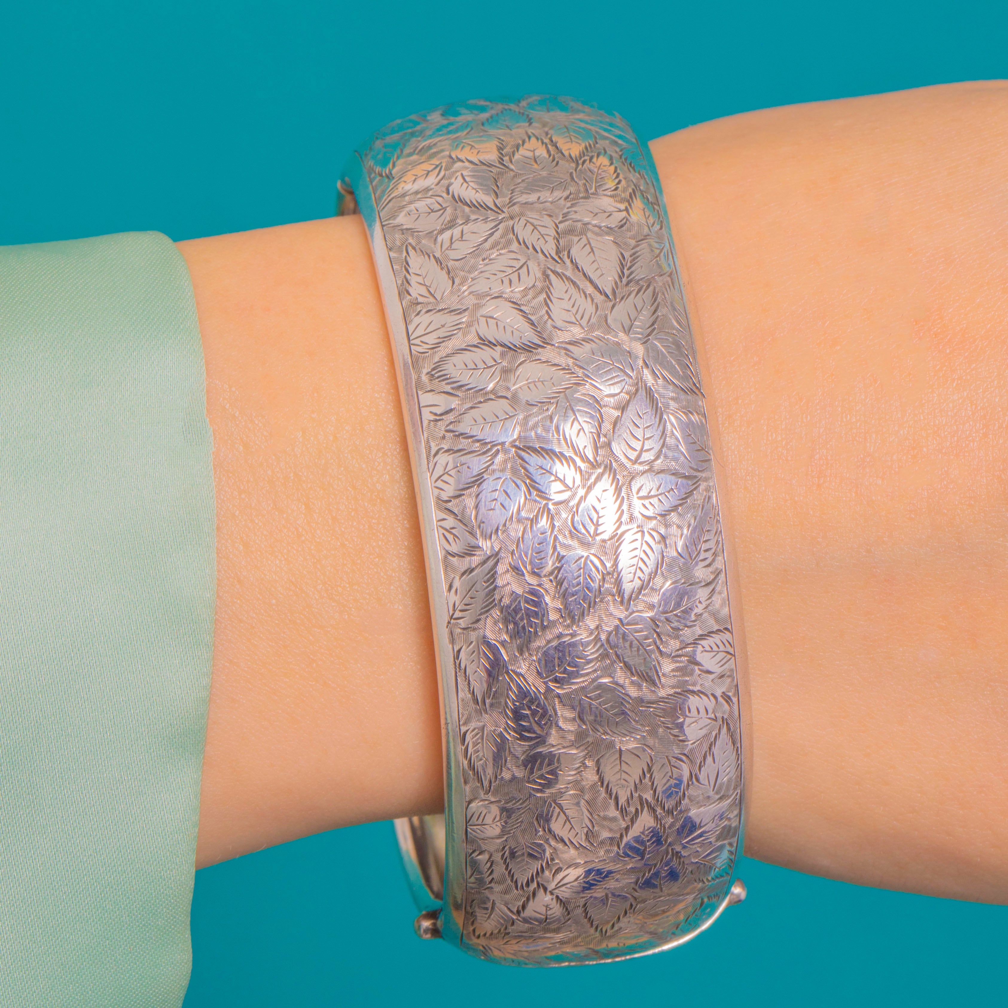 Alive with late Victorian charm, this wide Silver hinged bangle is richly bright‑cut with lush foliate engravings, framed by smooth rolled edges for a beautifully refined finish. Its domed profile and statement width create a bold botanical sweep of light and shadow across the wrist.