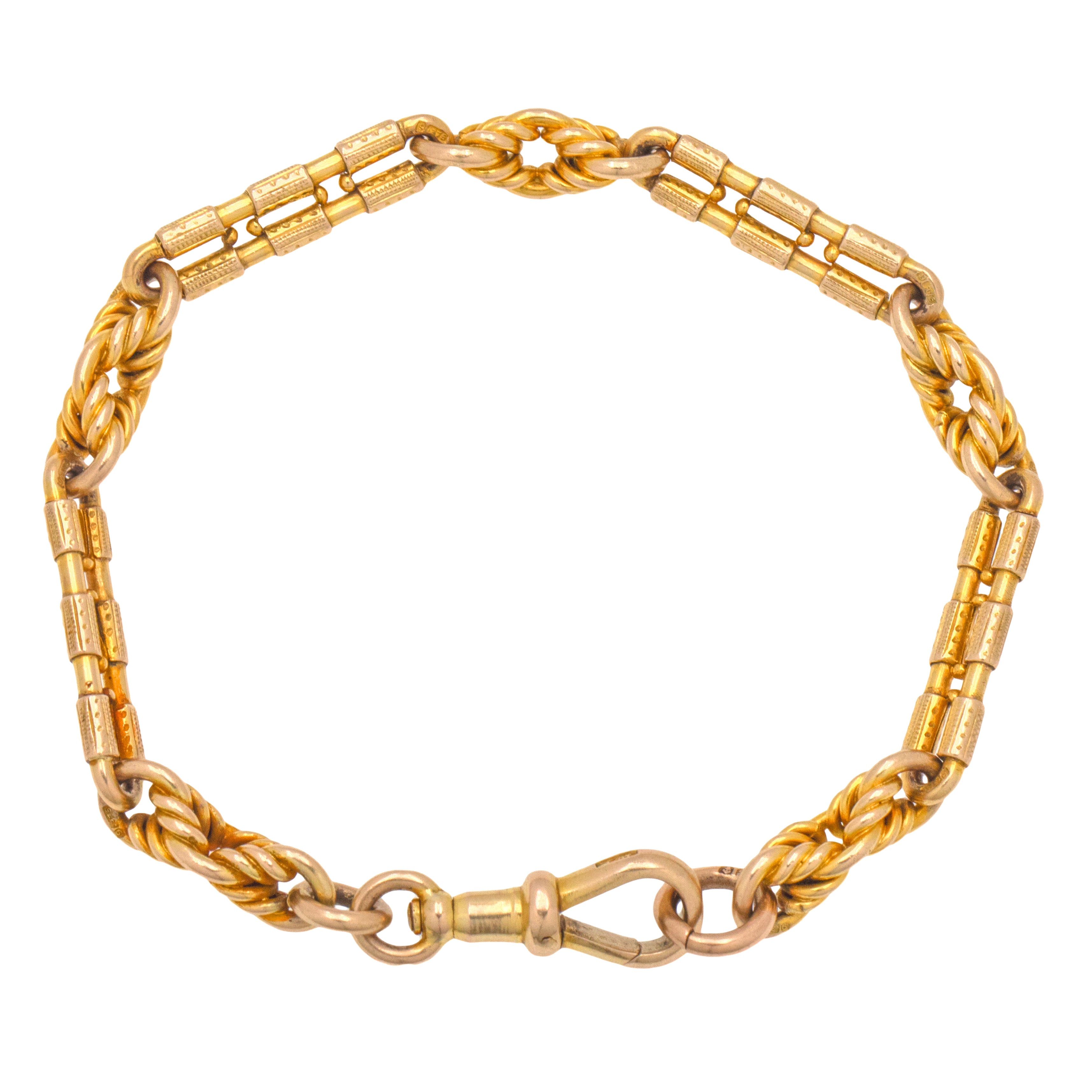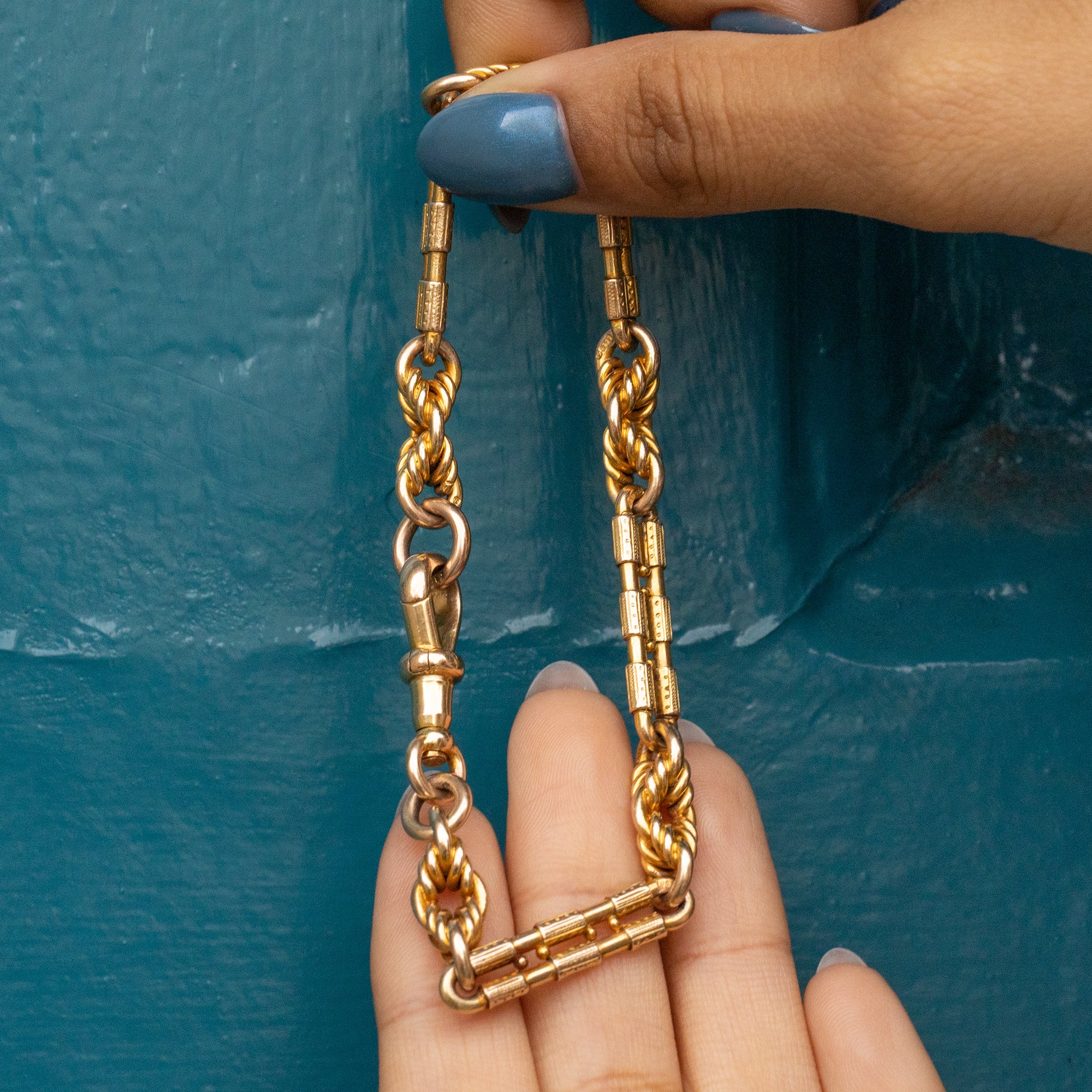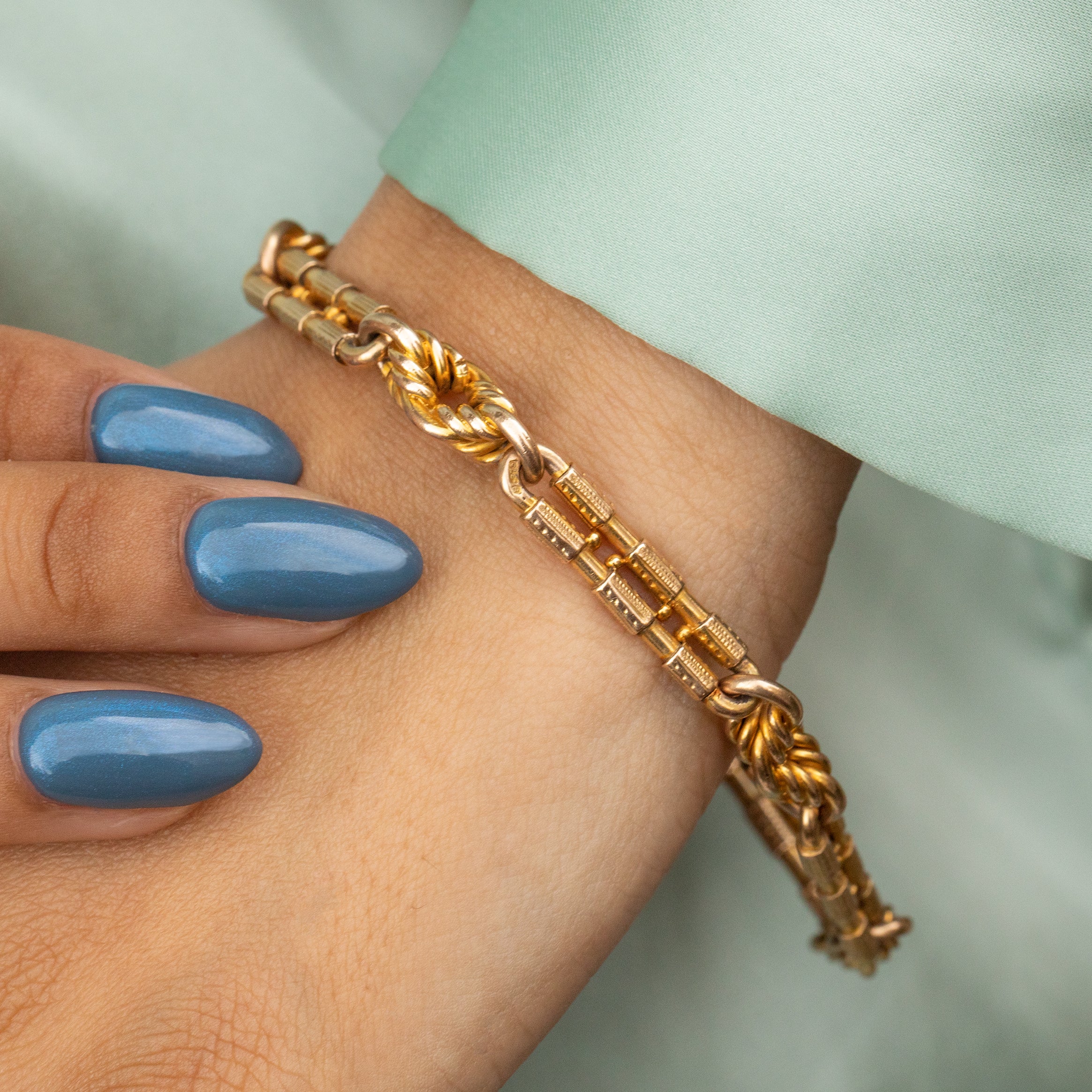 Feast your eyes on this heavy Victorian 9ct Gold textured trombone link bracelet! Allow 26g of pure 9ct Golden goodness to effortlessly drape around your wrist, with her lover's knot links interlinking beautifully with the chunky trombone links, affixed with an antique dog-clip.