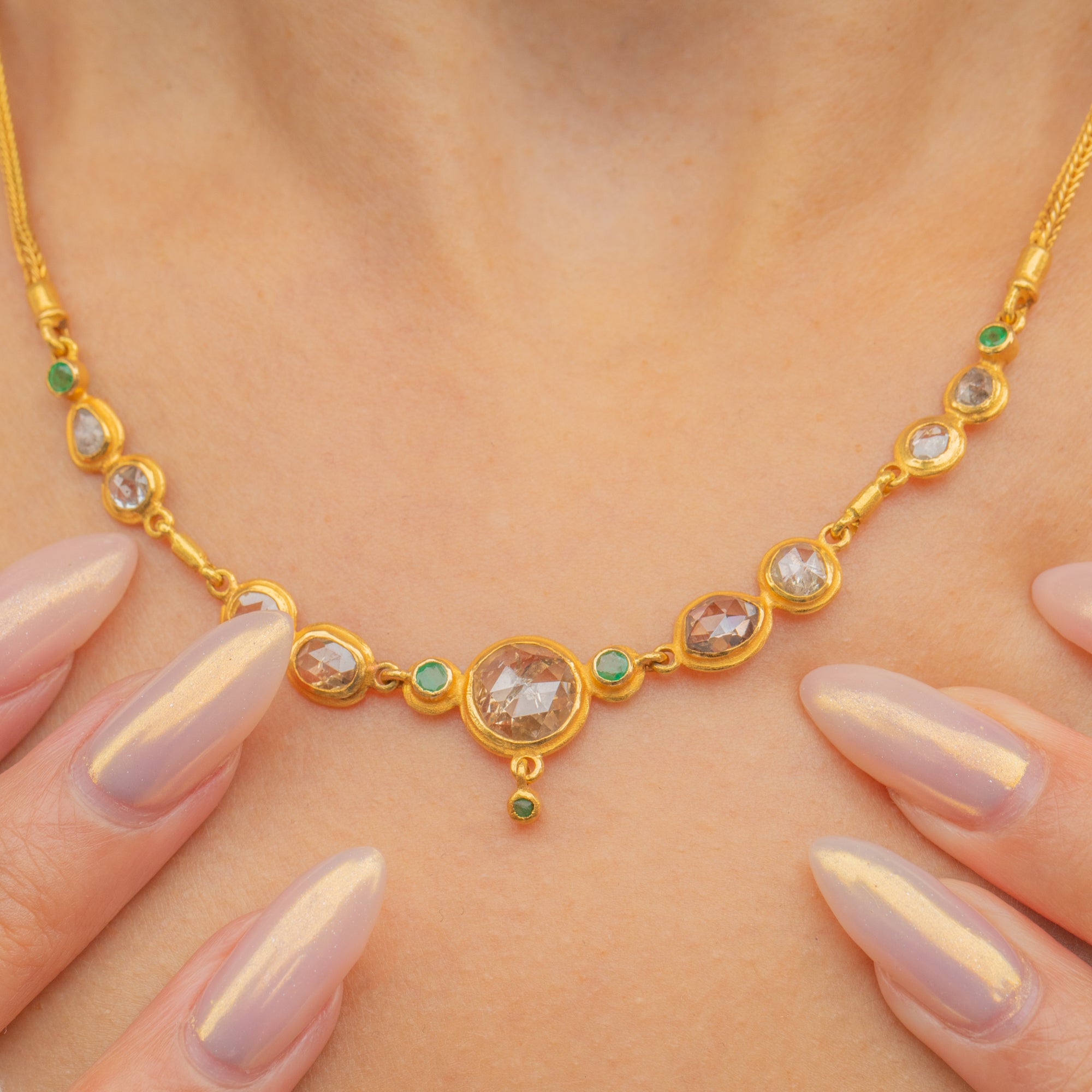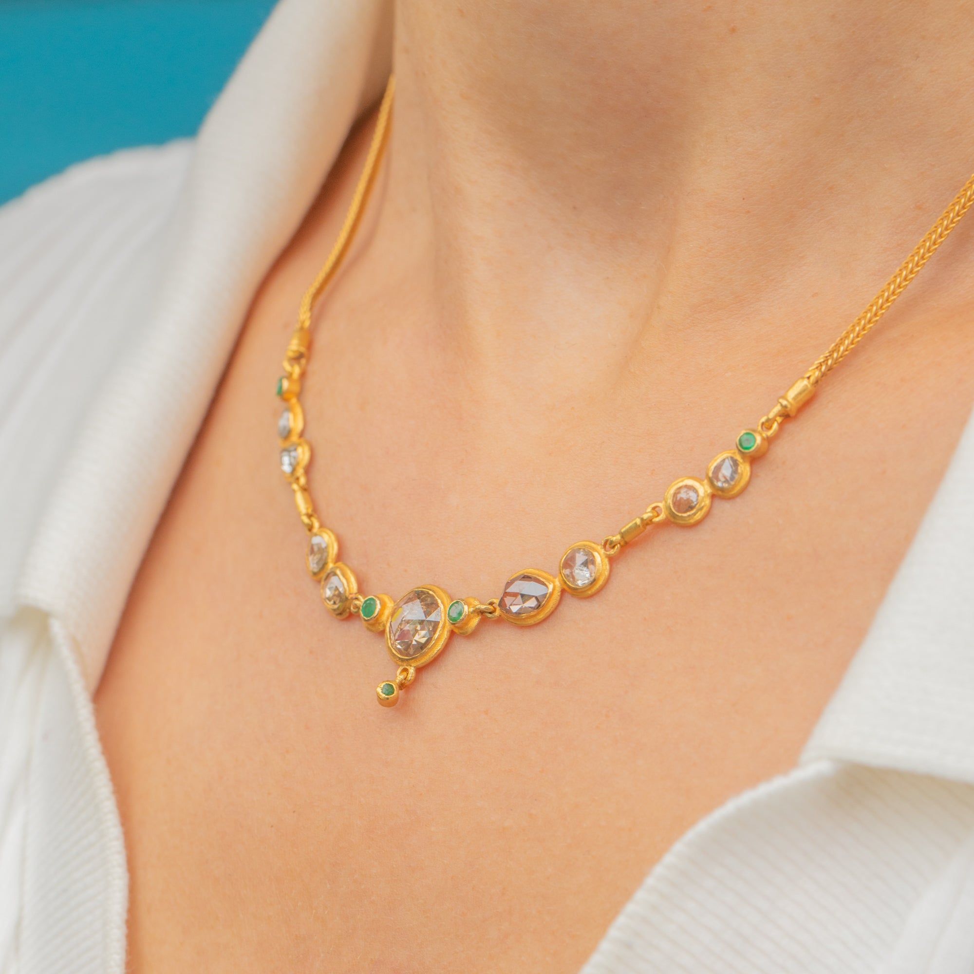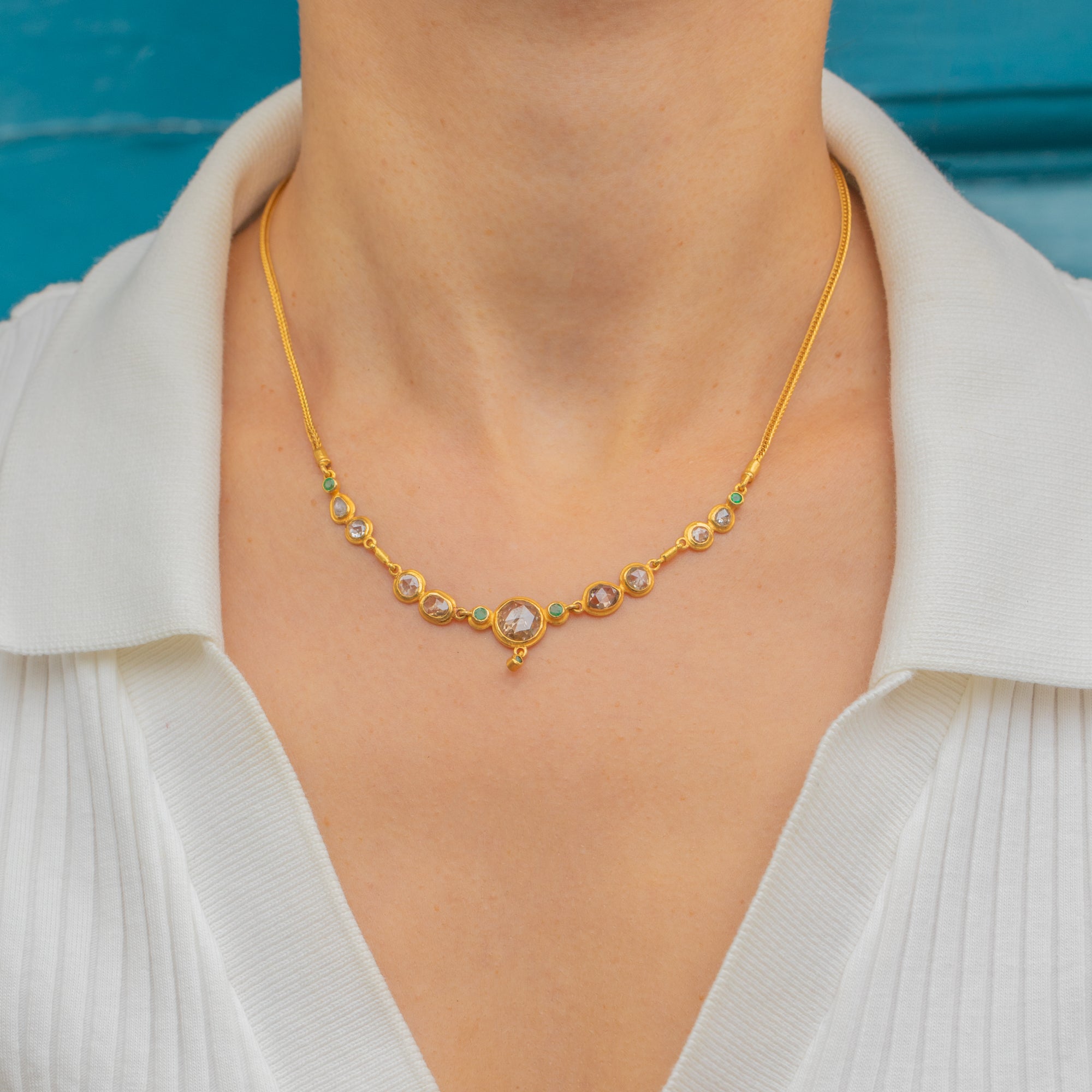 This spectacular necklace is crafted in high-carat Gold and set with a series of rose-cut Diamonds, accented by vibrant Emeralds. The design features nine uniquely shaped Diamonds, each with individual charm and antique character, ranging in hue from silvery-white to warm cognac. At the centre sits a bold 7.4mm rose-cut Diamond, flanked by a pair of darker, oval-shaped stones and finished with a delicate Diamond drop below, giving the necklace a graceful sense of movement.