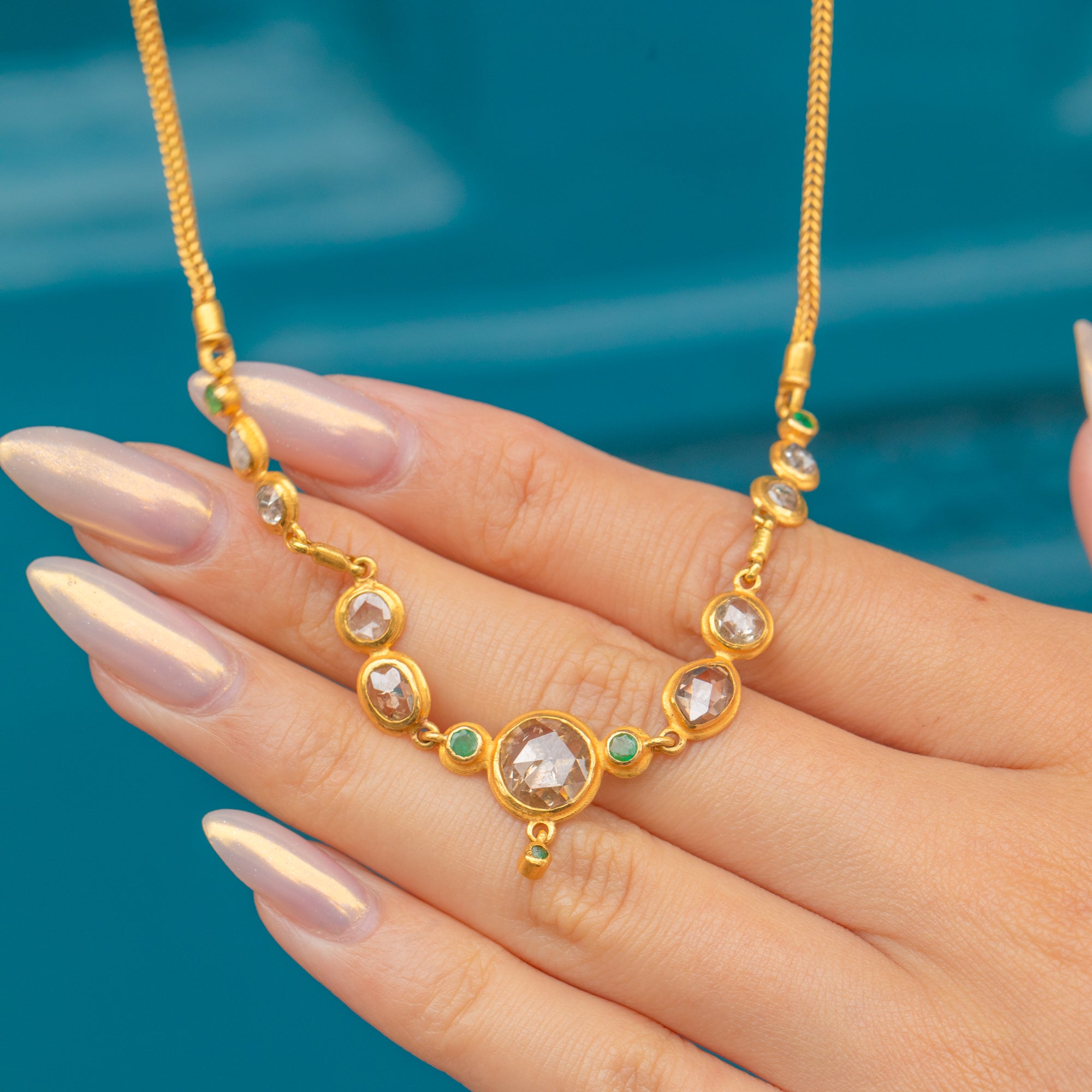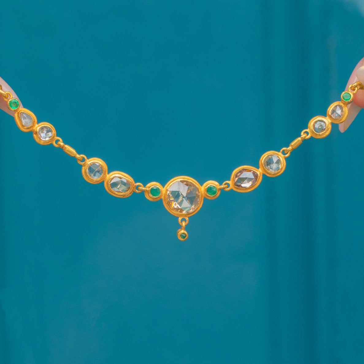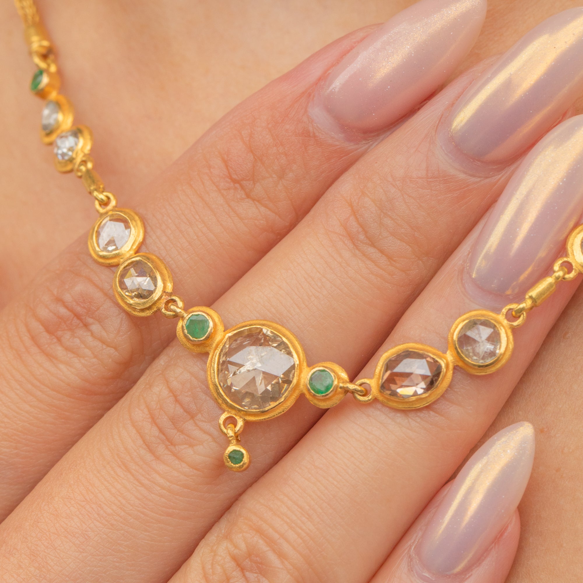 This spectacular necklace is crafted in high-carat Gold and set with a series of rose-cut Diamonds, accented by vibrant Emeralds. The design features nine uniquely shaped Diamonds, each with individual charm and antique character, ranging in hue from silvery-white to warm cognac. At the centre sits a bold 7.4mm rose-cut Diamond, flanked by a pair of darker, oval-shaped stones and finished with a delicate Diamond drop below, giving the necklace a graceful sense of movement.