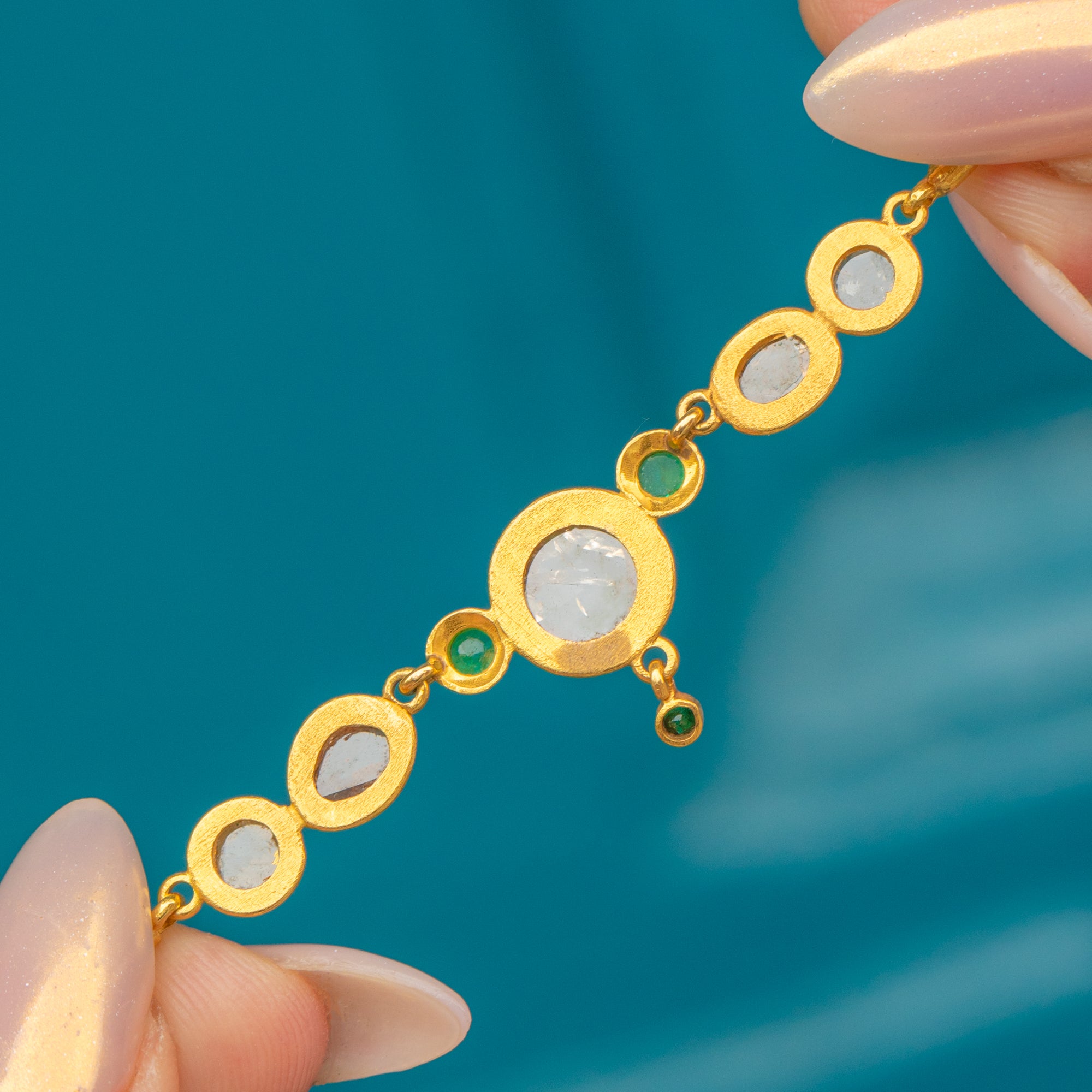 MATERIALS: Tests as 15/16ct Gold chains, 15ct Gold fittings and clasps, 18ct Gold bezels, Rose-cut Diamonds (approx. 2.50ct), Emeralds