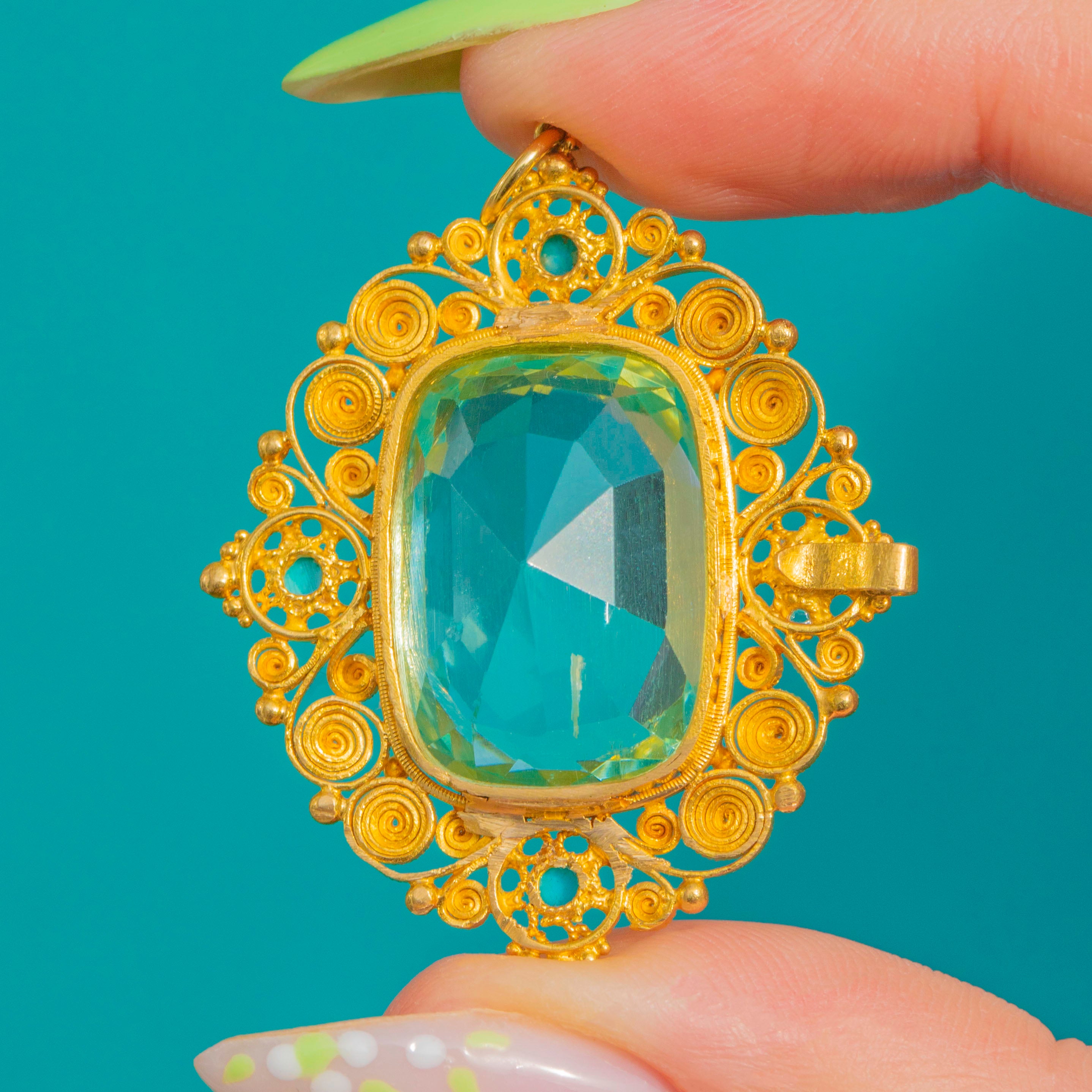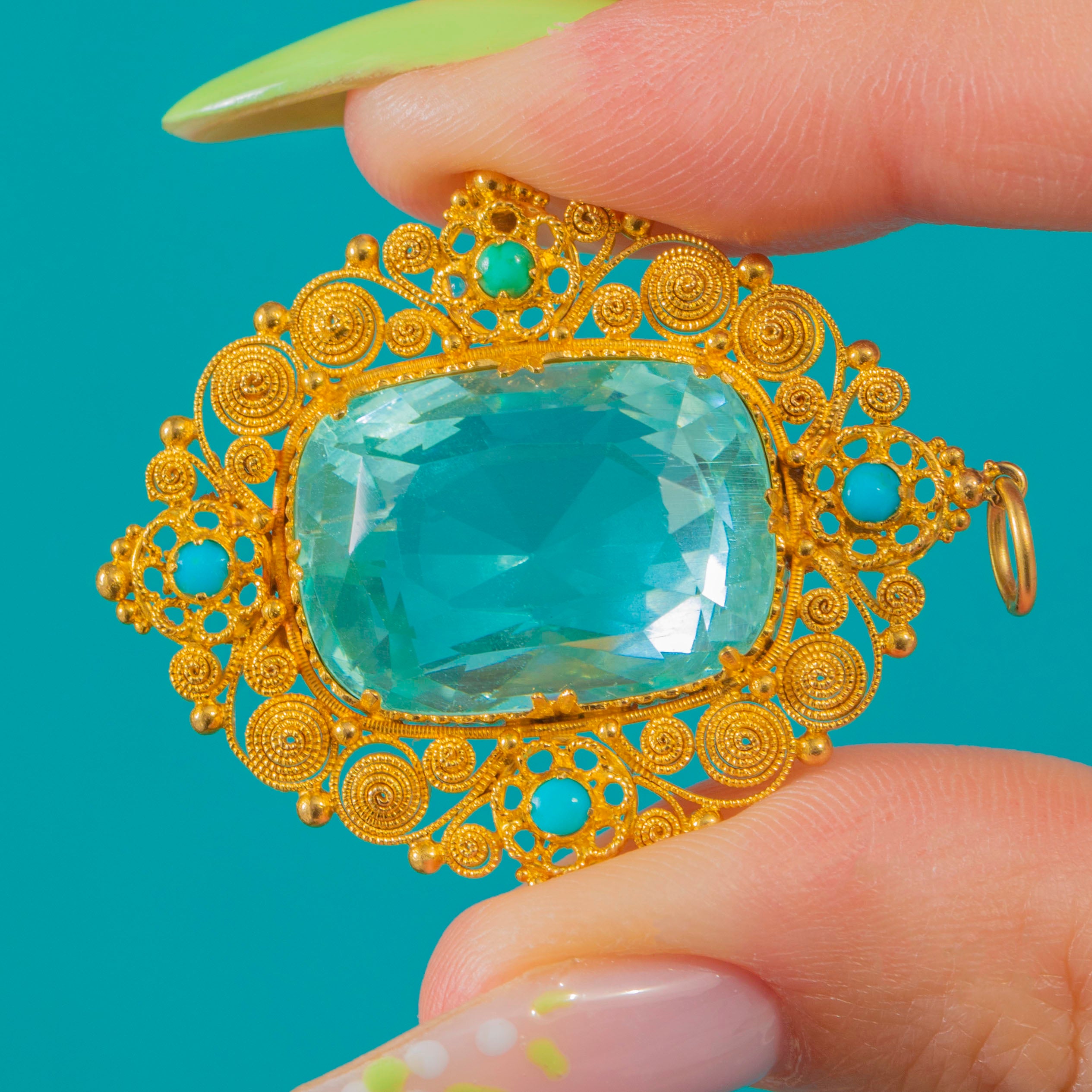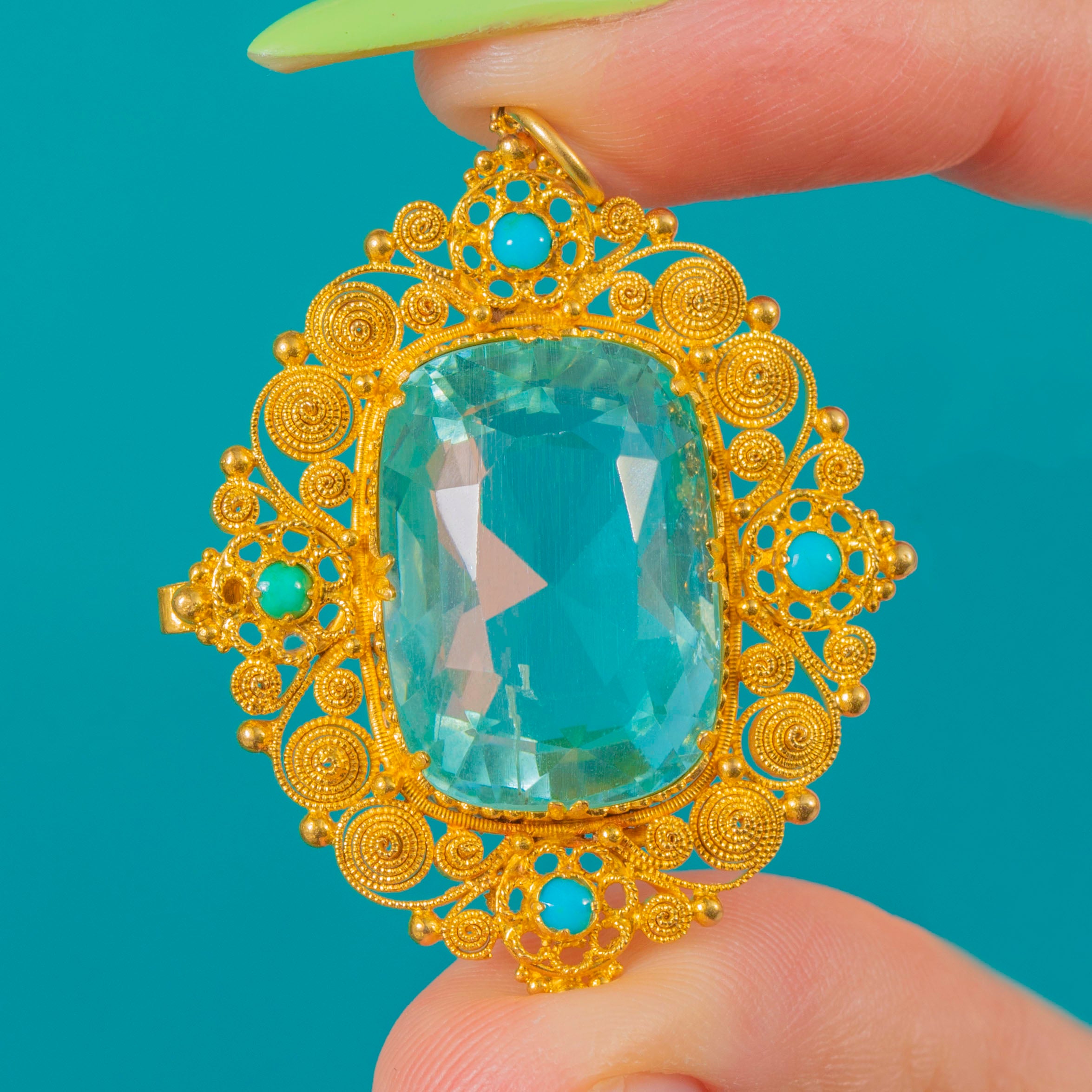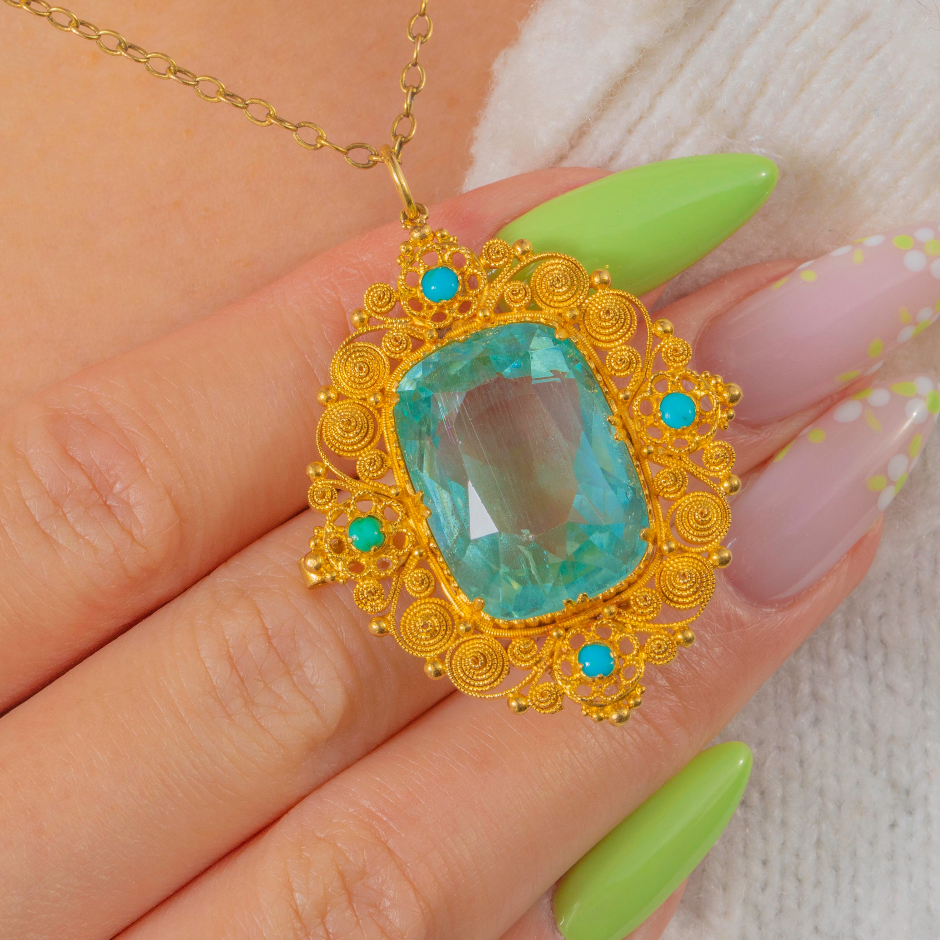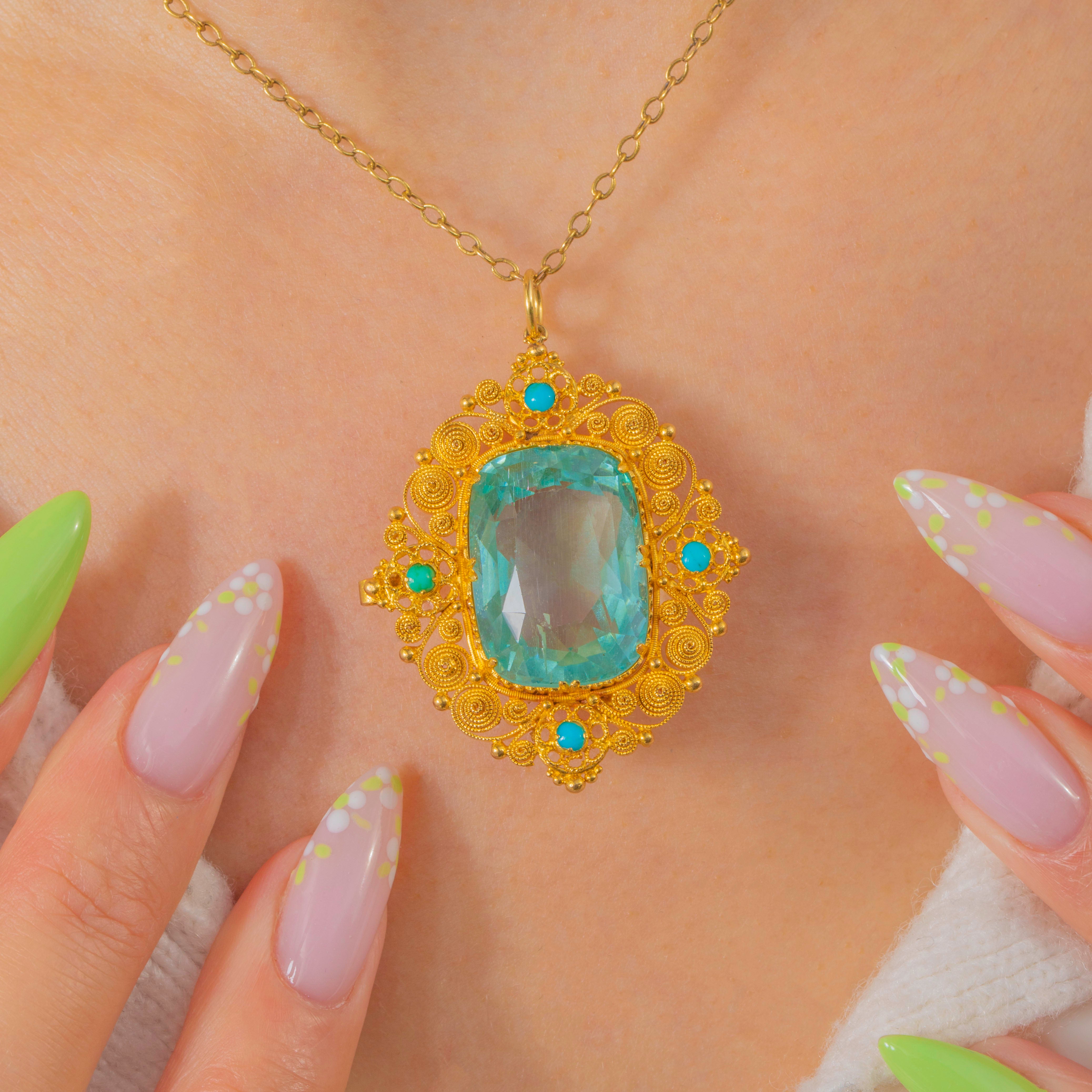 Impressive Georgian 18ct Gold Aquamarine Turquoise Cannetille Pendant, 16.80ct Aquamarine
