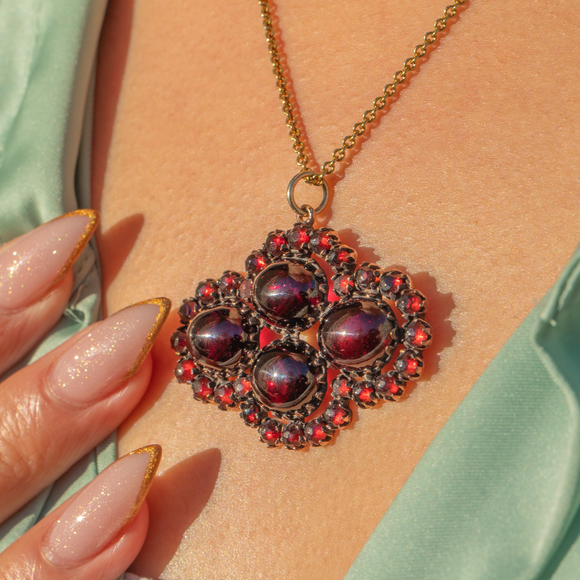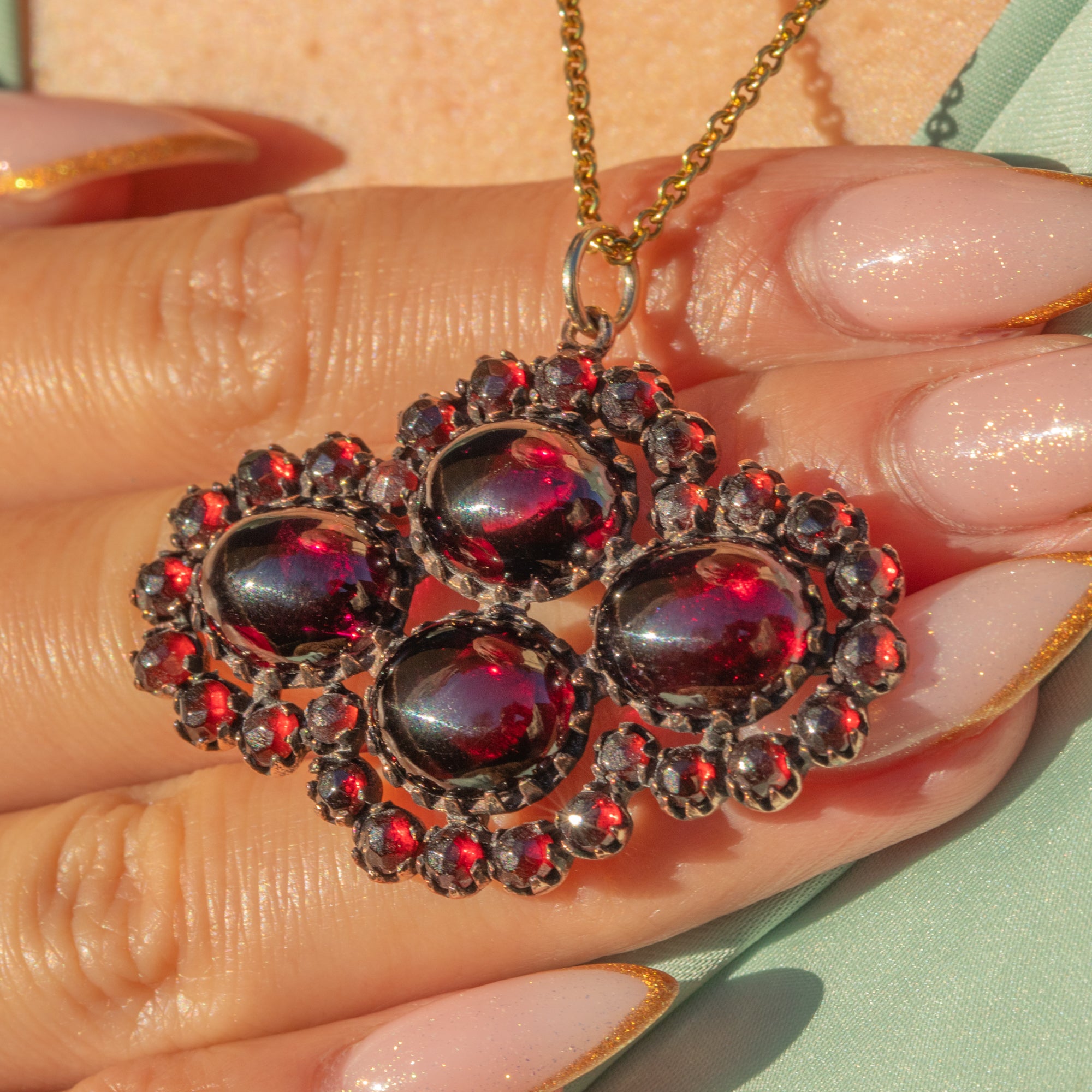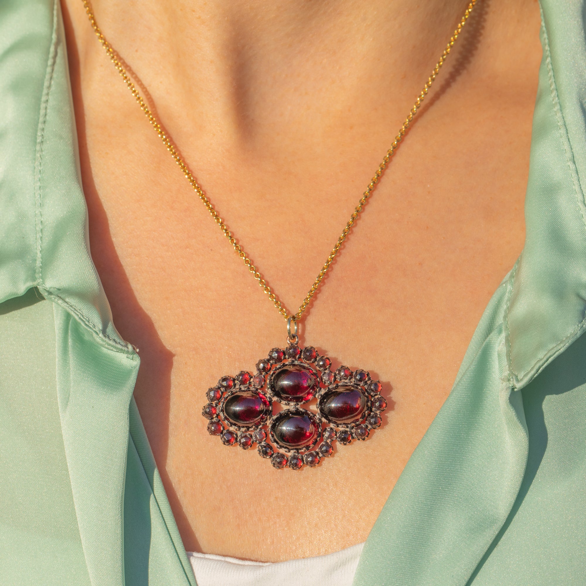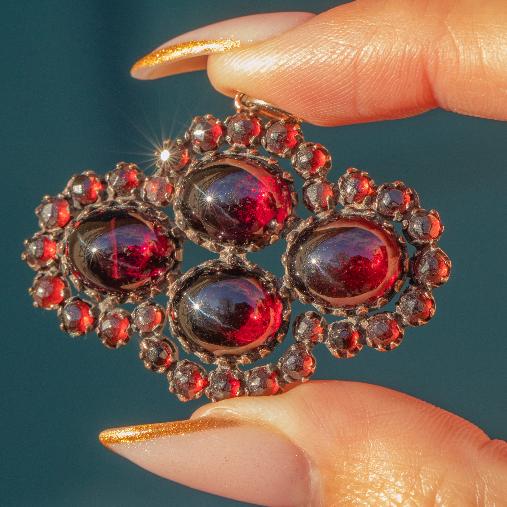 The design showcases both small round Garnets and four larger cabochon stones, giving a lovely mix of sparkle and velvety depth. Finished with a solid 9ct Gold jump ring so it’s ready to hang on your favourite chain, this is a bold, beautifully wearable antique statement pendant.