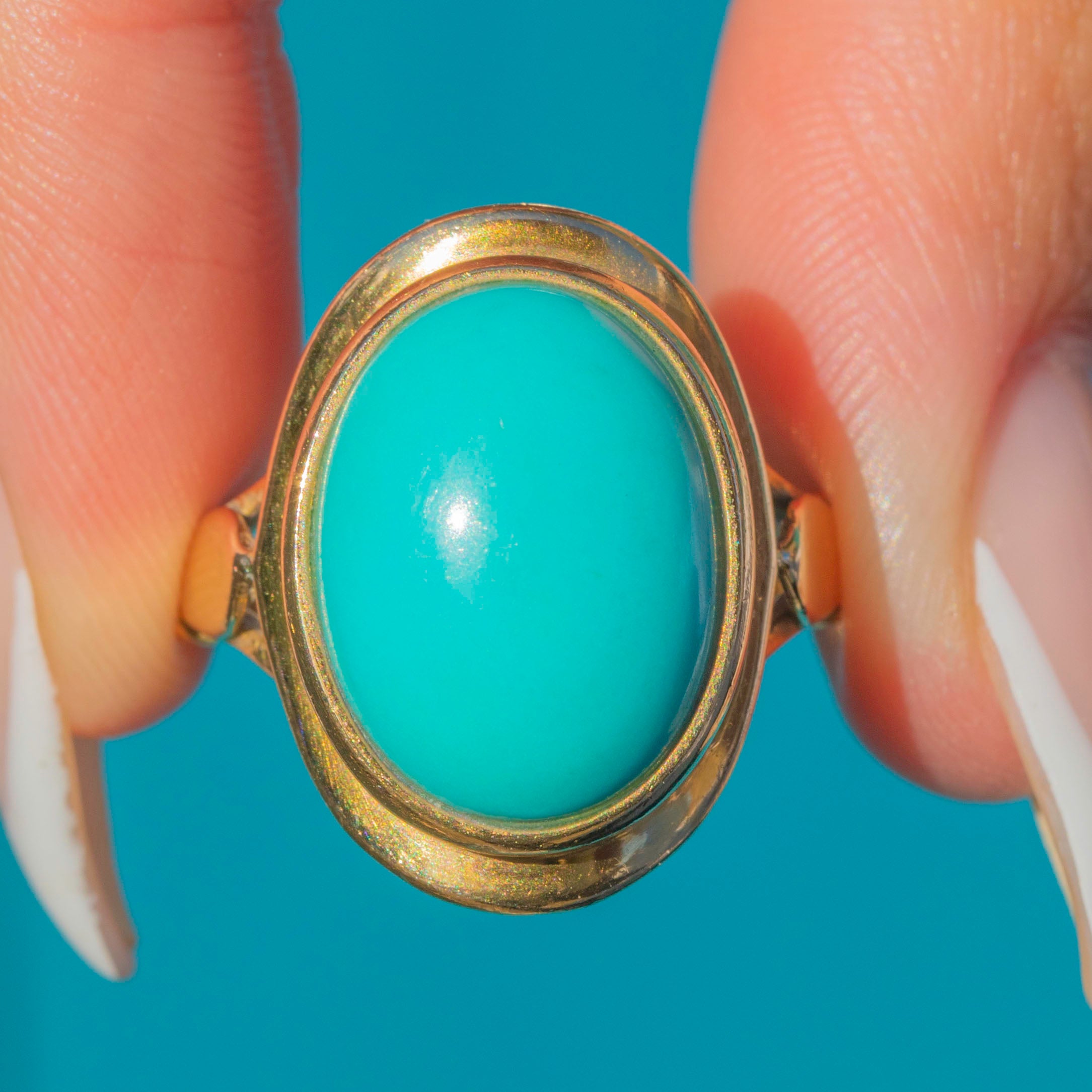 EXCELLENT. The Turquoise is smooth, secure, and free from chips or cracks. The Gold shows only the lightest wear expected of age, retaining its rich colour and fine craftsmanship. A beautifully preserved vintage ring.