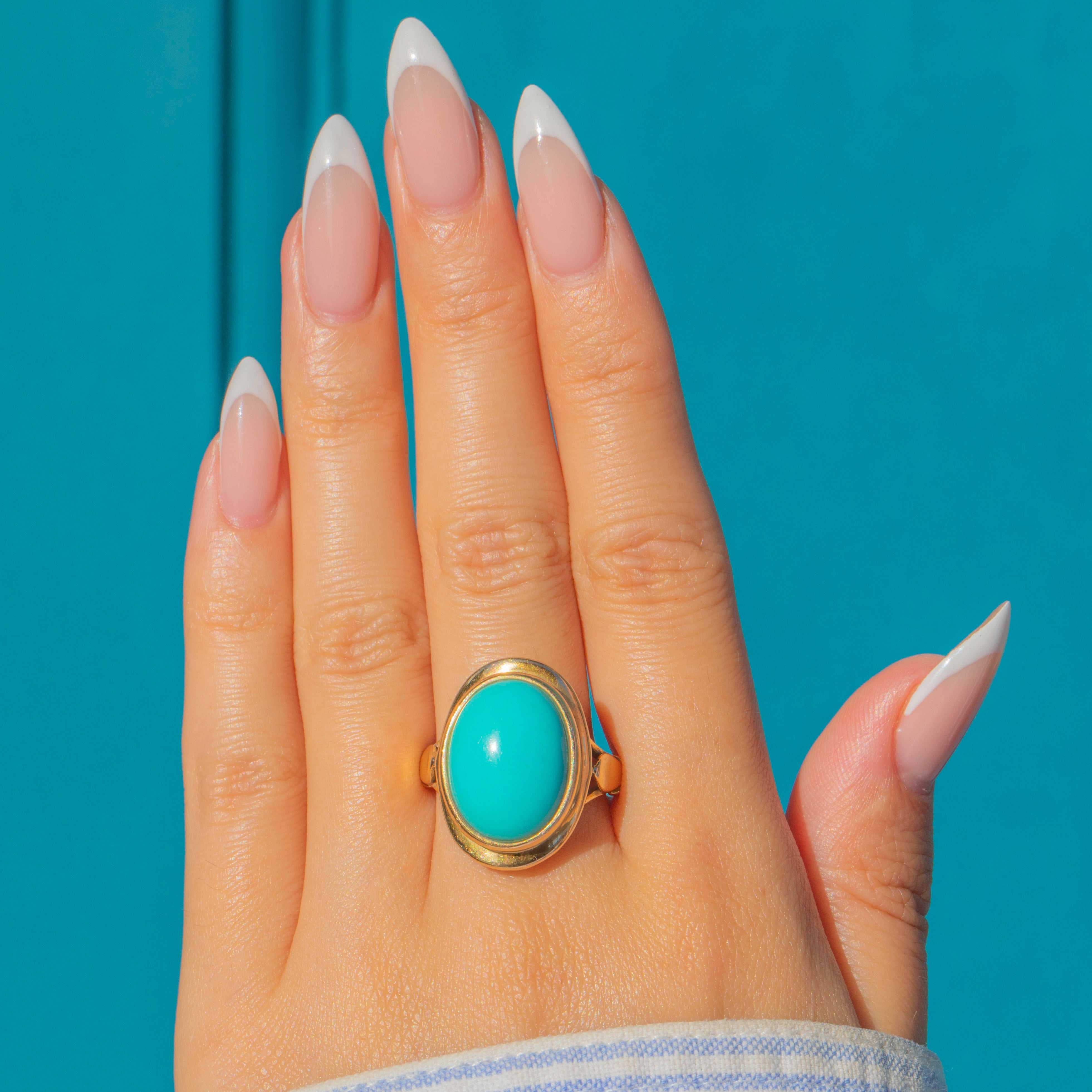 This impressive Mid-Century Vintage ring showcases a vivid Persian Turquoise cabochon in a striking 18ct Gold setting. The large oval stone, with its smooth polish and saturated sky-blue tone, takes centre stage in this bold yet elegant design.