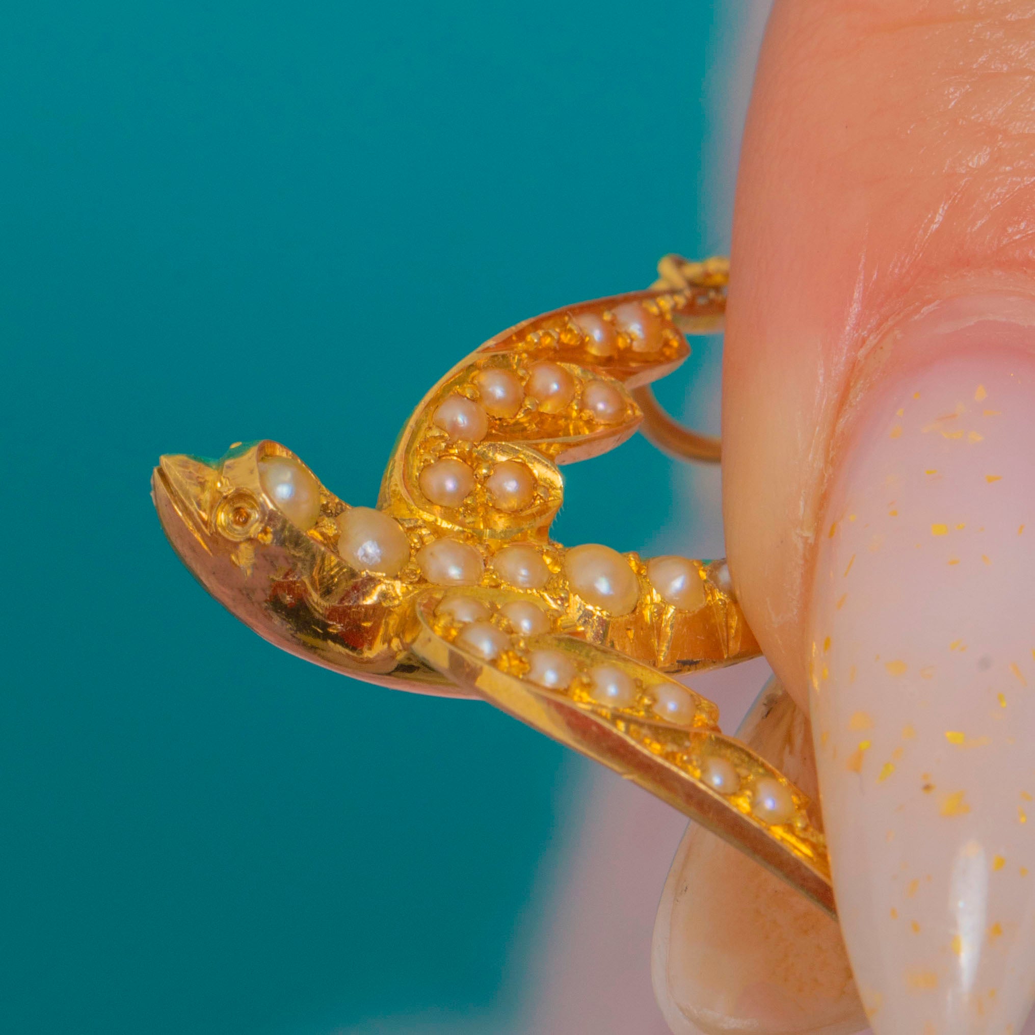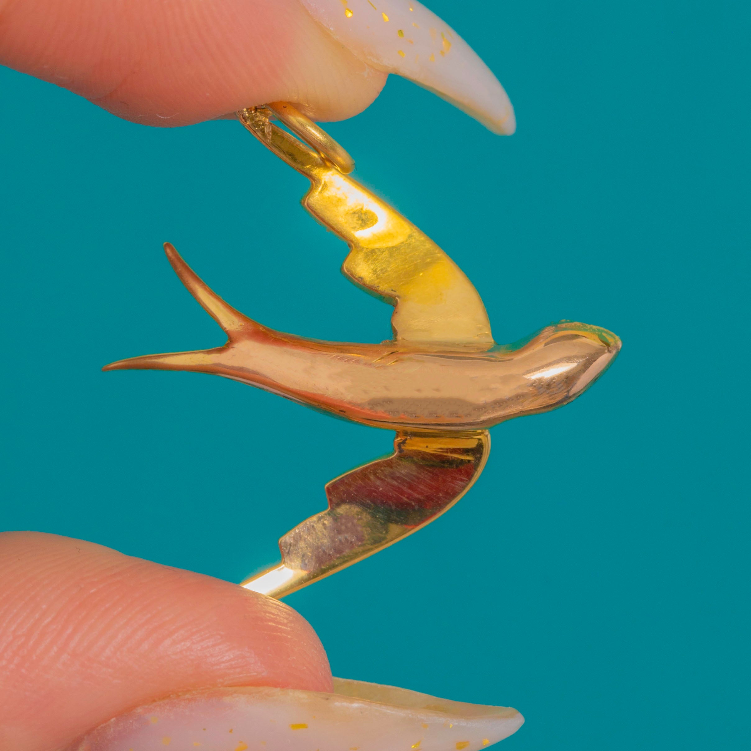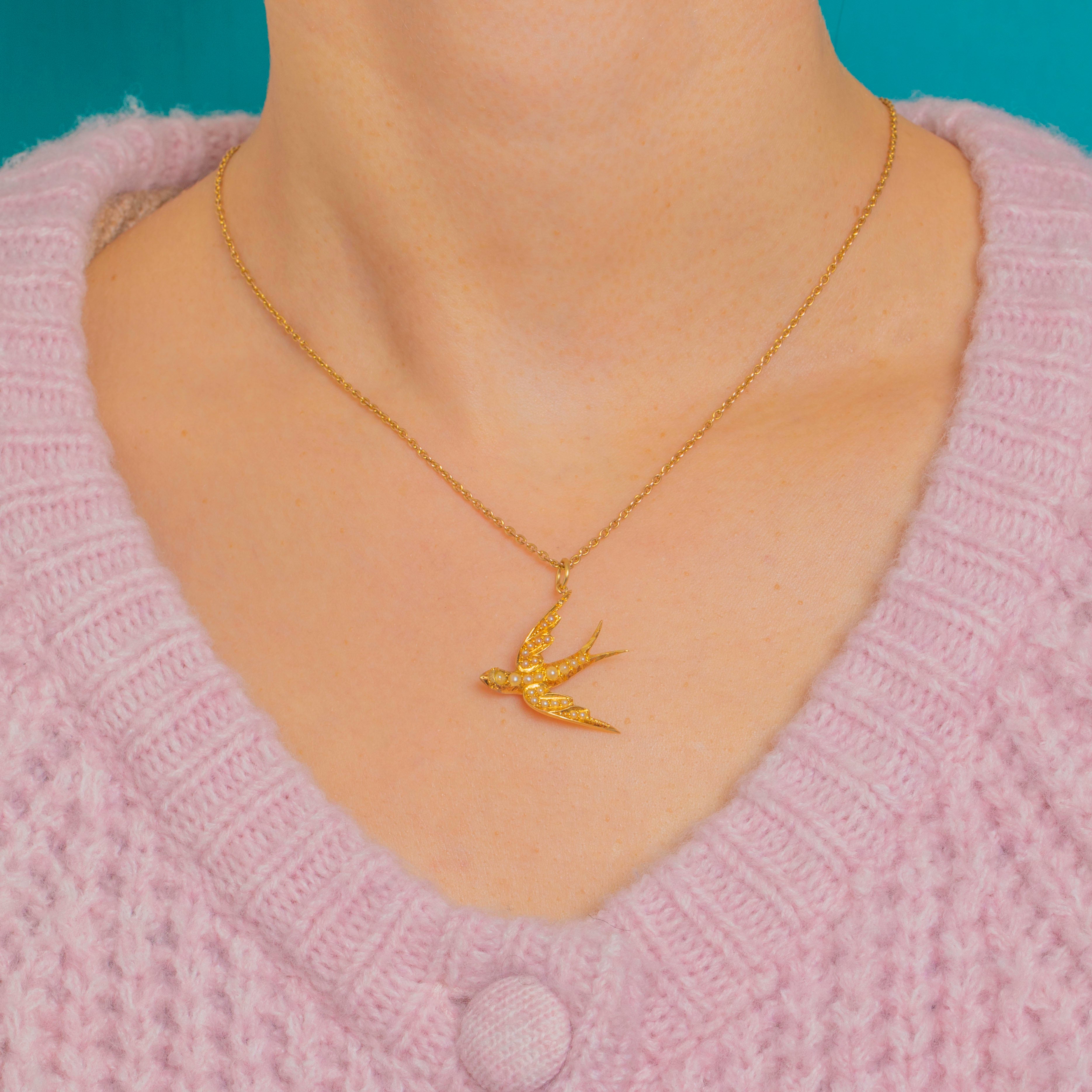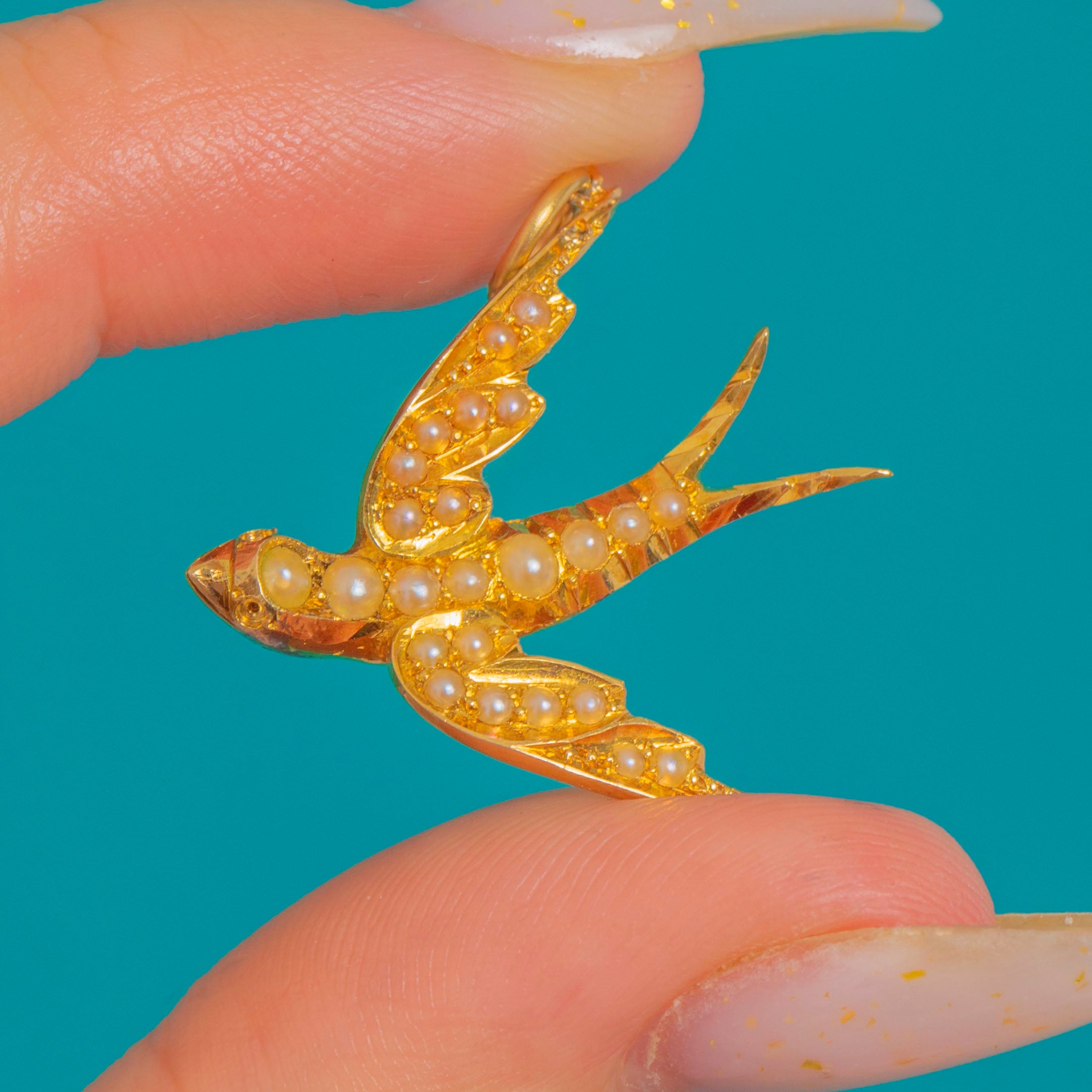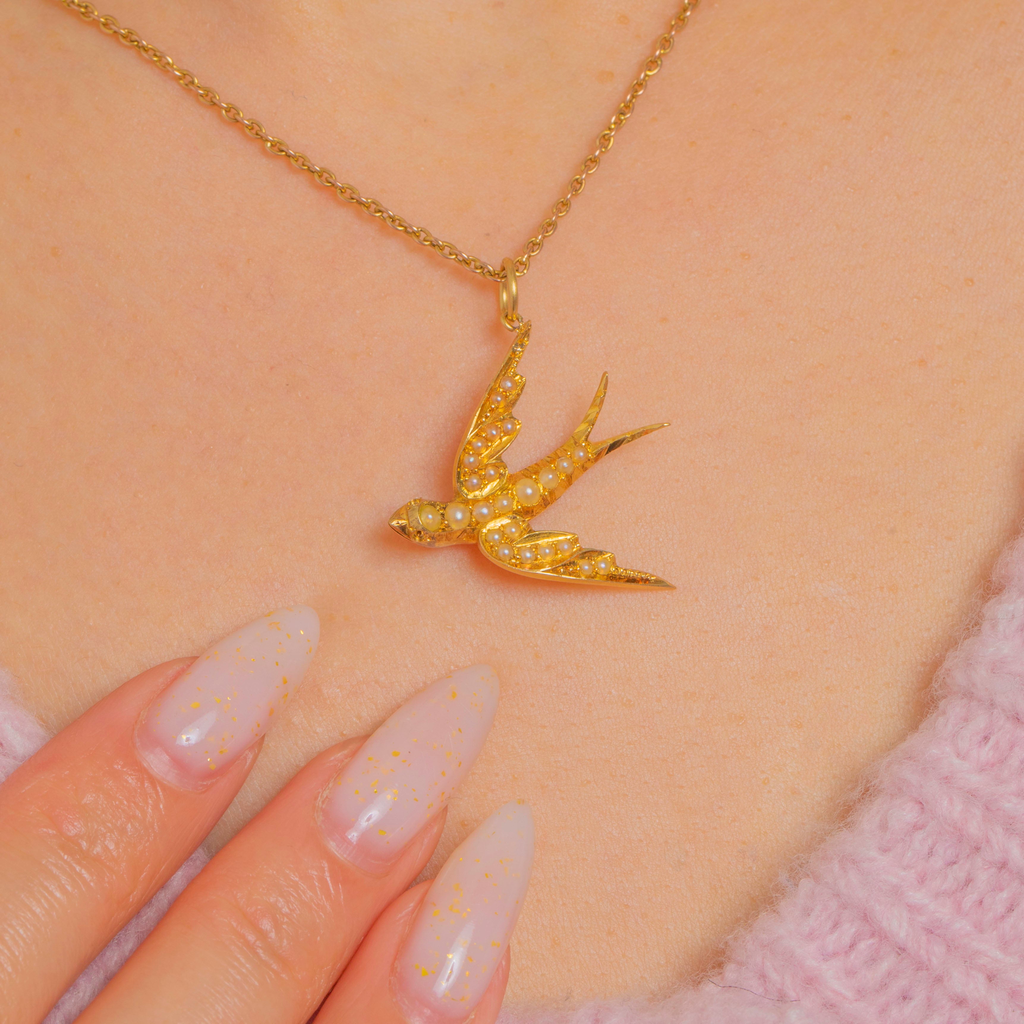 A graceful Victorian swallow charm crafted in glowing 18ct Gold, its outstretched wings and sleek body dotted with tiny creamy Pearls that lend a soft, romantic lustre. The silhouette is beautifully rendered with scalloped wing edges and fine feather and tail detailing for a delicate, light-catching finish.
