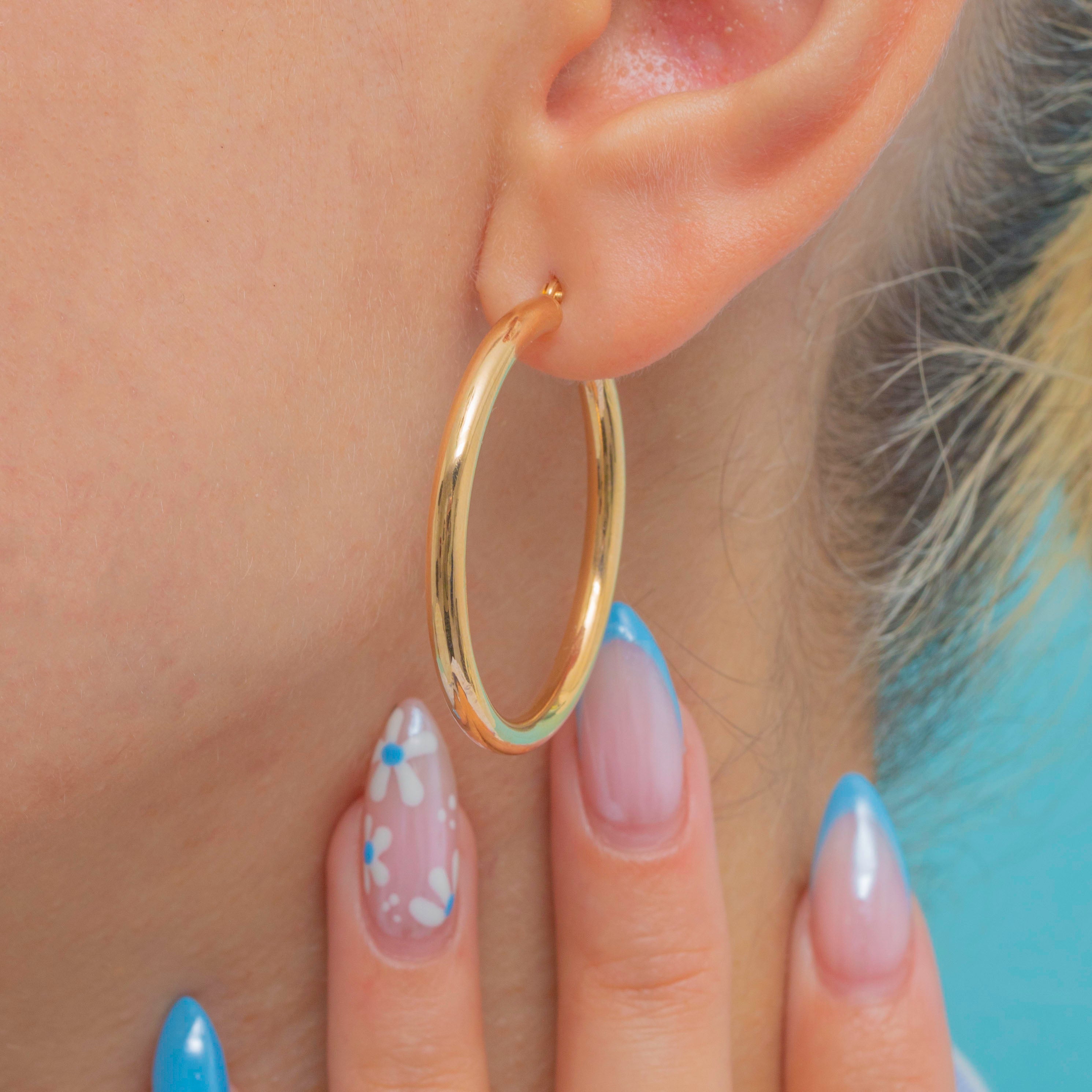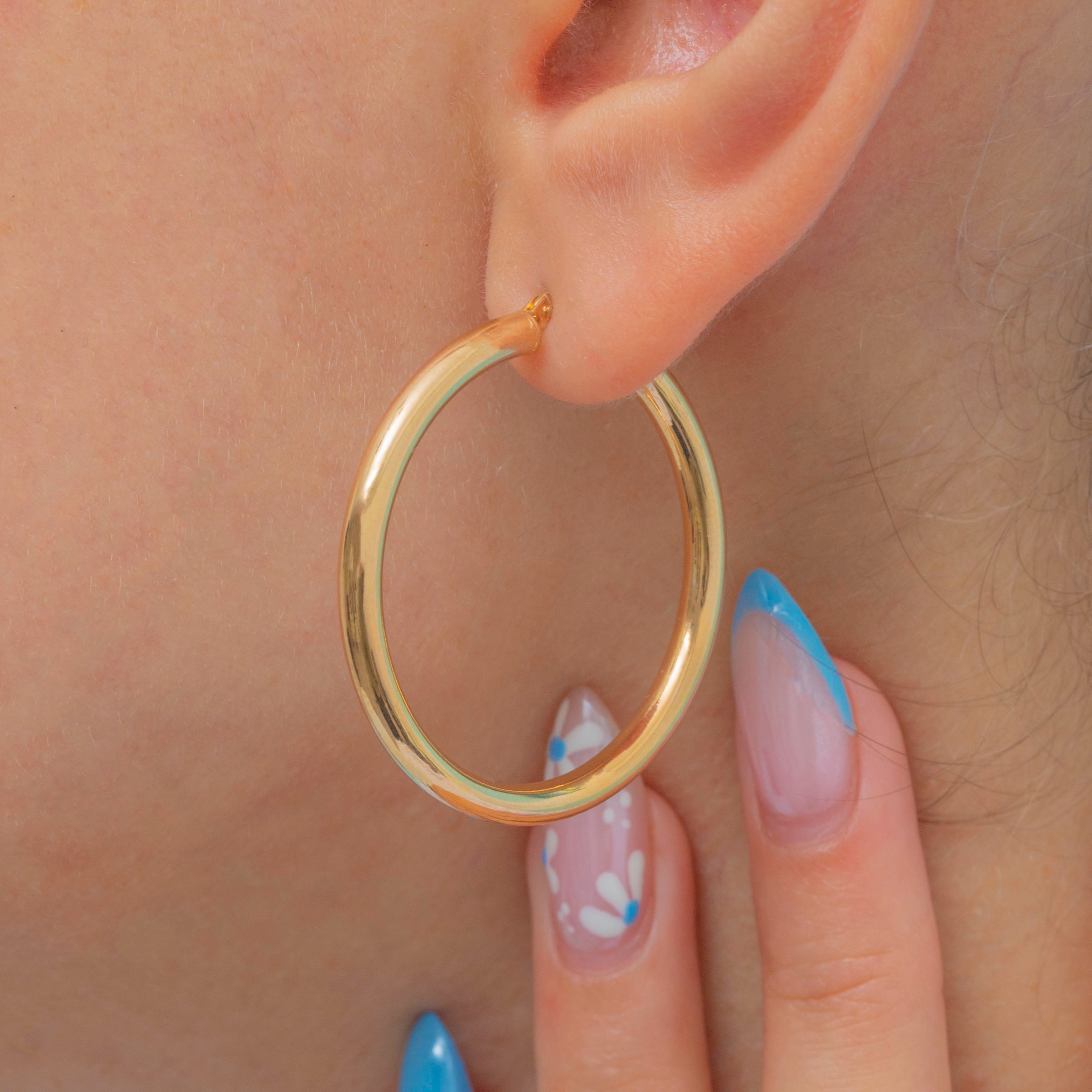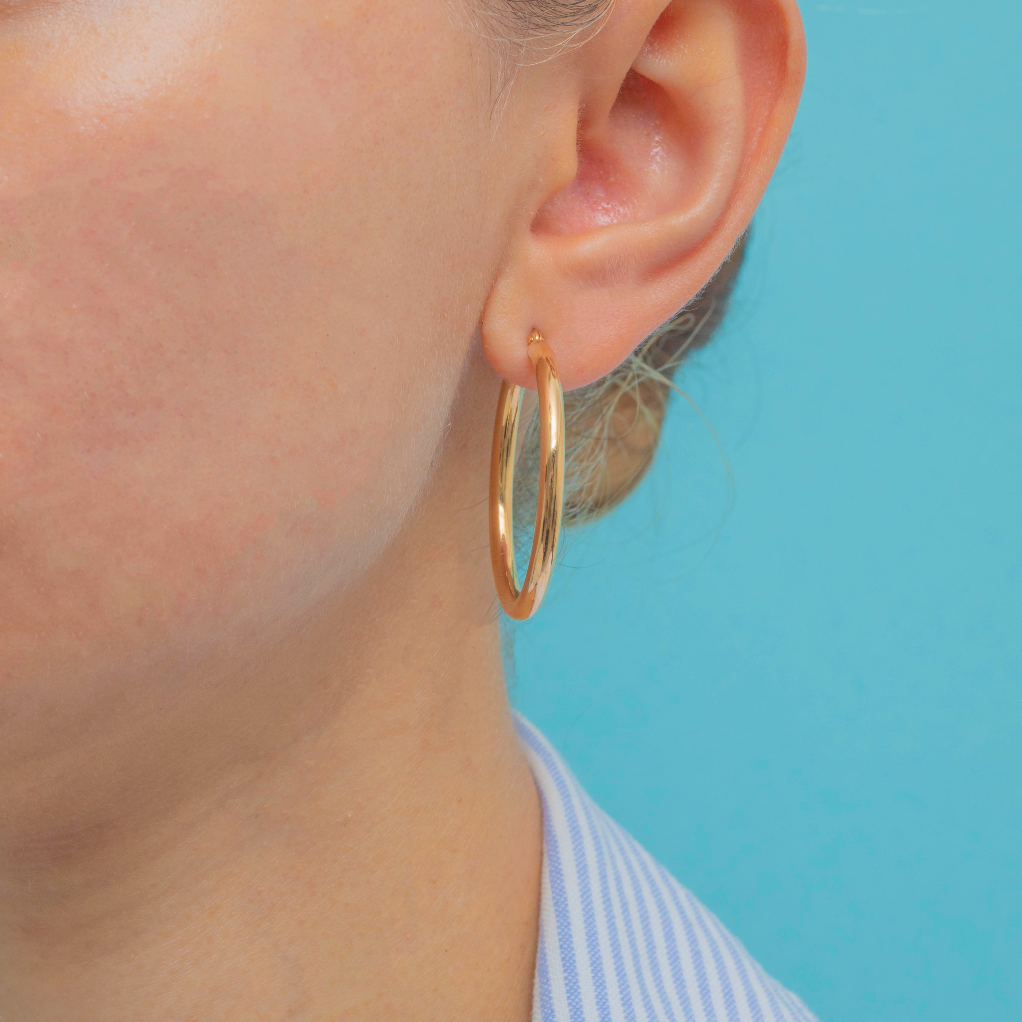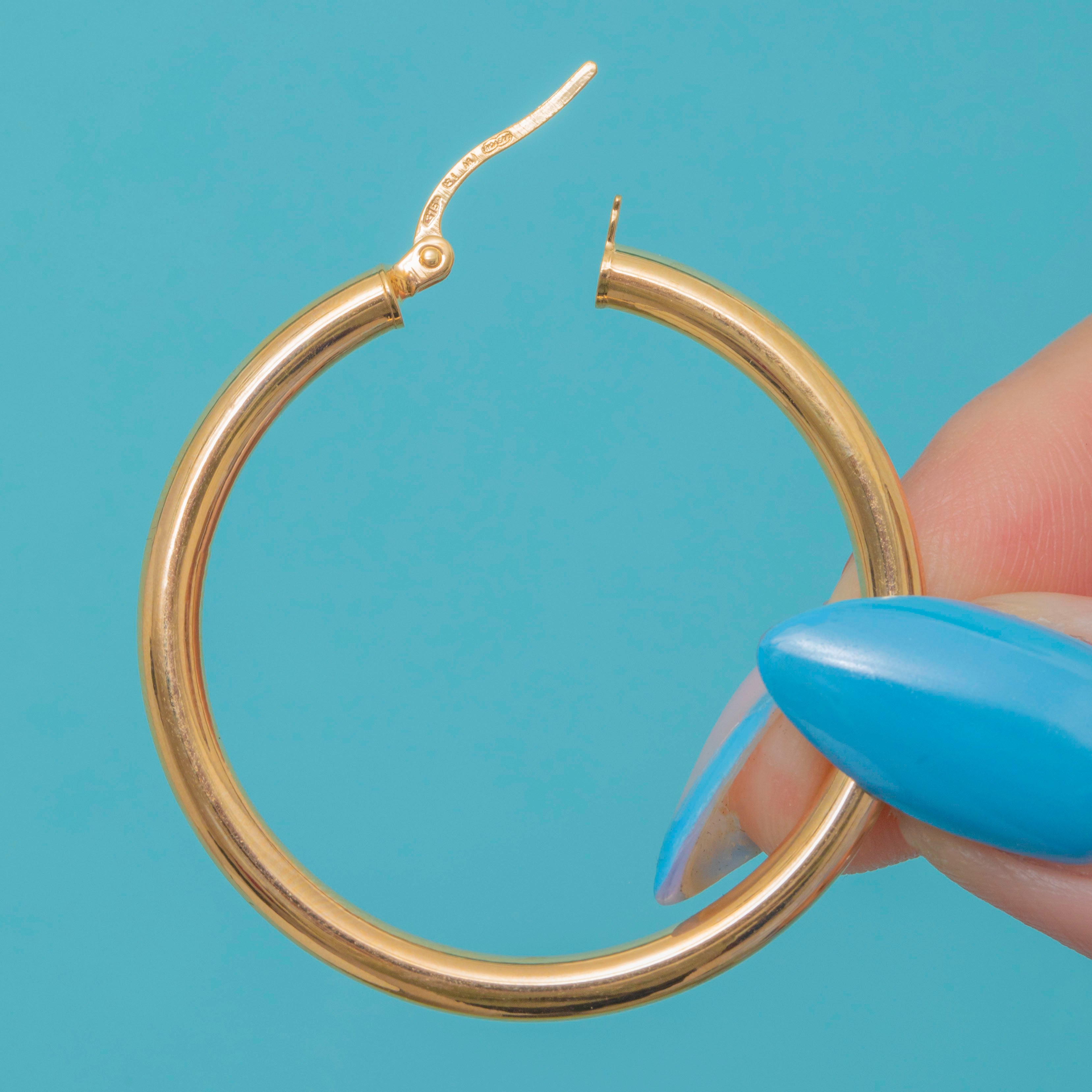 These large solid 9ct Gold hoop earrings are the perfect pair for all occasions. Crafted into a sleek and stylish design, their classic tube form provides a glossy surface that catches the light beautifully.