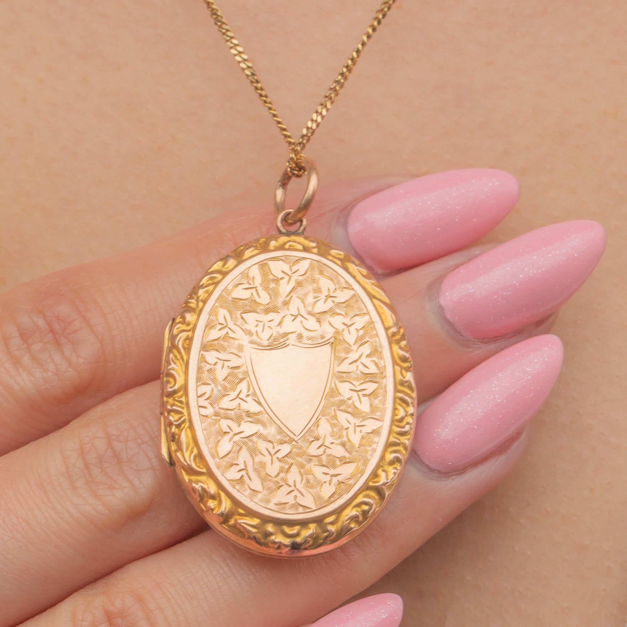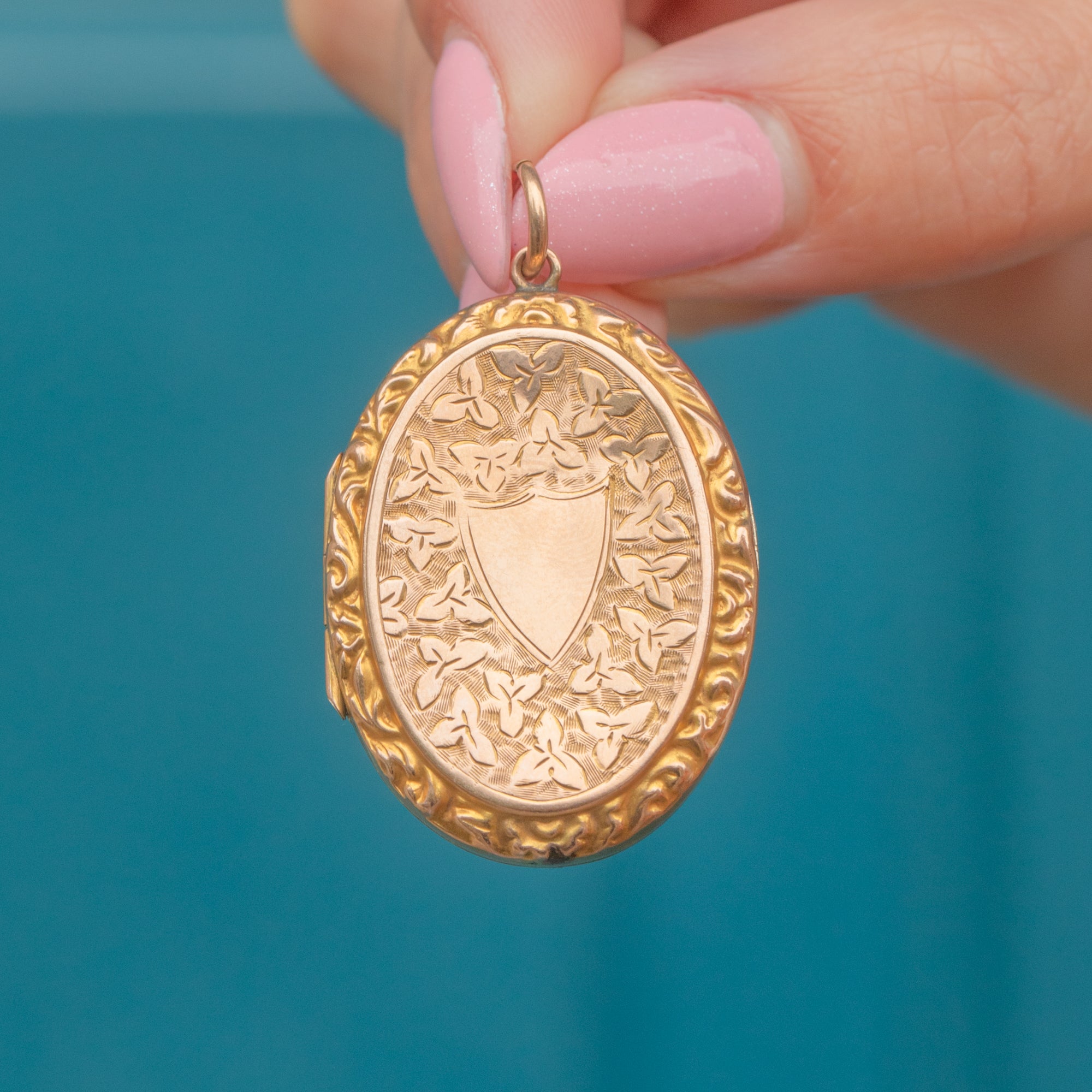 This large antique 9ct Gold engraved oval locket will make a charming addition to your collection! Symbolising everlasting love and friendship, this Victorian locket has been finely engraved with ivy leaves covering its entirety, and is framed by an exquisite repoussé border.