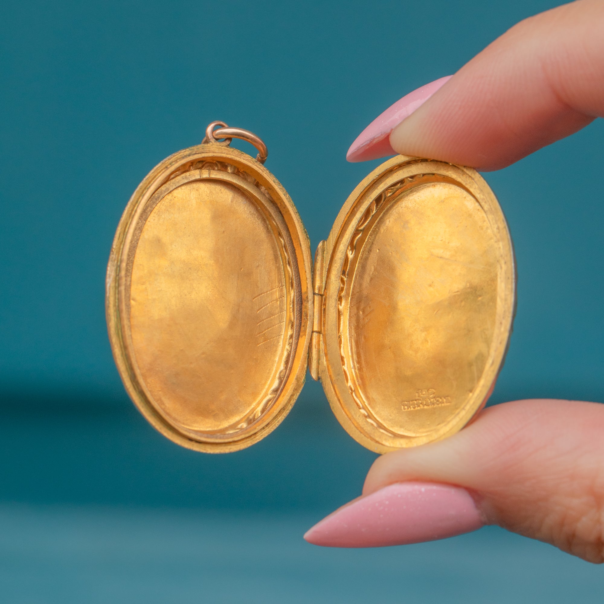 VERY GOOD-EXCELLENT: This large antique 9ct Gold engraved oval locket is in wonderful condition. The Gold is bright and buttery, and the engraved and repussé details have all remained crisp. There is minor wear inside the locket, including some scratches and discolouration, however, once your chosen photographs have been inserted, this won't be visible. The locket closes securely, allowing you to use and wear this antique Gold locket with absolute confidence!