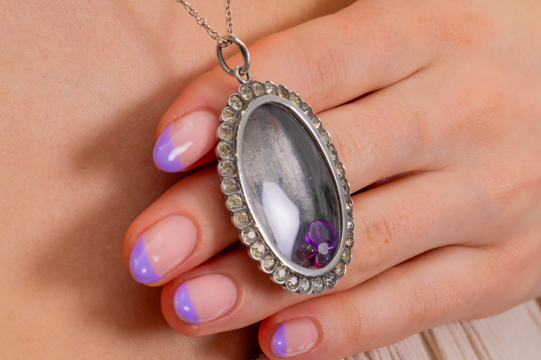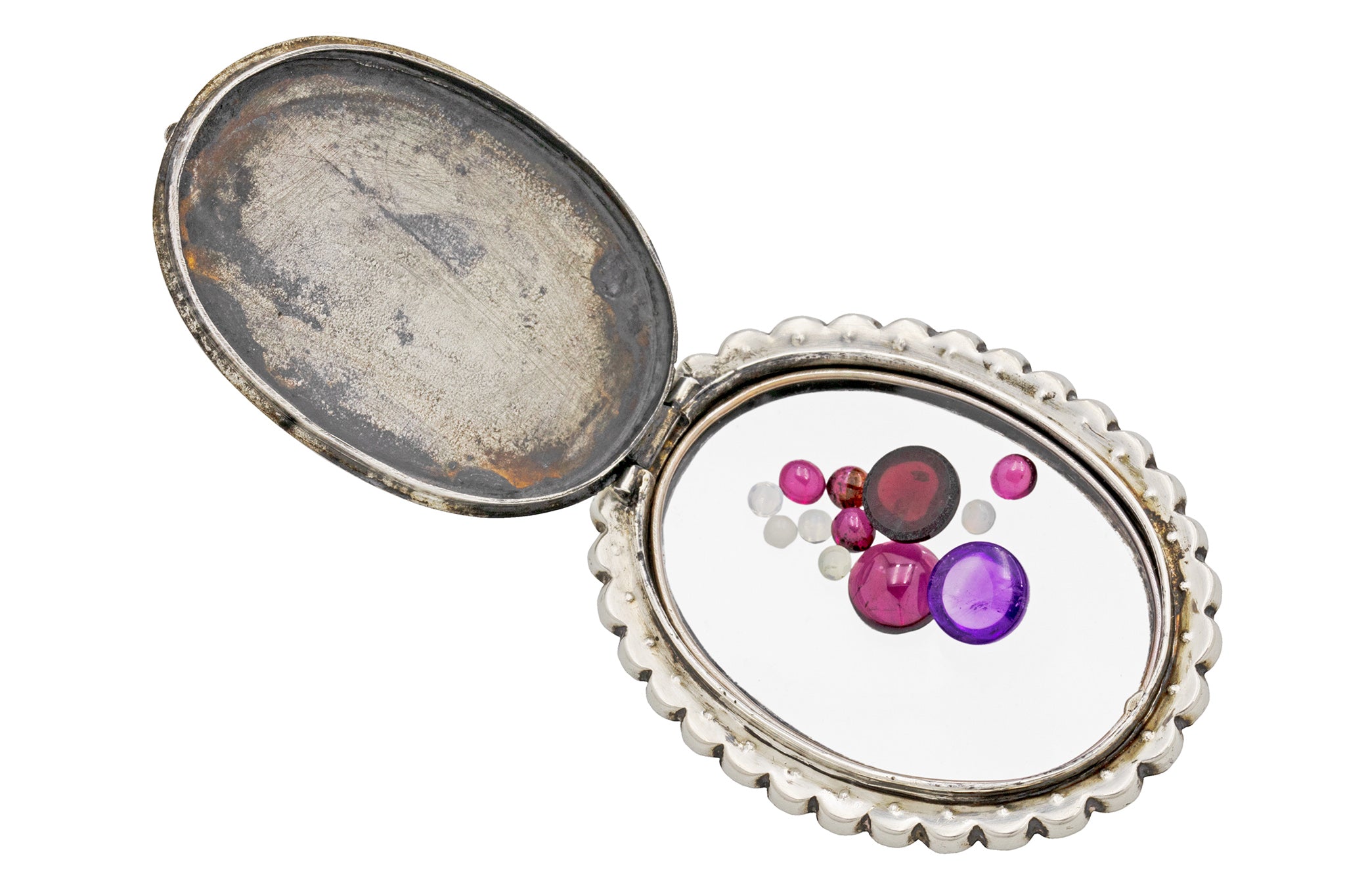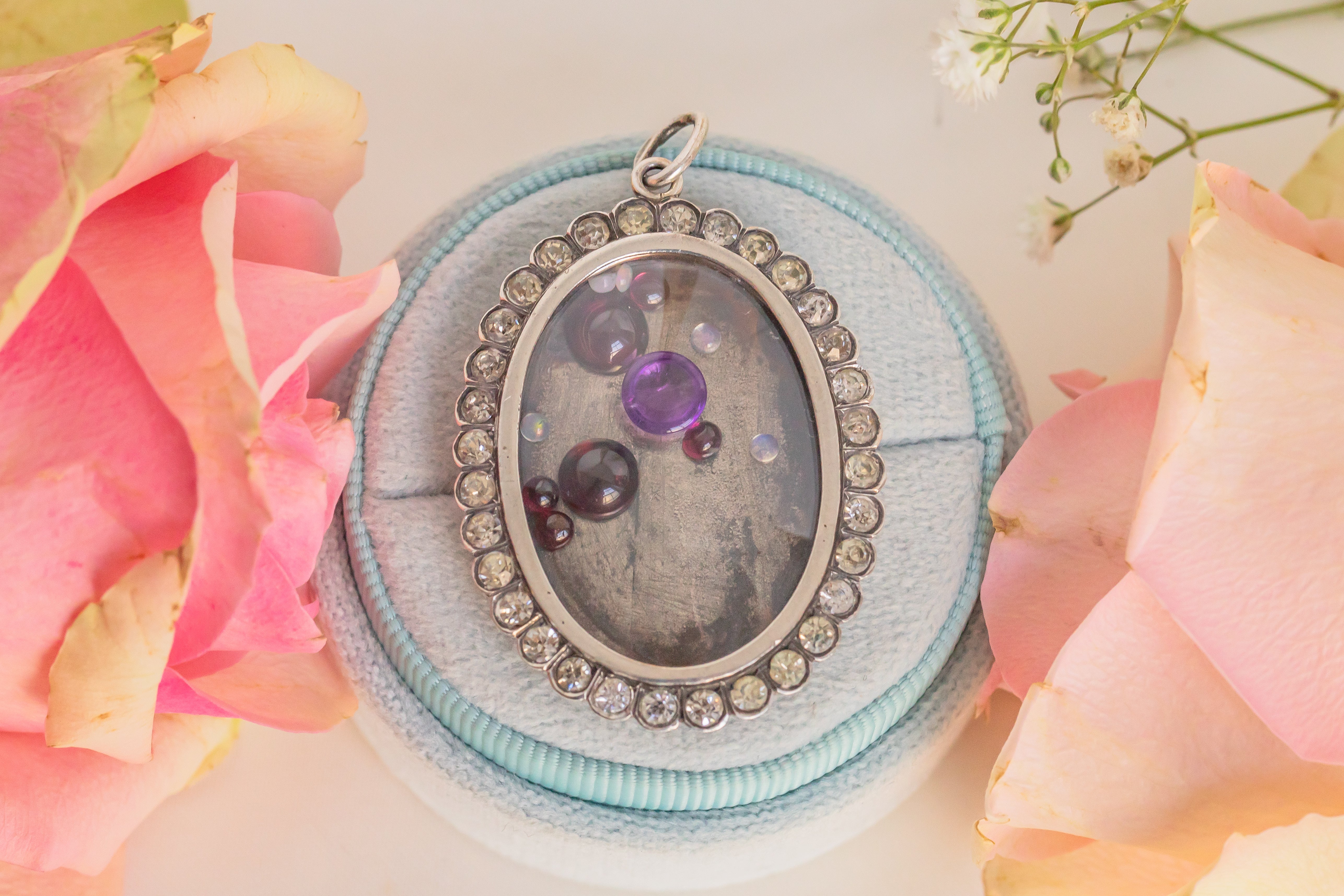 Inside a party of Amethyst, Garnets and Opals freely dance around, with the opportunity for you to add your own juicy gemstones inside too! With this Edwardian Silver locket carrying such beauty combined with her large size, she is bound to make a statement as she adorns your neck.