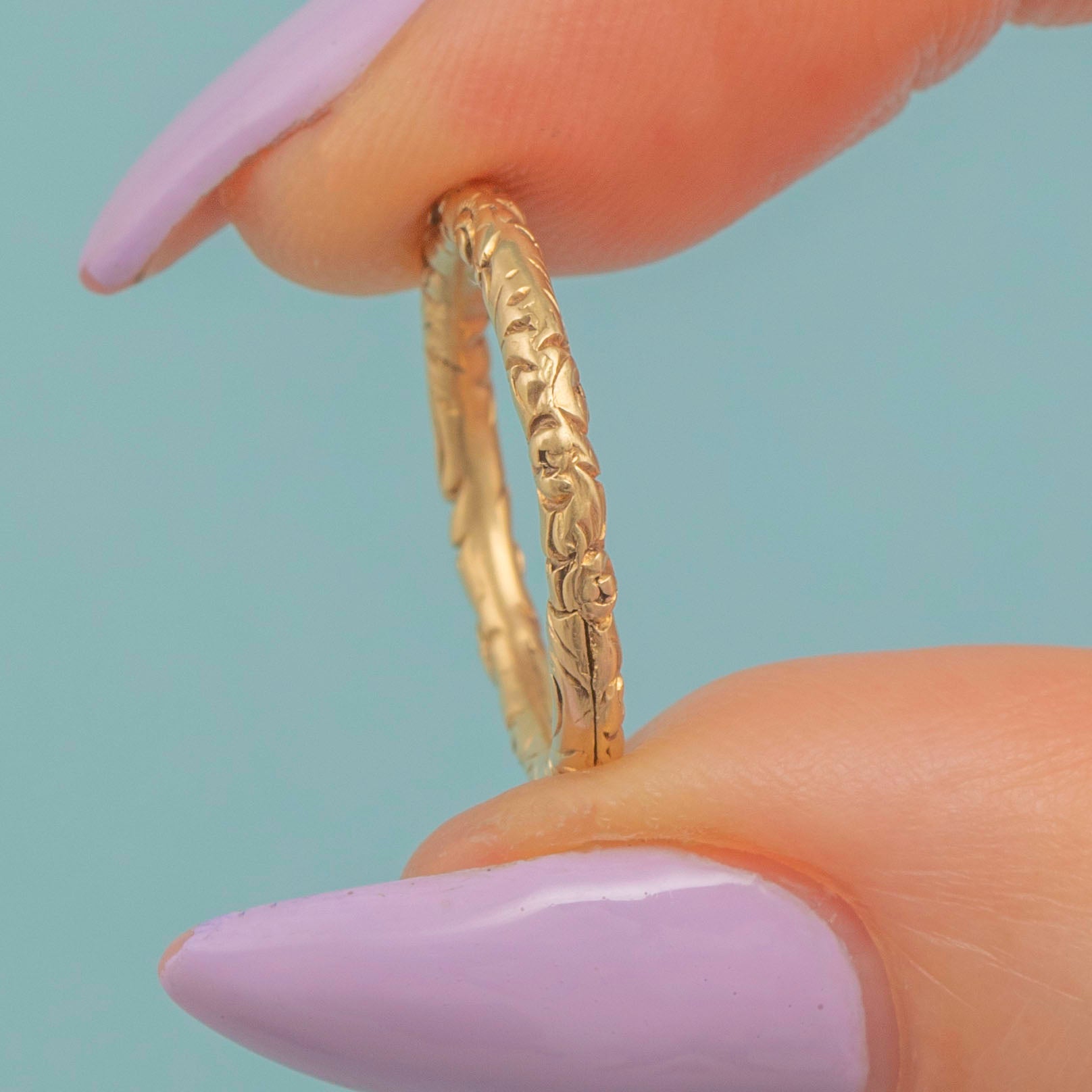 EXCELLENT. This late Georgian 15ct Gold engraved split ring is in fabulous condition! Her engravings catch the light beautifully, and she is a great size to add either one singular piece or a few small charms. The Gold has a lovely saturation and will make a luxurious addition to your collection!