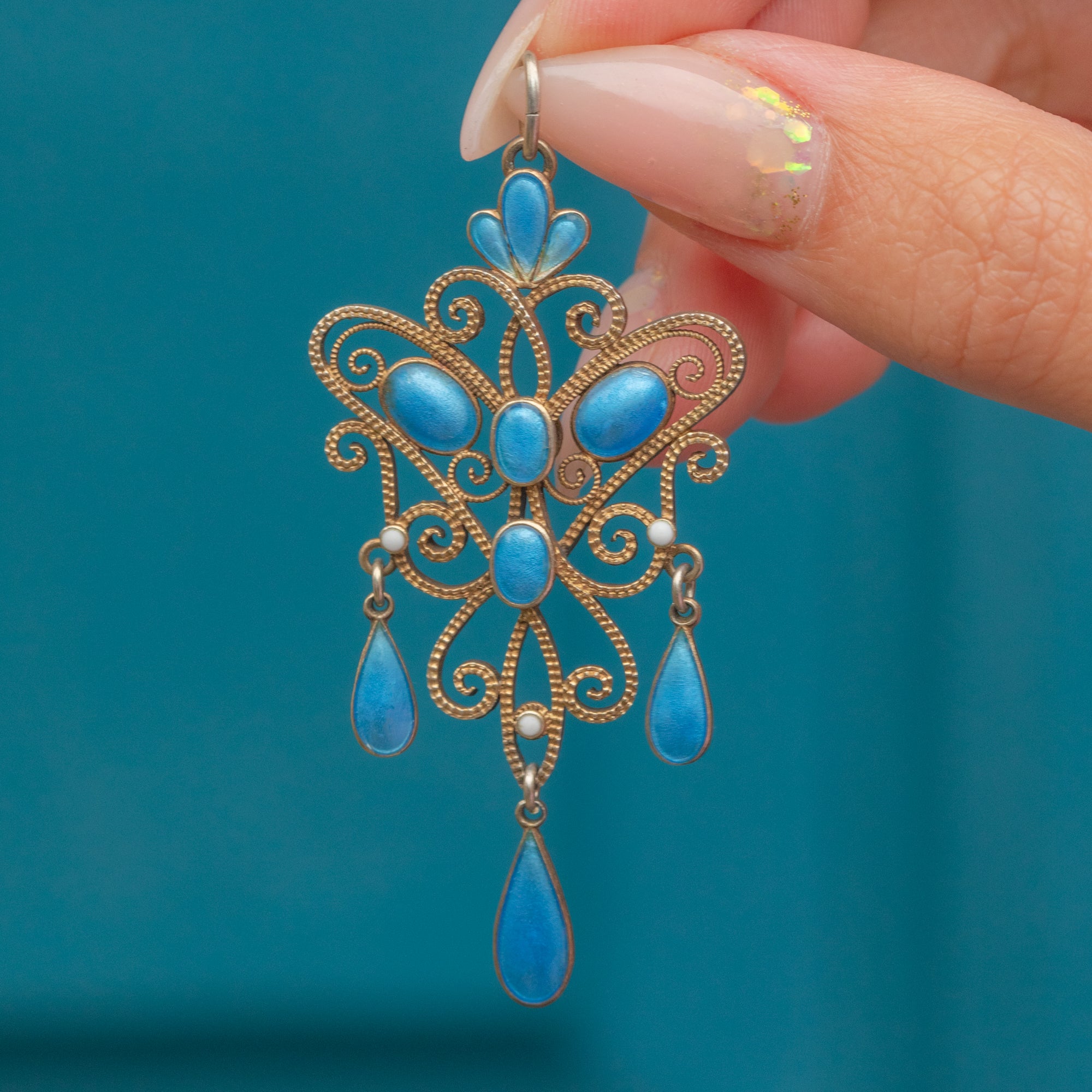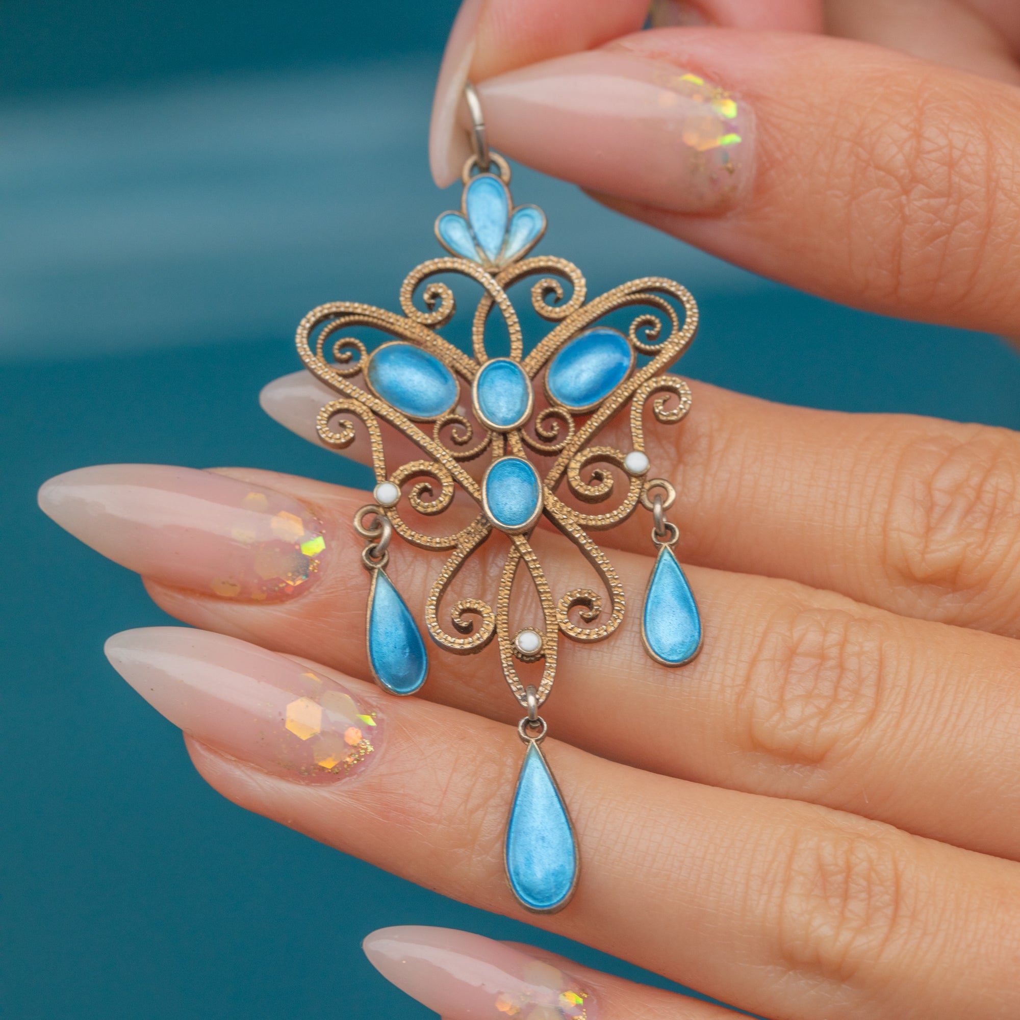 This striking Norwegian pendant is the work of renowned jeweller Marius Hammer, crafted in gilded Silver and decorated with vibrant blue Enamel. The design showcases Hammer’s mastery of filigree openwork, with scrolling details and delicate drops that create wonderful movement when worn.