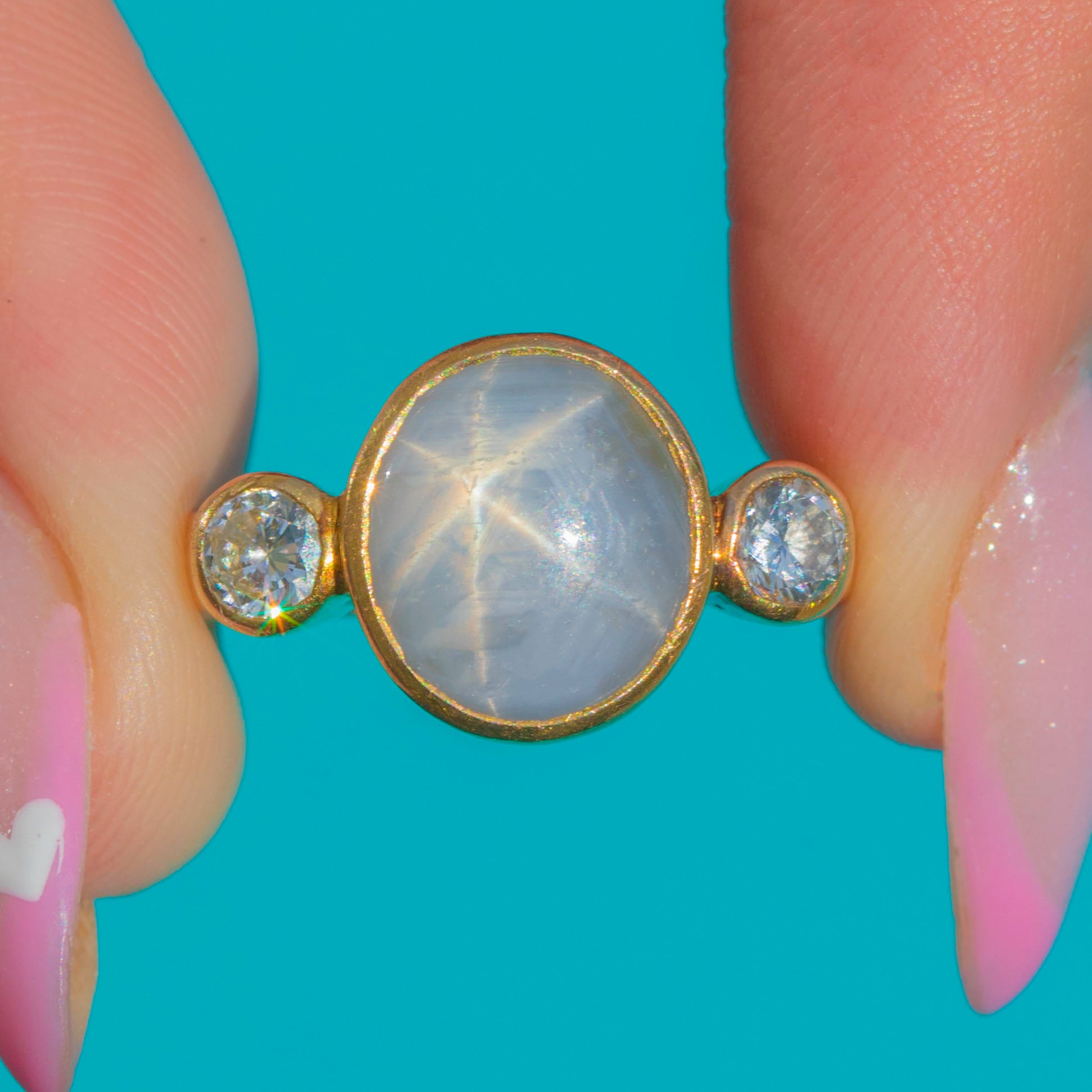 EXCELLENT: The Star Sapphire is beautifully polished with a sharp six-point star visible under direct light. The Diamonds are bright, securely set, and well-matched. The Gold retains a high polish with minimal signs of wear. A striking Mid-Century ring in superb condition.