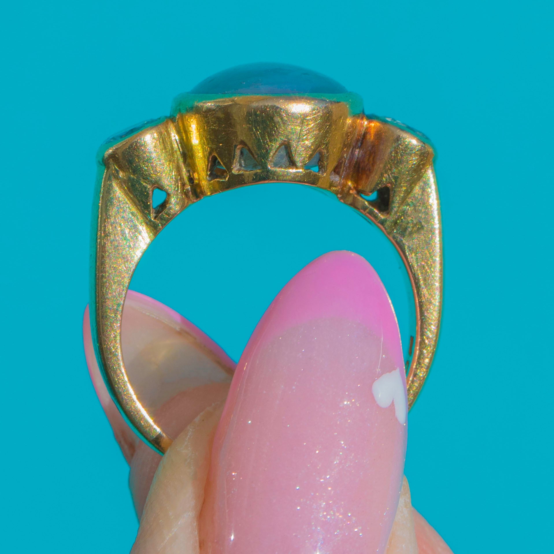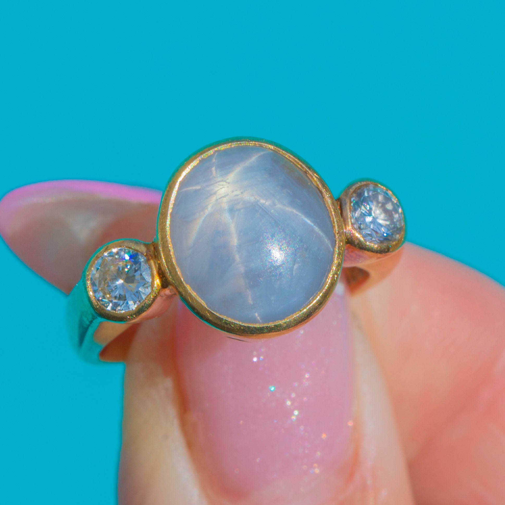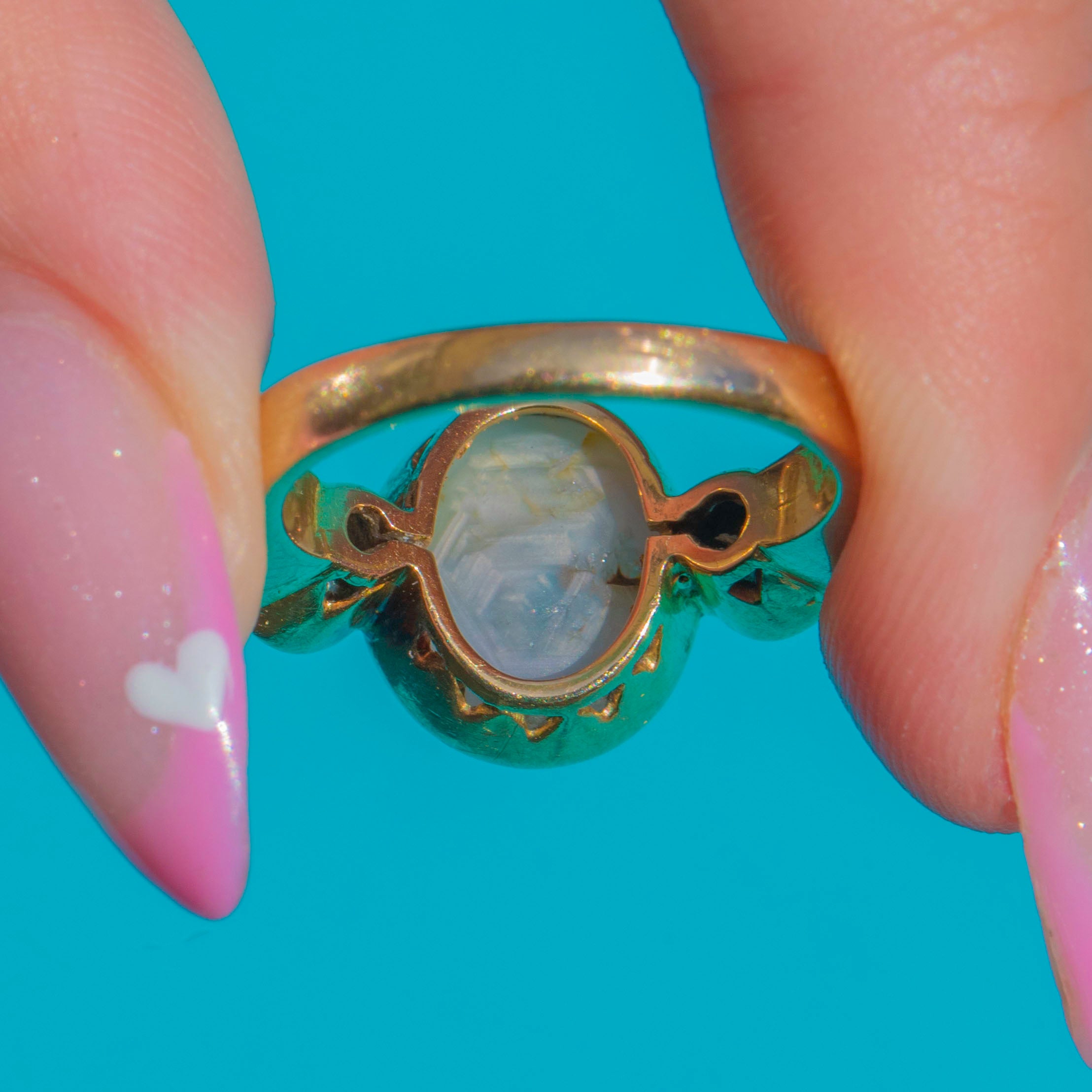 This beautiful Art Deco ring is set with a luminous Star Sapphire, displaying a distinct six-rayed asterism that shimmers across its surface in the light. Flanked by two bright brilliant-cut Diamonds, the cabochon’s soft blue tone and golden setting create a classic and elegant composition typical of 1940s design.