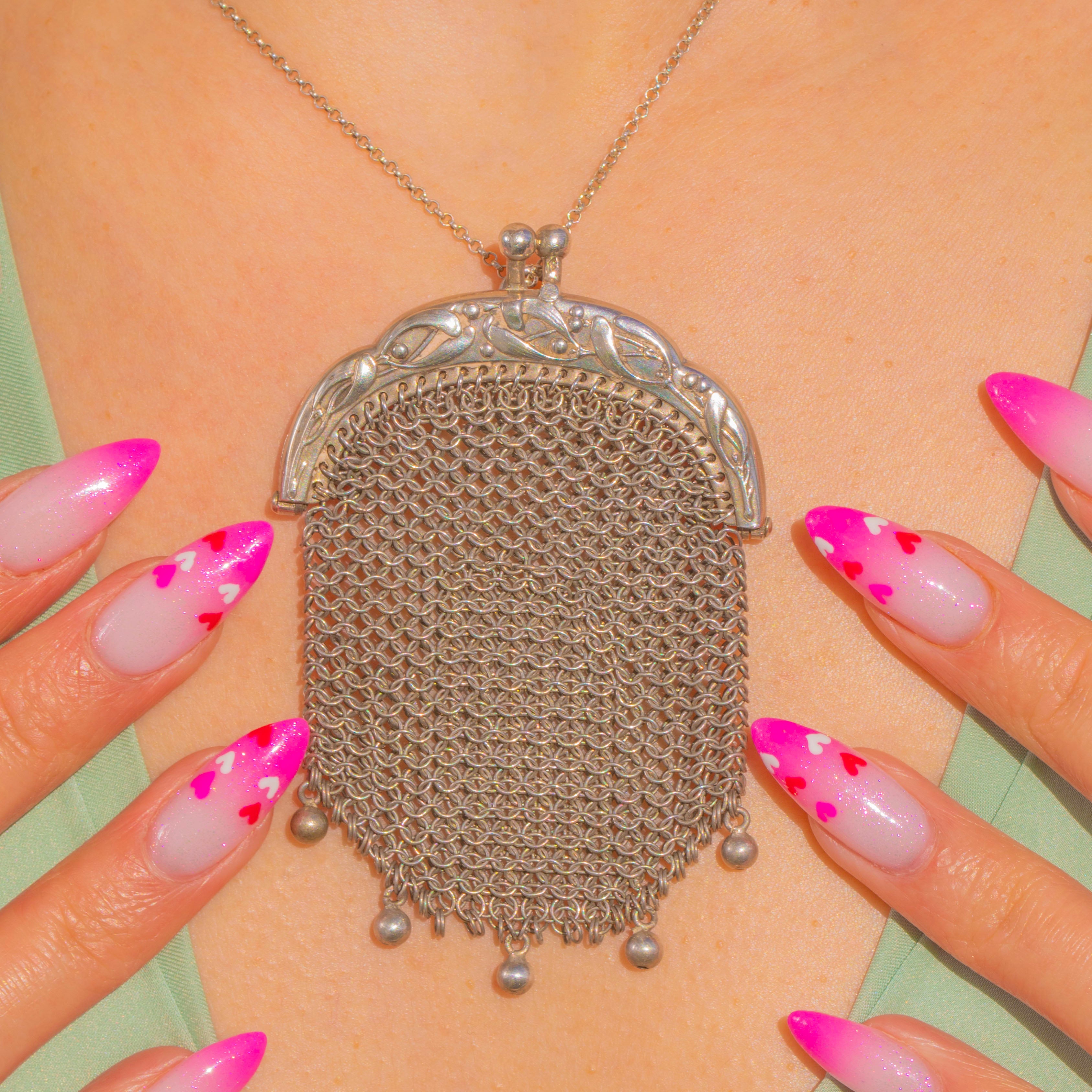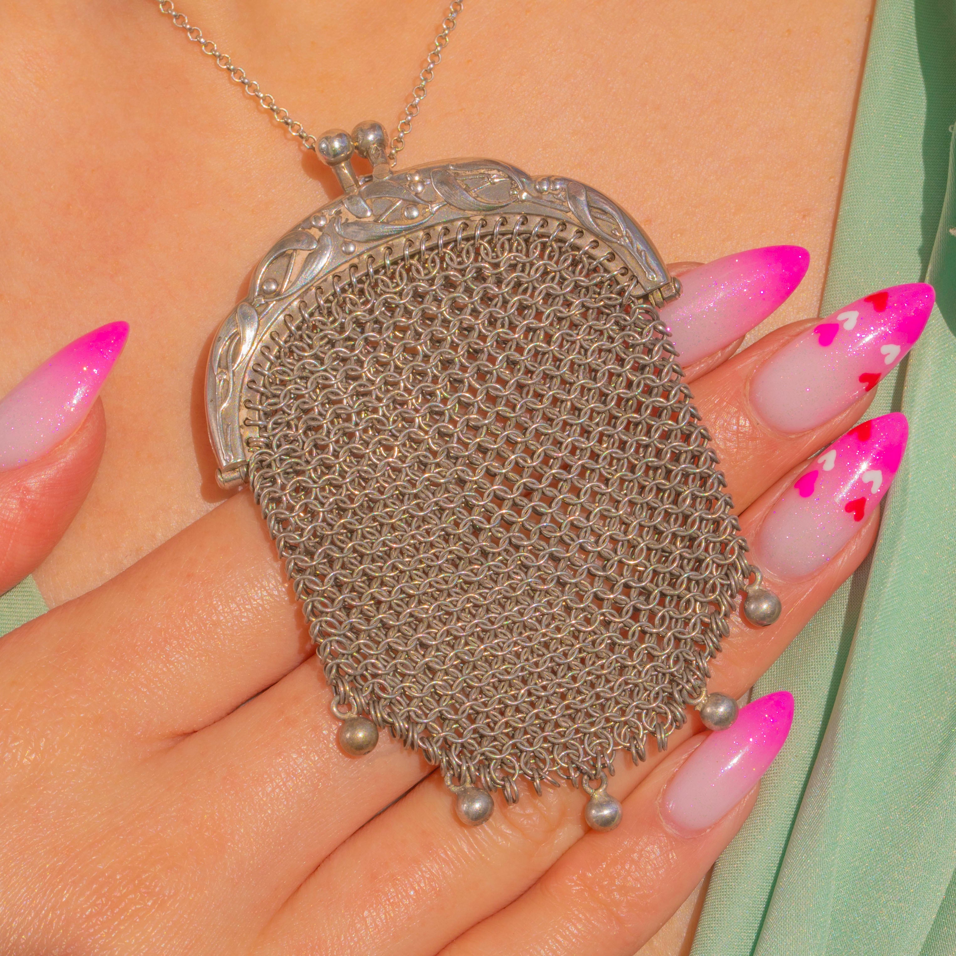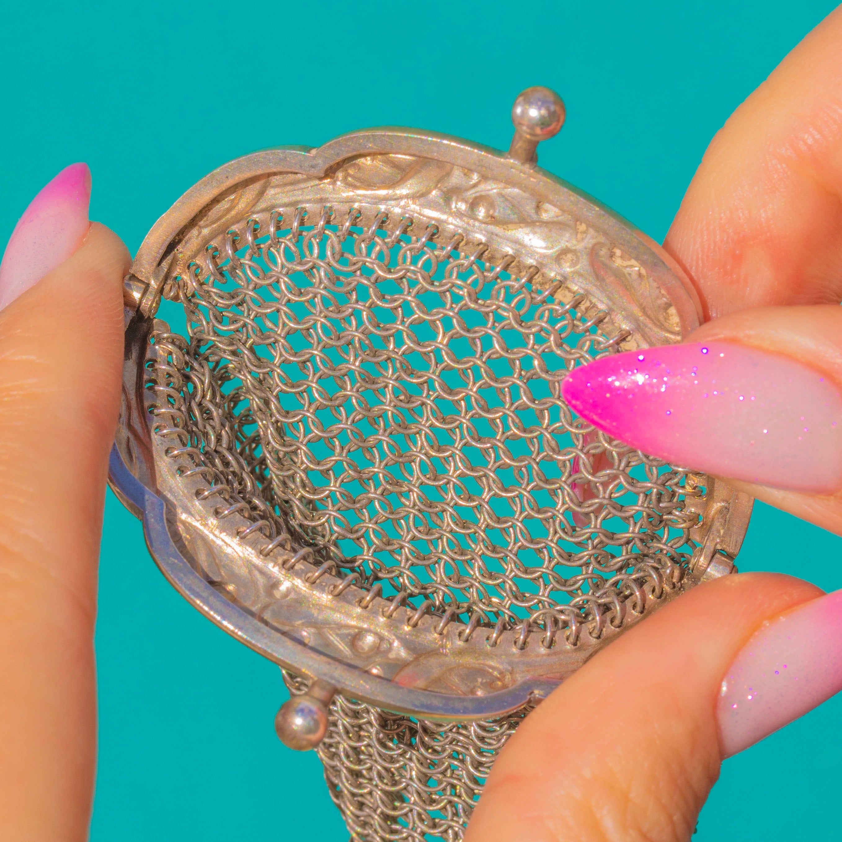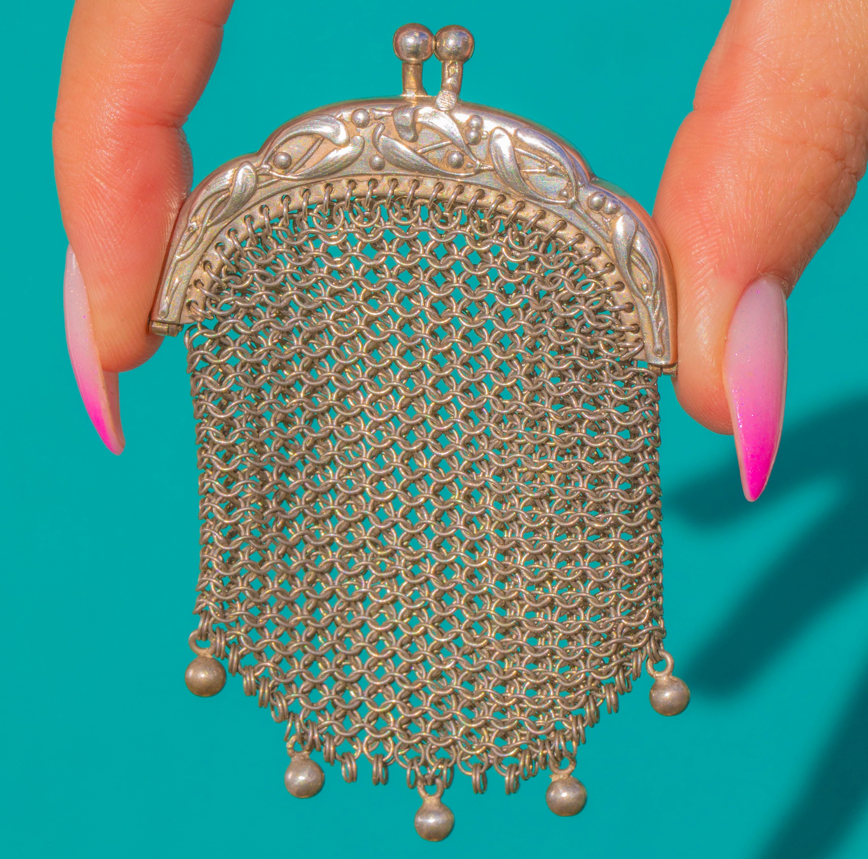 A captivating French Art Nouveau miniature mesh purse pendant in 800 Silver, adorned with beautifully crisp repoussé Mistletoe across its curved frame. The fine, textile-like mesh drapes fluidly from the hinged top, finishing in a charming fringe of five Silver bead drops that sway with movement. A classic twin‑ball kiss‑lock crowns the design, marrying utility with romantic ornament.