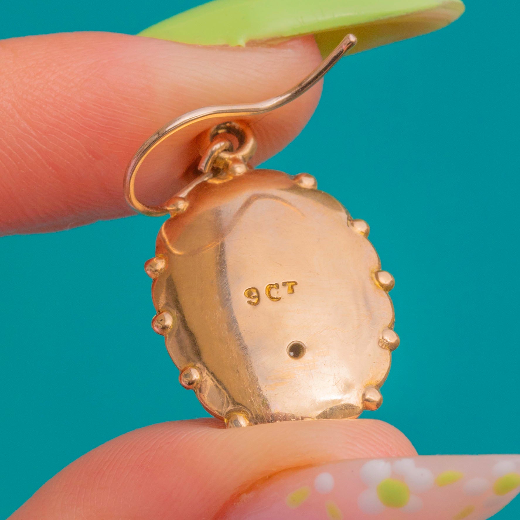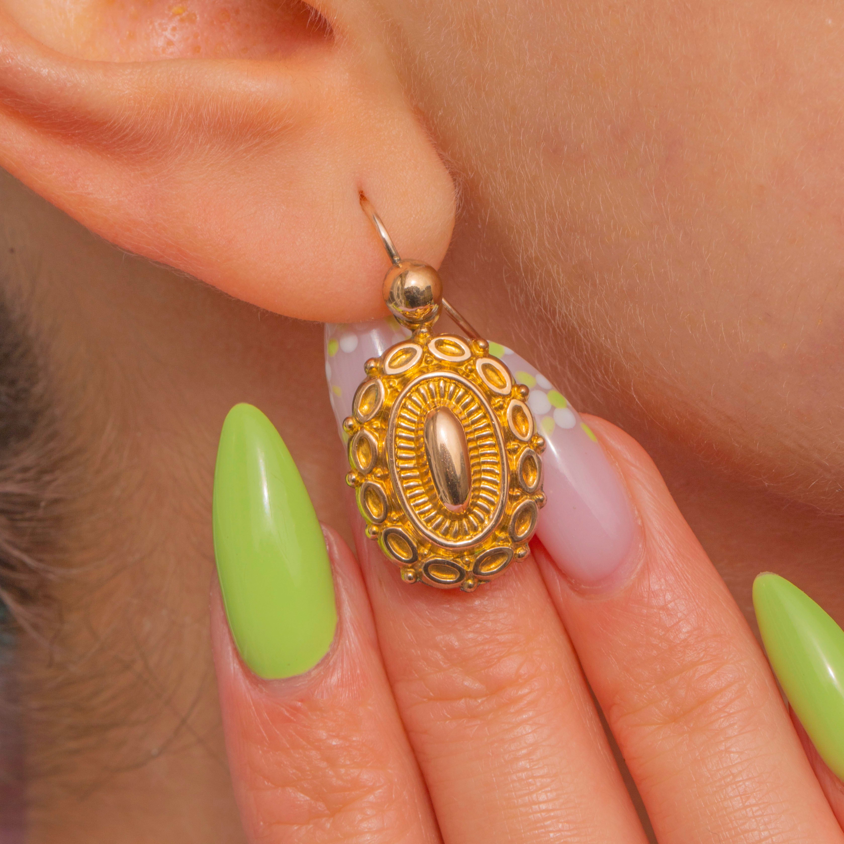 Ornate and effortlessly wearable, these Antique 9ct Gold drop earrings capture the romance of the Victorian era. Each medallion is richly detailed with a domed central oval, radiating sunburst ribbing and a border of tiny beaded accents, creating a beautiful play of light across the softly contoured surfaces.