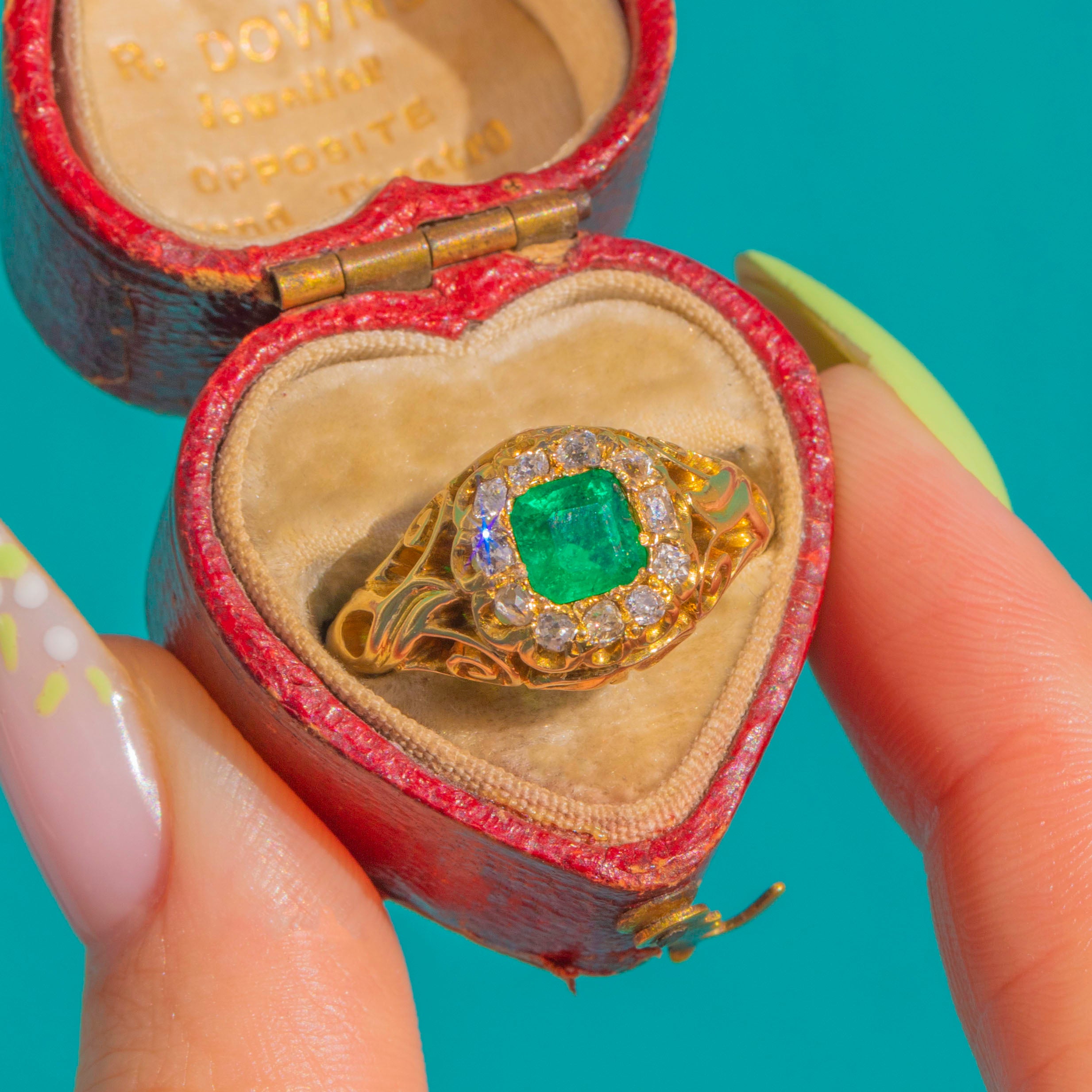 At the heart sits a square-cushion Emerald of approximately 0.60cts , encircled by eleven bright round Diamonds totalling approximately 0.22ct. The warm glow of the Gold amplifies the Emerald’s lush hue and the Diamonds’ scintillation, creating a beautifully decorative piece brimming with Victorian romance.