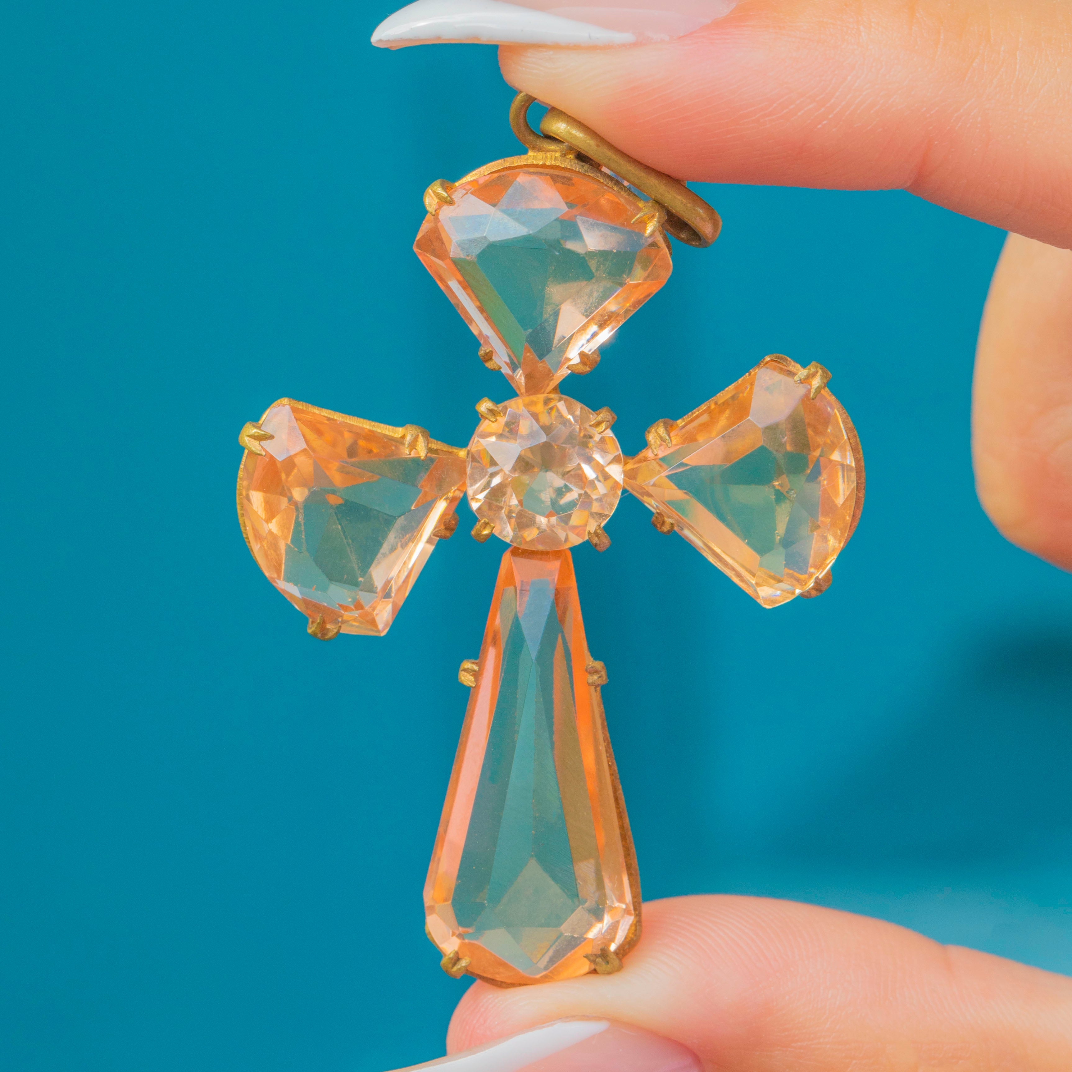 A striking Antique Victorian cross pendant, c.1850, set with glowing peach-coloured Paste gemstones. The gemstones are beautifully cut and foiled to catch the light, radiating a warm golden-orange tone that is both rare and eye-catching. Each stone is securely claw-set in a base metal frame, showcasing the skilled craftsmanship of the period.