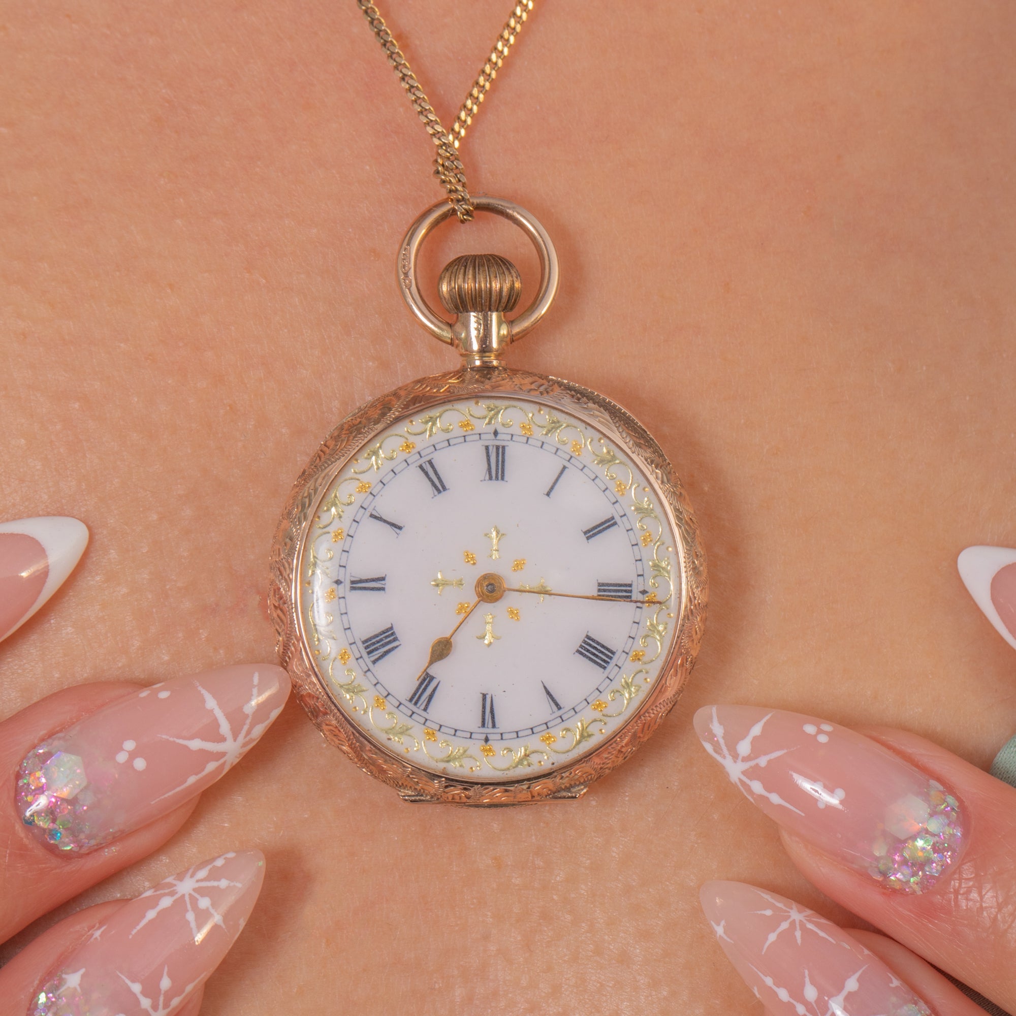 This exquisite Post-Edwardian pocket watch pendant dates to 1912 and is full of early 20th-century charm. The white Enamel dial features crisp Roman numerals and tiny golden flourishes, giving it a delicate, refined aesthetic. The warm 9ct Gold case is beautifully engraved with ornate foliate patterns, catching the light with every movement.